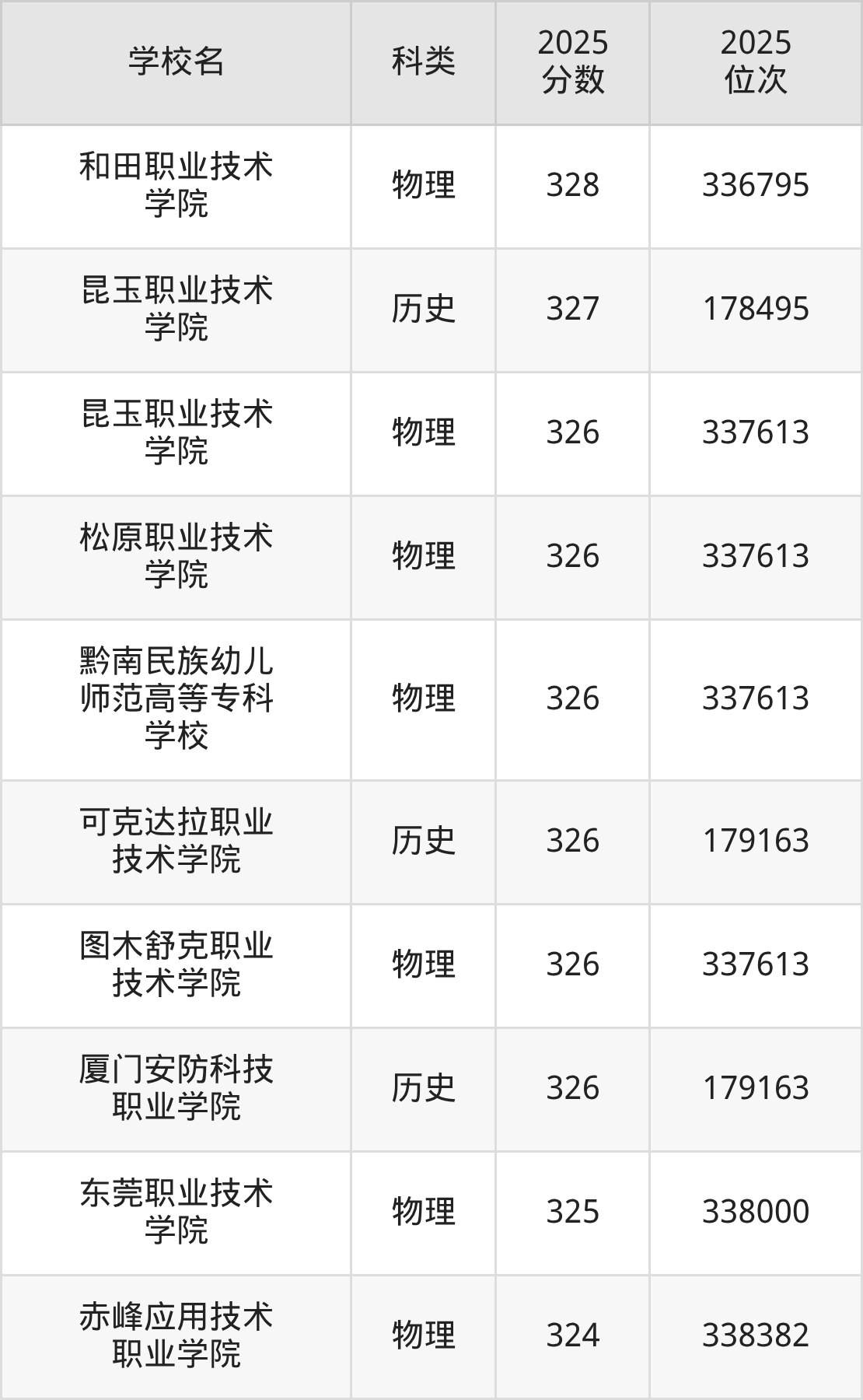 除上述院校外,339分可上的公办专科学校还有阿勒泰职业技术学院(334分,位次173665名)、图木舒克职业技术学院(326分,位次337613名)。