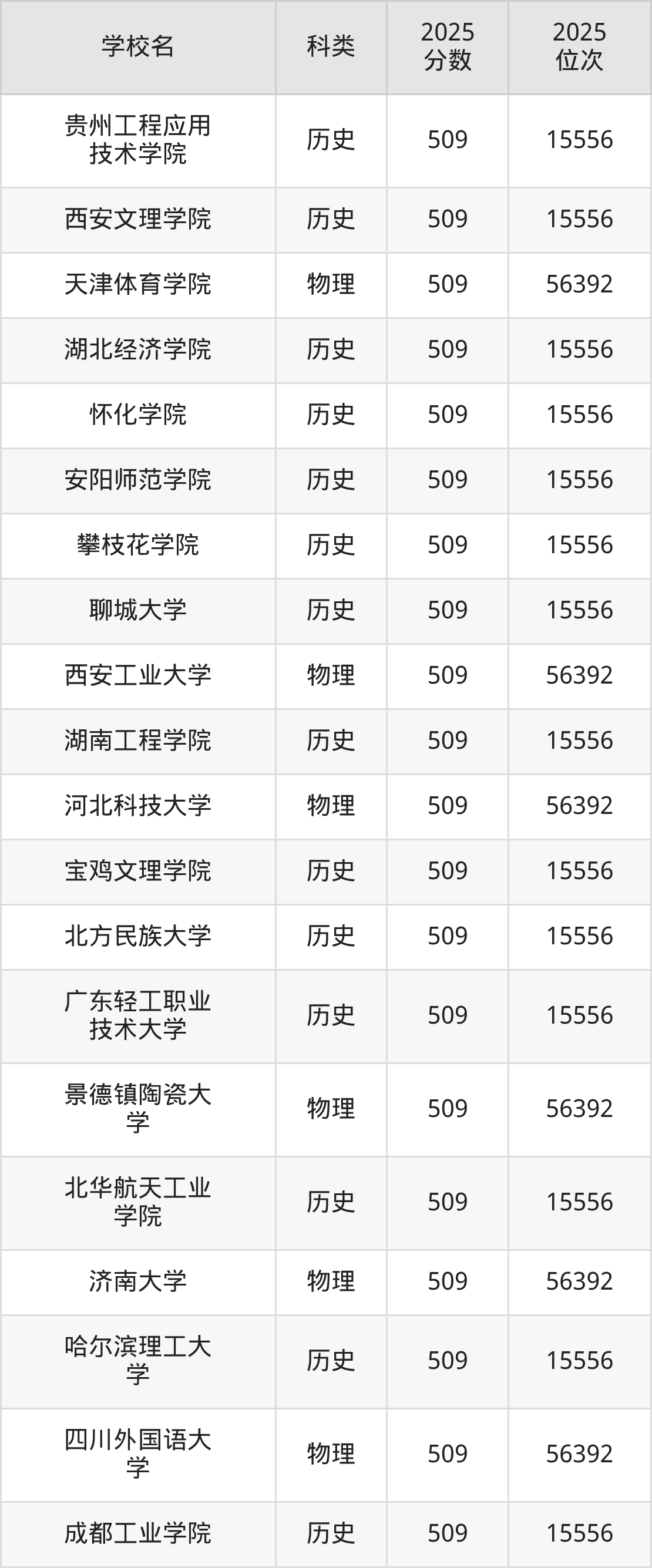 2025年贵州物理类本科线为387分,510分能上的本科大学共计886所,其中公办大学录取位次排名最低的是贵州财经大学(388分,位次157172名),即代表考生省排名位次在157172名及以内就可以报考公办本科。