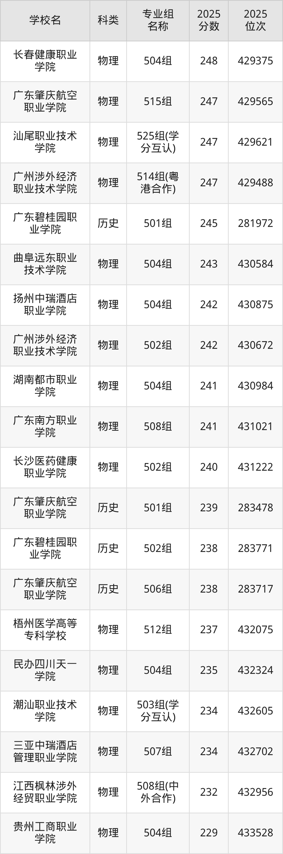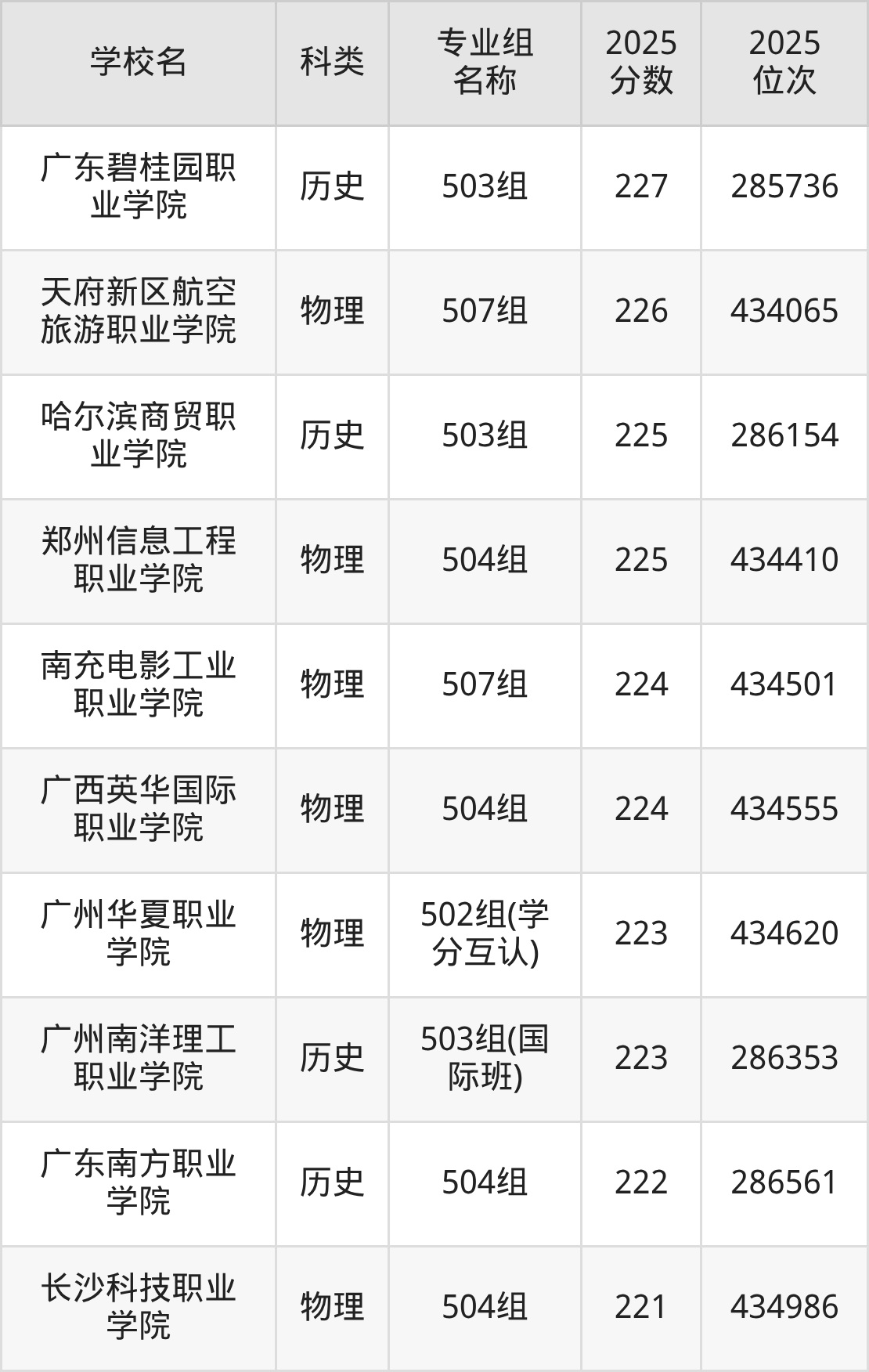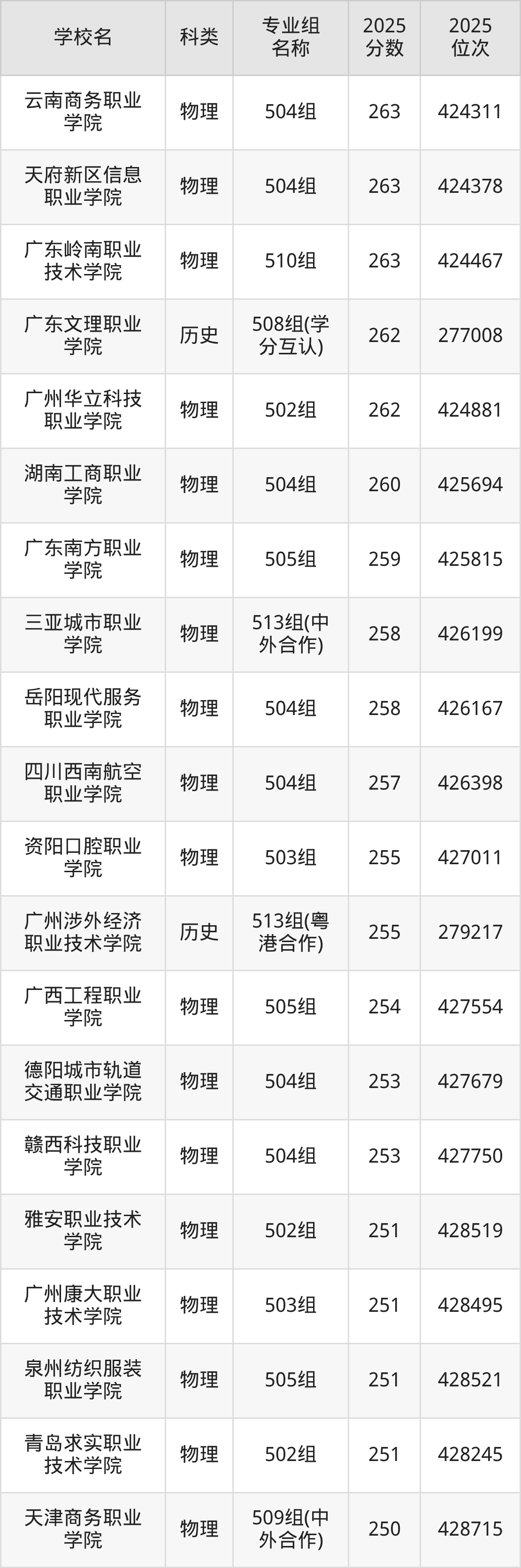 2025年广东历史类专科线为215分,263分能上的专科学校共计12所,其中民办大学录取位次排名最低的是广东文理职业学院(501组215分,位次287501名),即代表考生省排名位次在287501名及以内就可以报考民办专科。