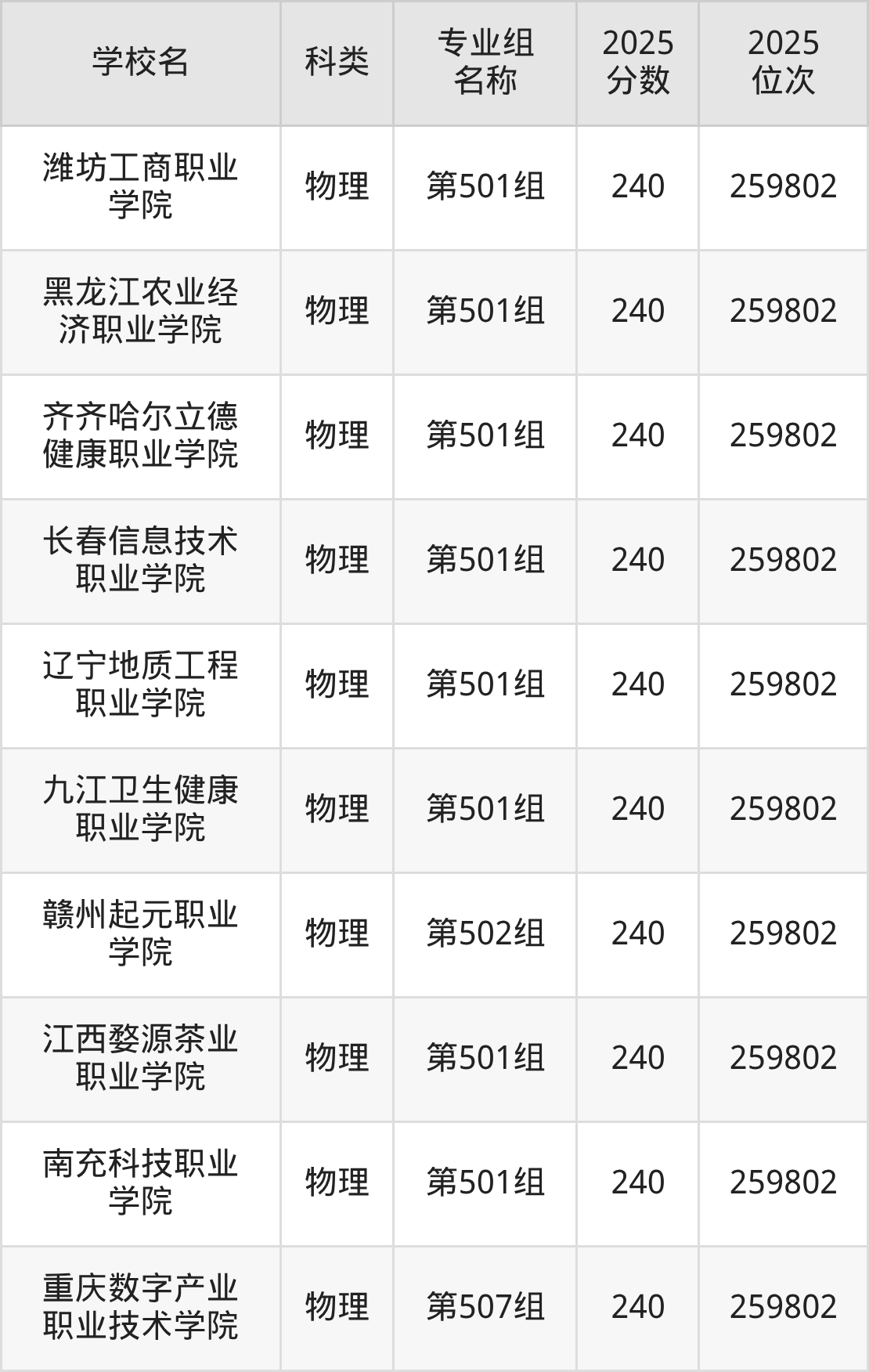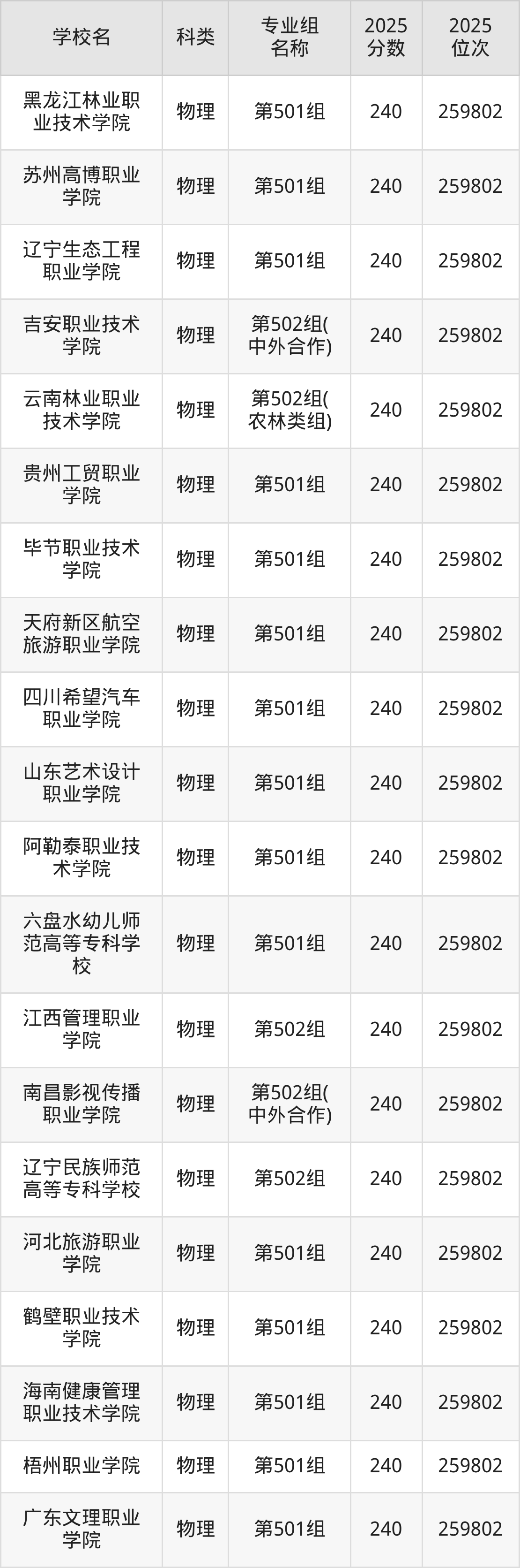 而位次最低的民办院校有重庆现代制造职业学院(第502组)、长沙文创艺术职业学院(第501组)、长江艺术工程职业学院(第501组)、厦门安防科技职业学院(第501组),分数为240分,对应最低位次排名为259802名。