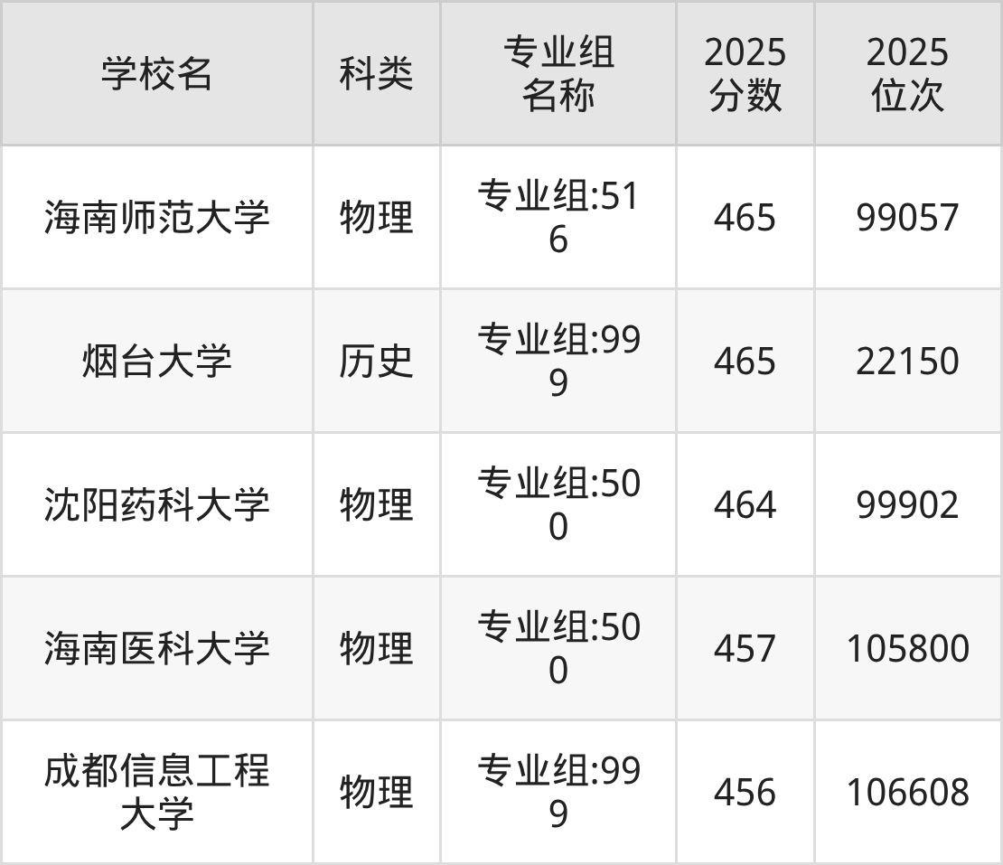 以福建物理类为例,465分能上的一本大学有海南医科大学(位次排名105800名)、成都信息工程大学(位次排名106608名)、海南师范大学(位次排名99057名)。