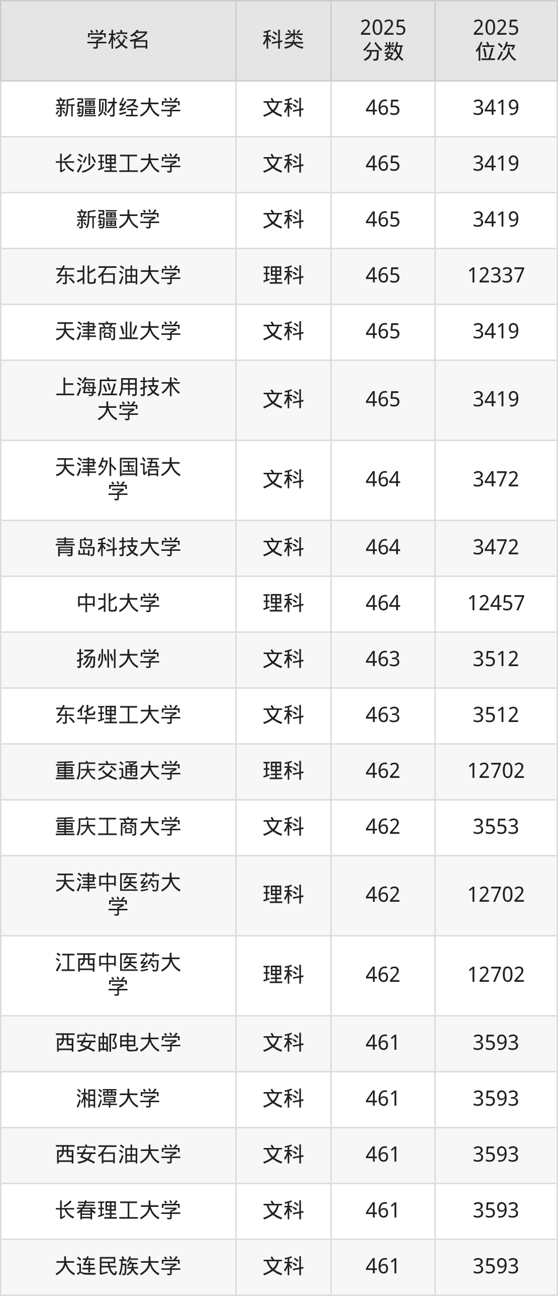 除上述院校外,465分可上的公办一本大学还有江西理工大学(第003组392分,位次63748名)、新疆农业大学(第005组453分,位次44142名)。