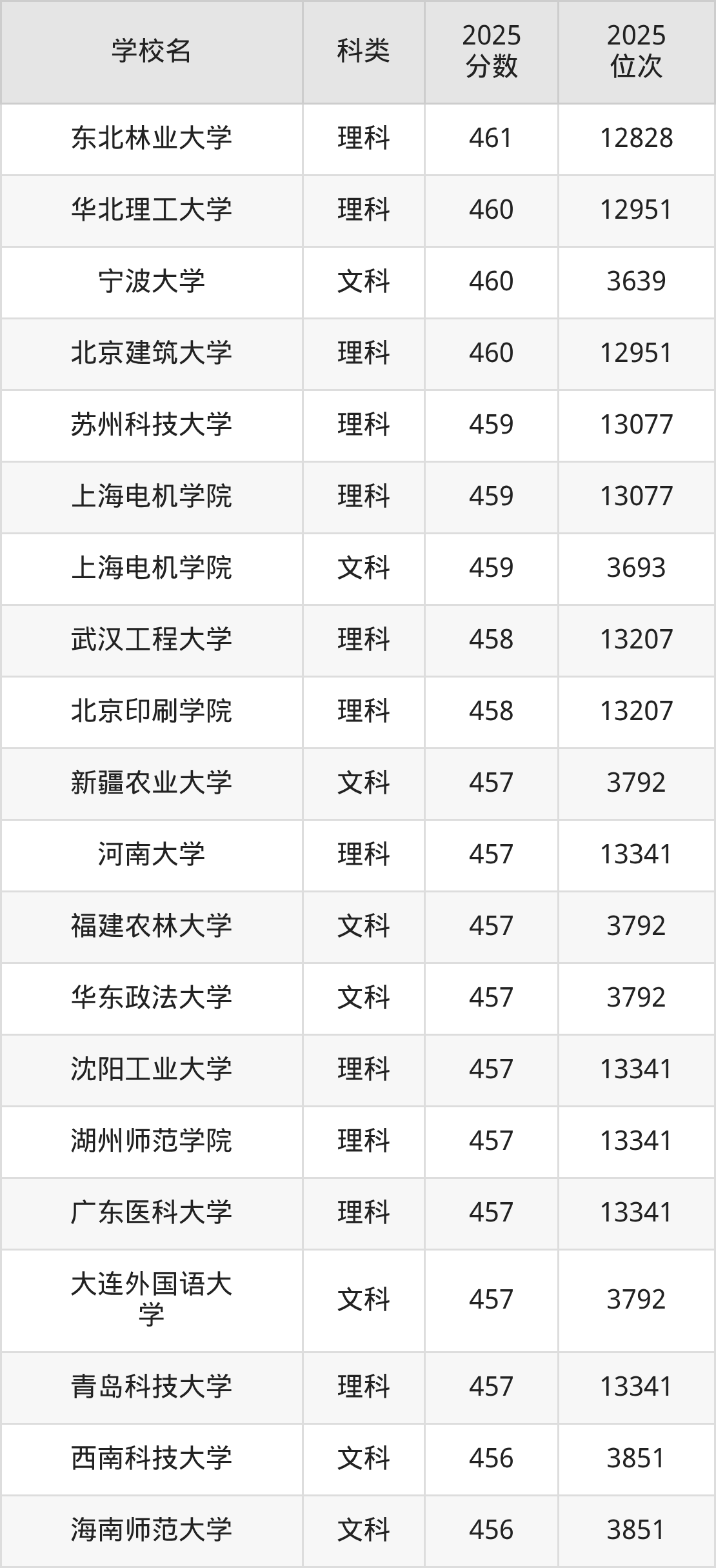 2025年内蒙古物理类本科线为375分,465分能上的一本大学共计9所,其中最低分公办院校为中南林业科技大学(第002组380分),对应最低位次为67212名。因此想上公办本科的考生自治区排名位次至少要在67212名以内。