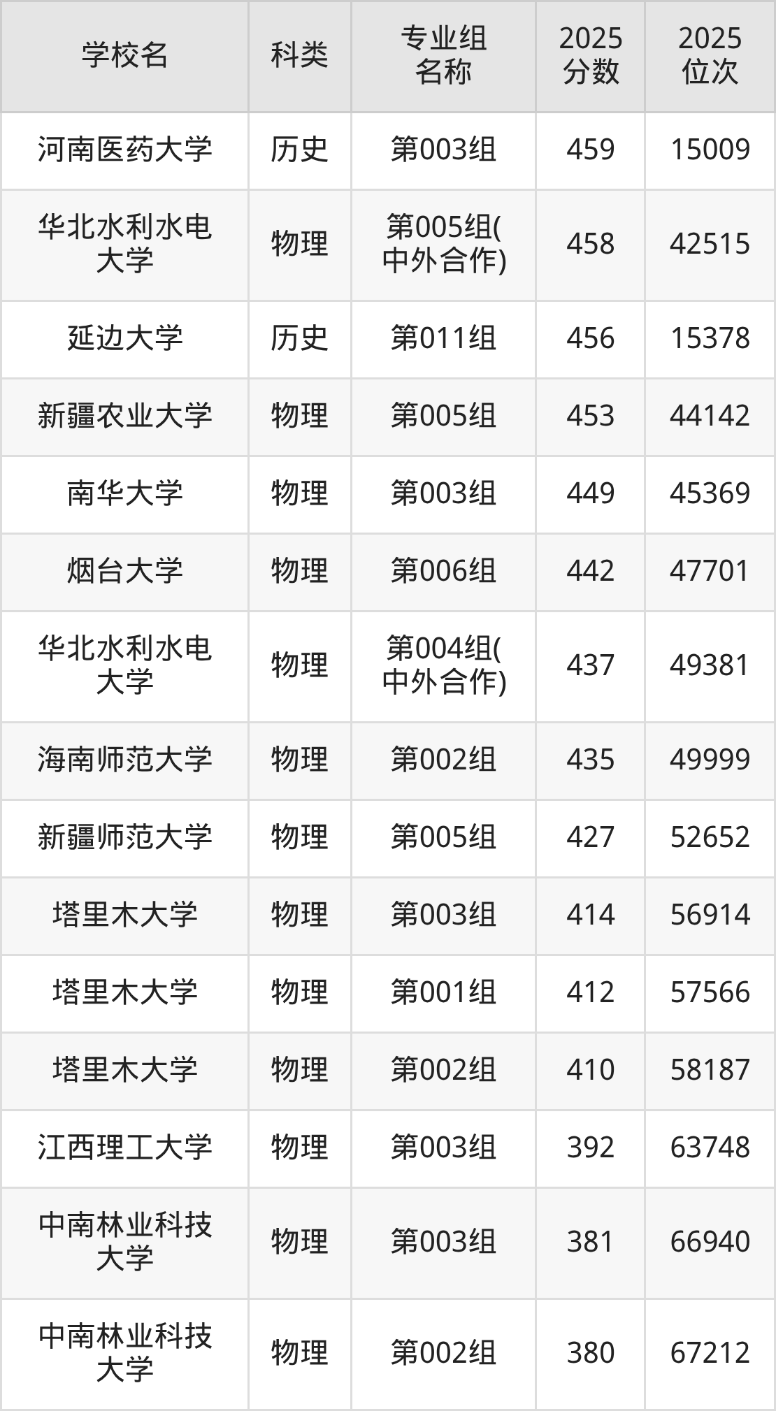 除上述院校外,465分可上的公办一本大学还有华北水利水电大学(第005组(中外合作)458分,位次42515名)、南华大学(第003组449分,位次45369名)。