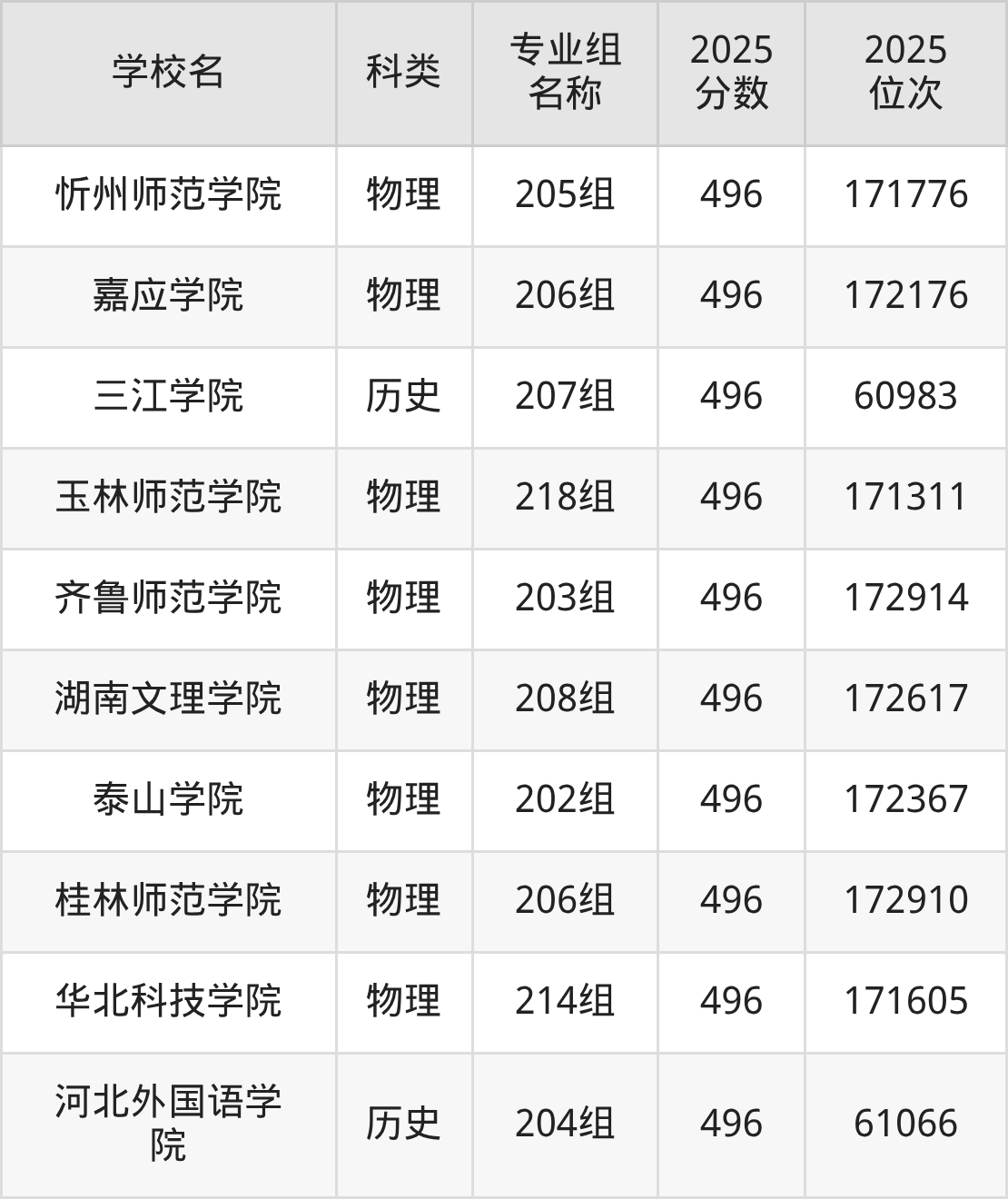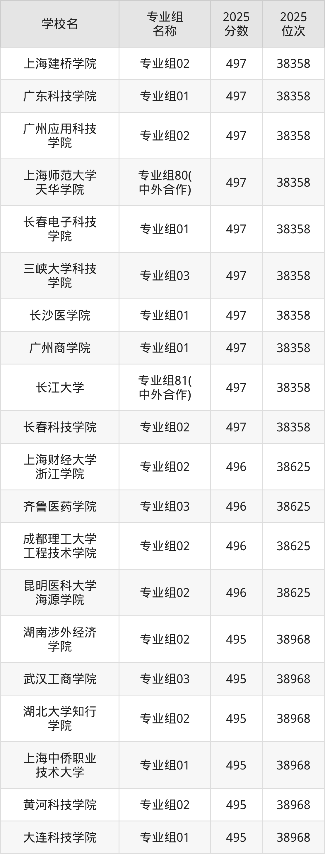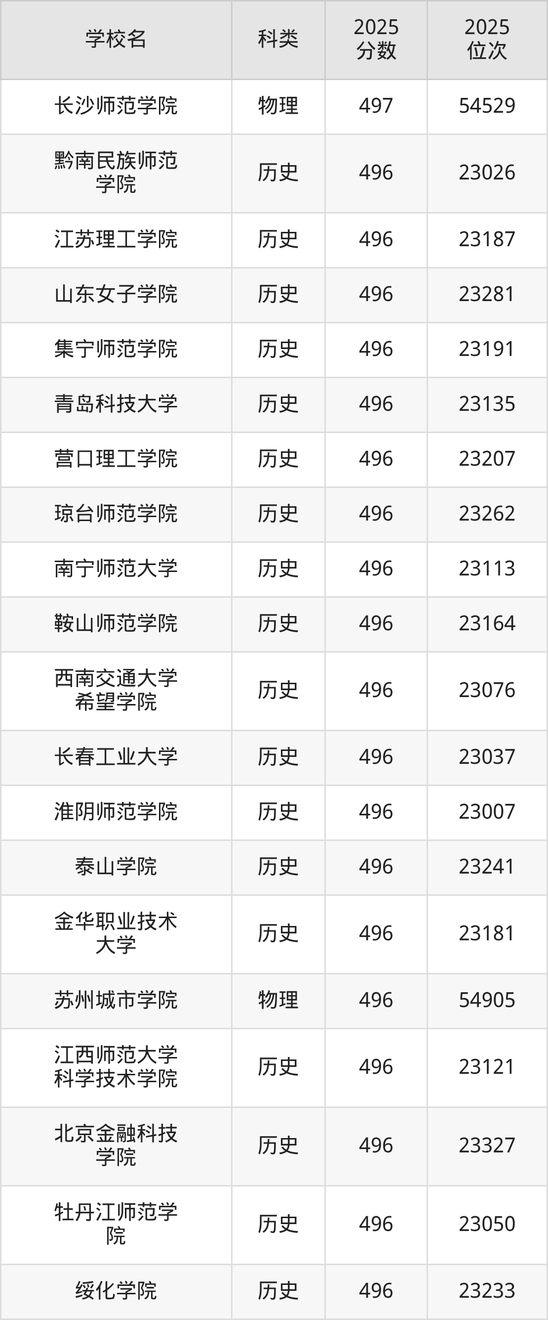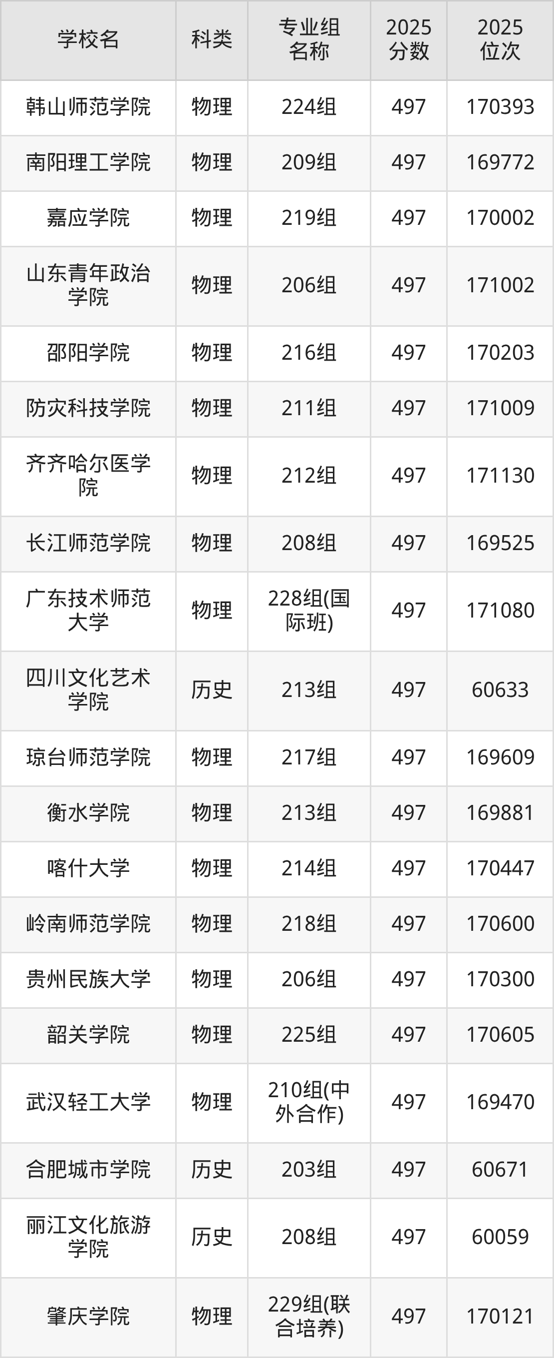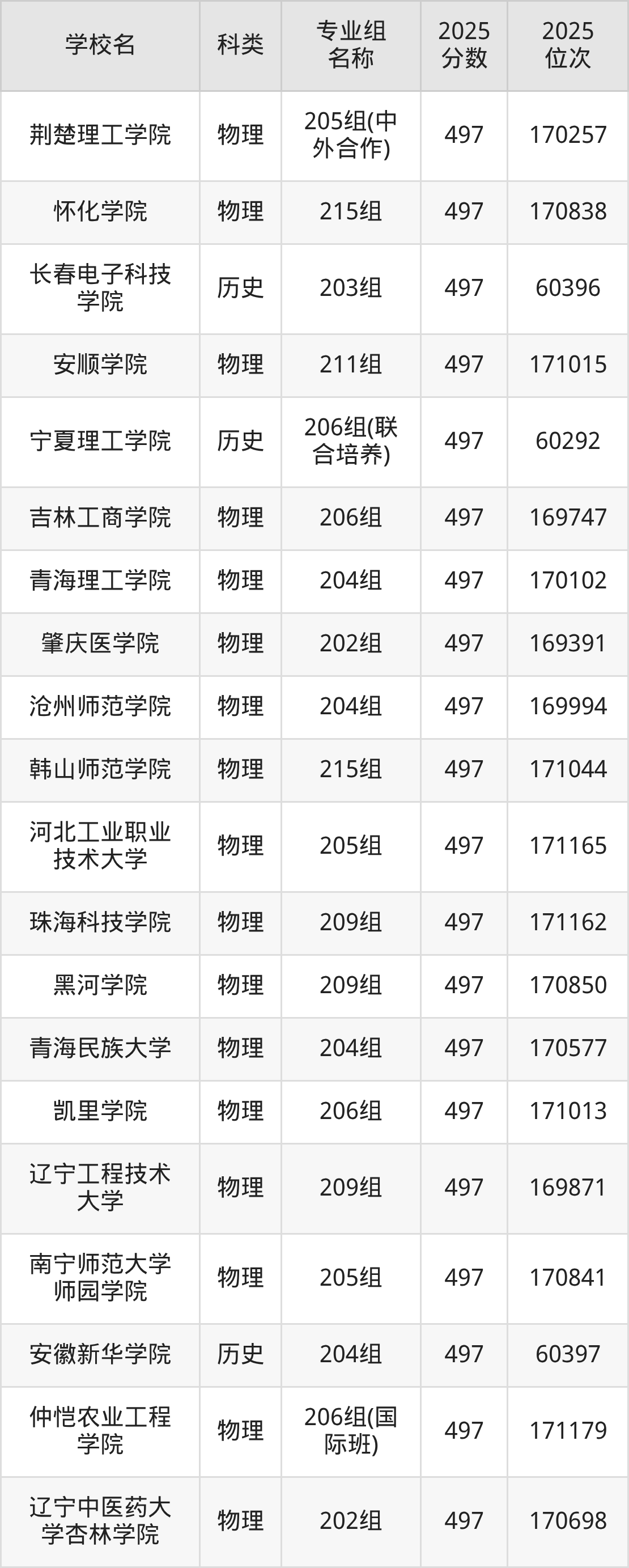 除上述院校外,497分可上的公办本科大学还有兰州石化职业技术大学(495分,位次23611名)、河北金融学院(447分,位次99485名)。