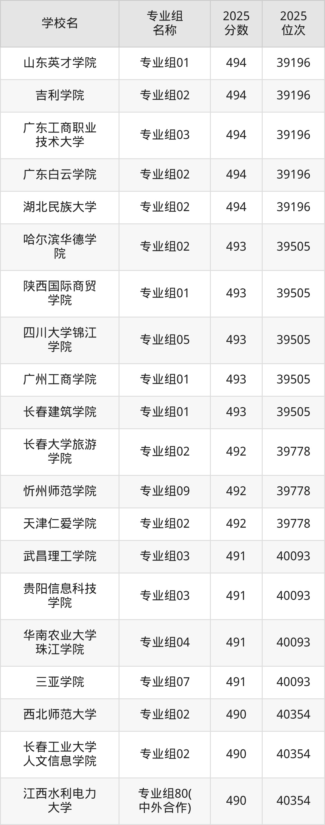 而民办大学录取位次排名最低的是烟台科技学院(480分),其2025最低位次为43089名。