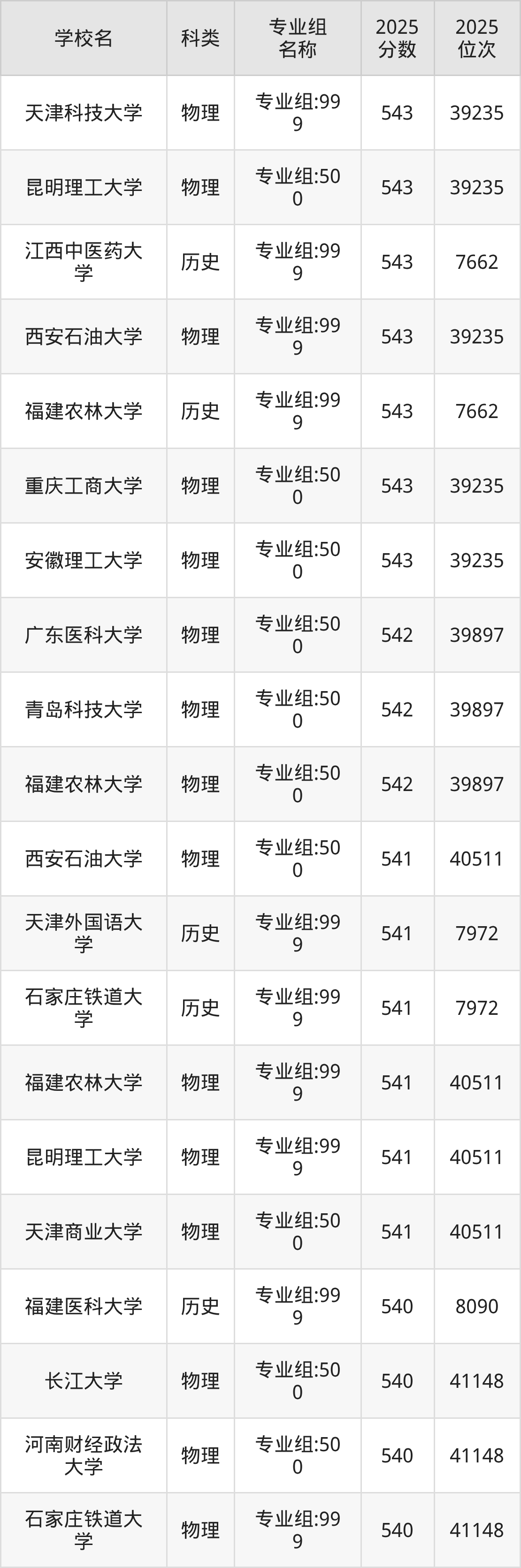 以福建历史类为例,543分能上的一本大学有福建农林大学(位次排名7662名)、南华大学(位次排名12736名)、塔里木大学(位次排名17496名)。