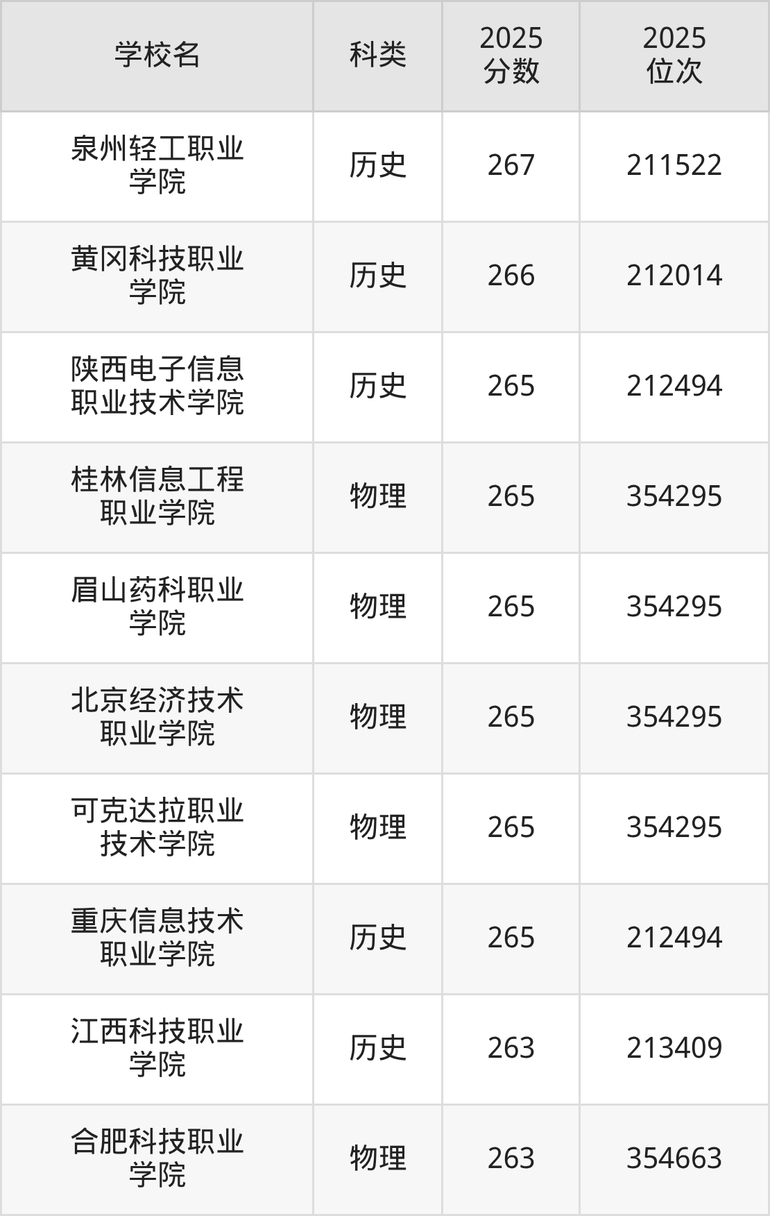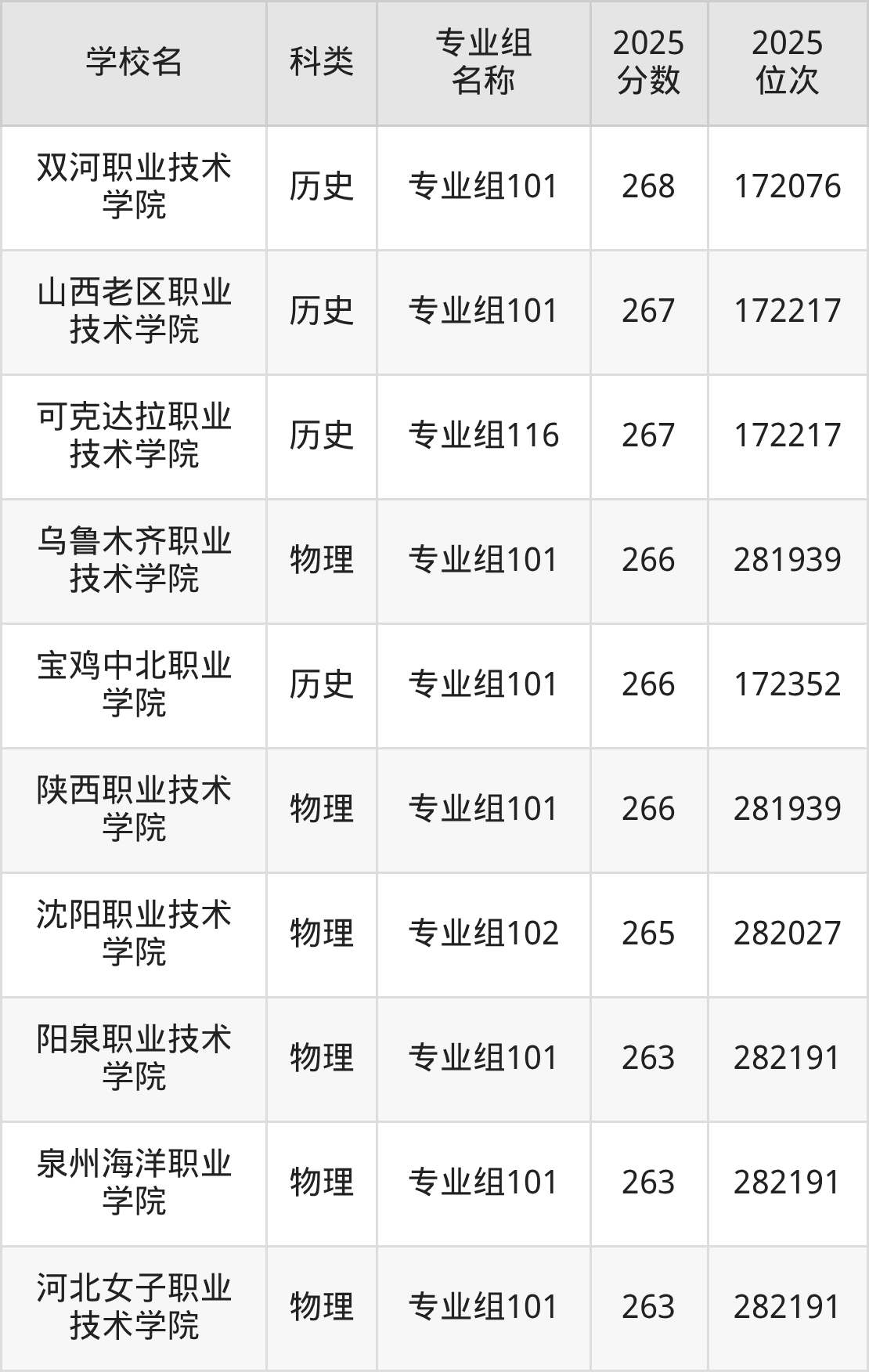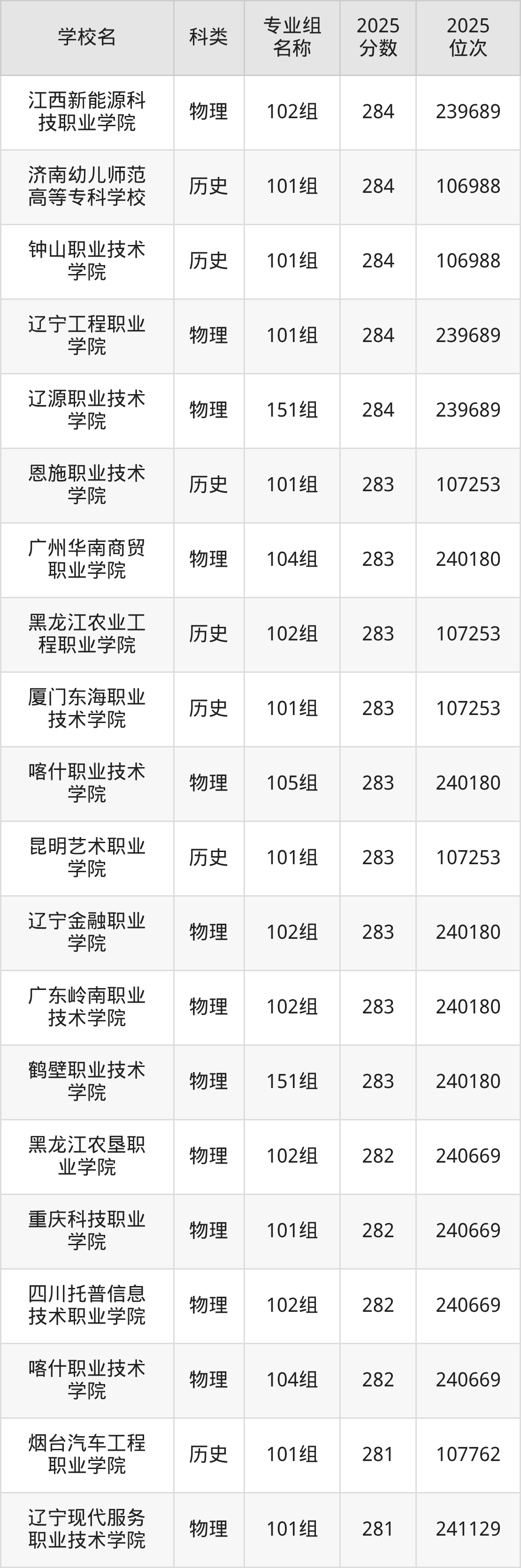 2025年四川物理类专科线为150分,286分能上的专科学校共计349所,其中公办大学录取位次排名最低的是毕节医学高等专科学校(专业组104150分),其2025最低位次为284789名。