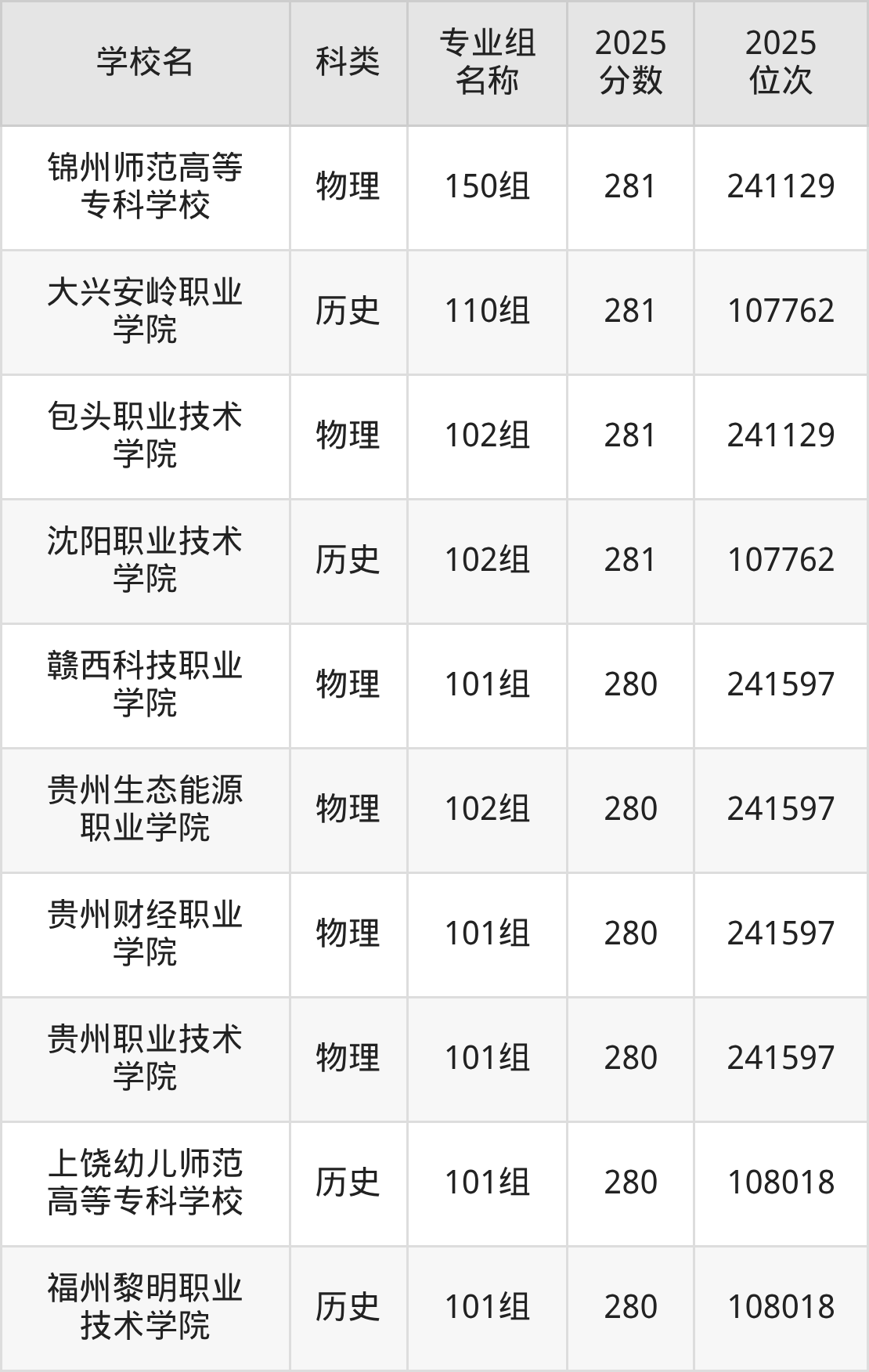 2025年广西物理类专科线为200分,286分能上的专科学校共计225所,其中公办大学录取位次排名最低的是阜新高等专科学校(101组204分,位次260025名),即代表考生壮族自治区排名位次在260025名及以内就可以报考公办专科。