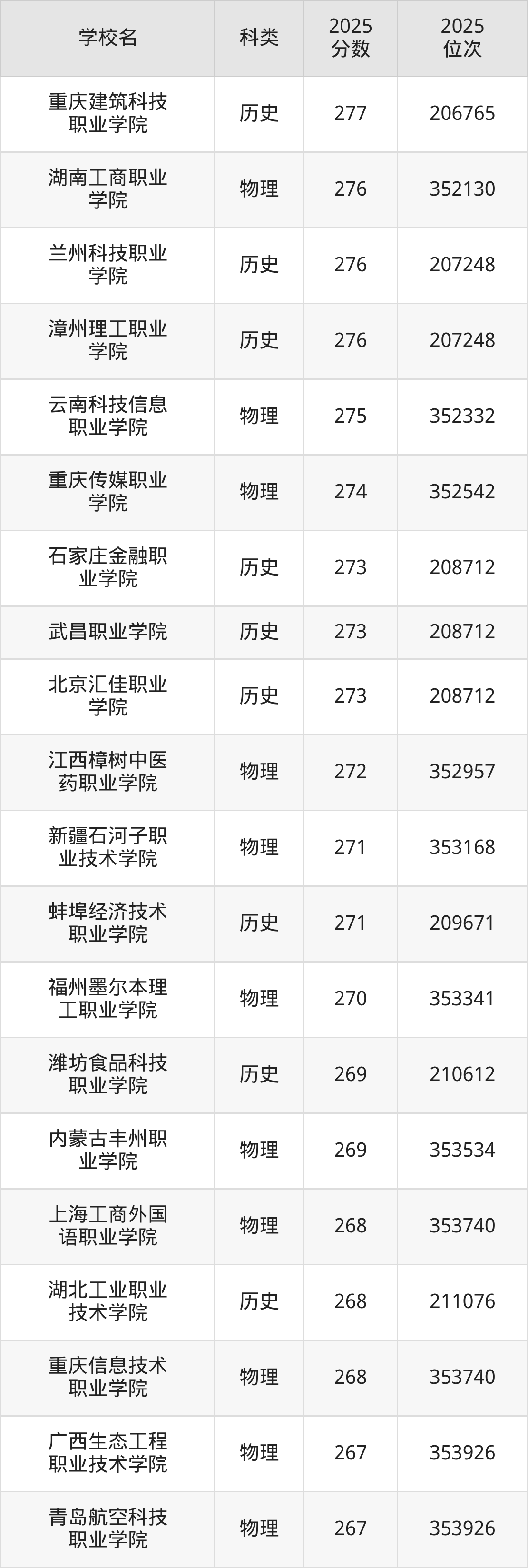 2025年河北物理类专科线为200分,286分能上的专科学校共计273所,其中最低分公办院校为石家庄职业技术学院(207分),对应最低位次为361108名。因此想上公办专科的考生省排名位次至少要在361108名以内。