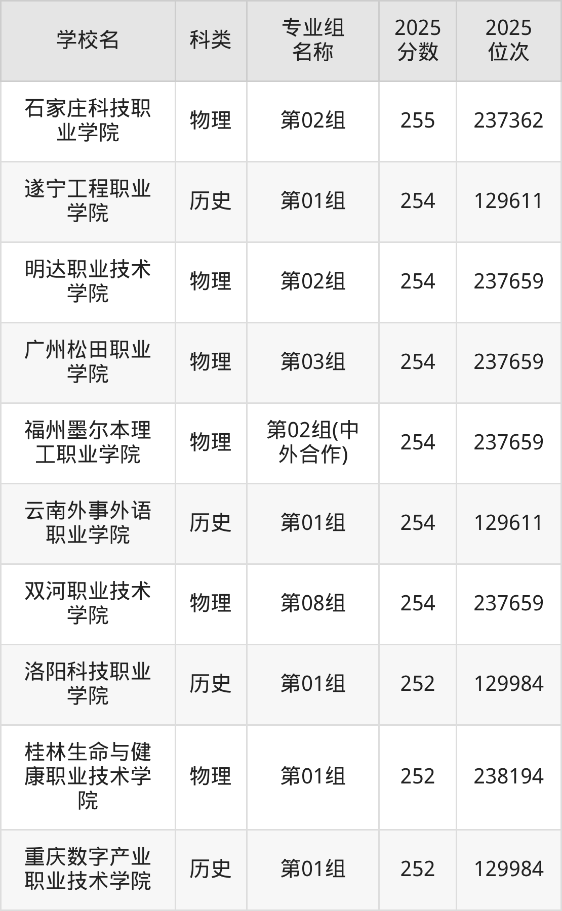 录取位次排名较低的公办专科学校还有湖北城市建设职业技术学院(位次246134名)、湖北工业职业技术学院(位次136151名)、六盘水幼儿师范高等专科学校(位次135930名)等,适合省排名在13万名开外的专科生报考。