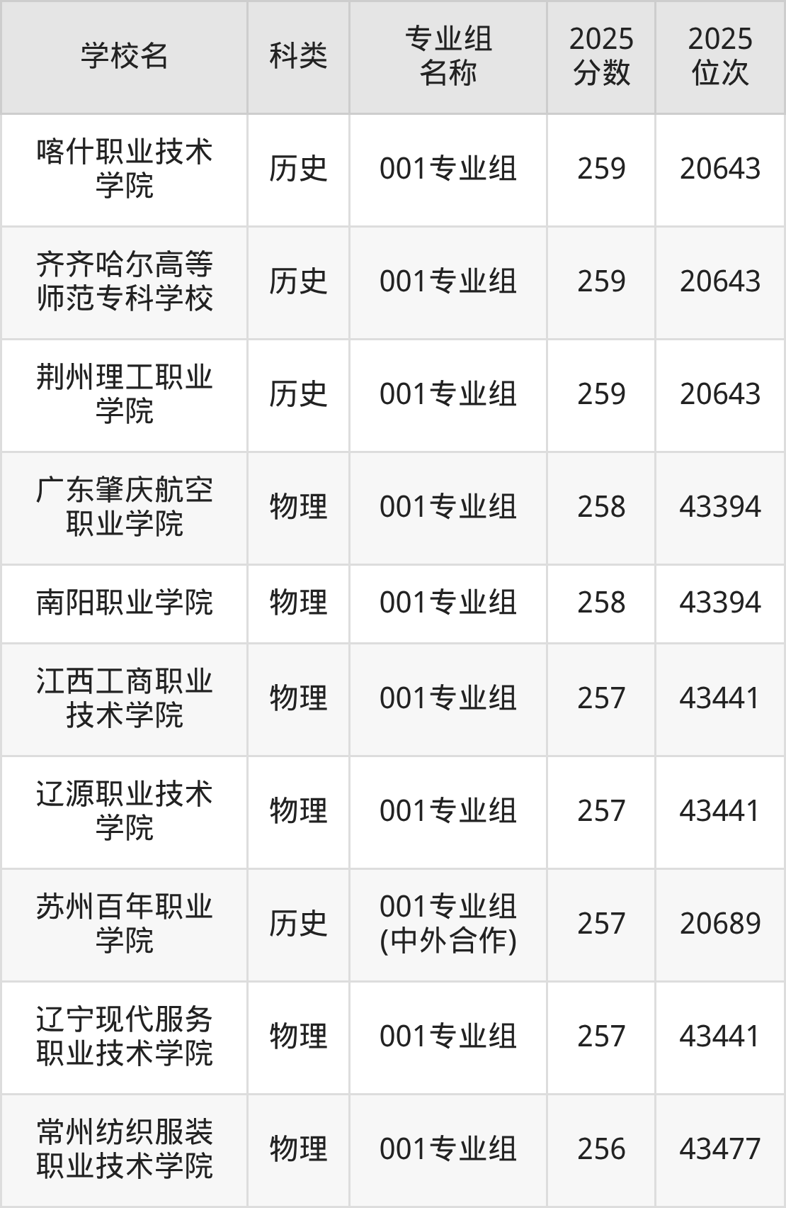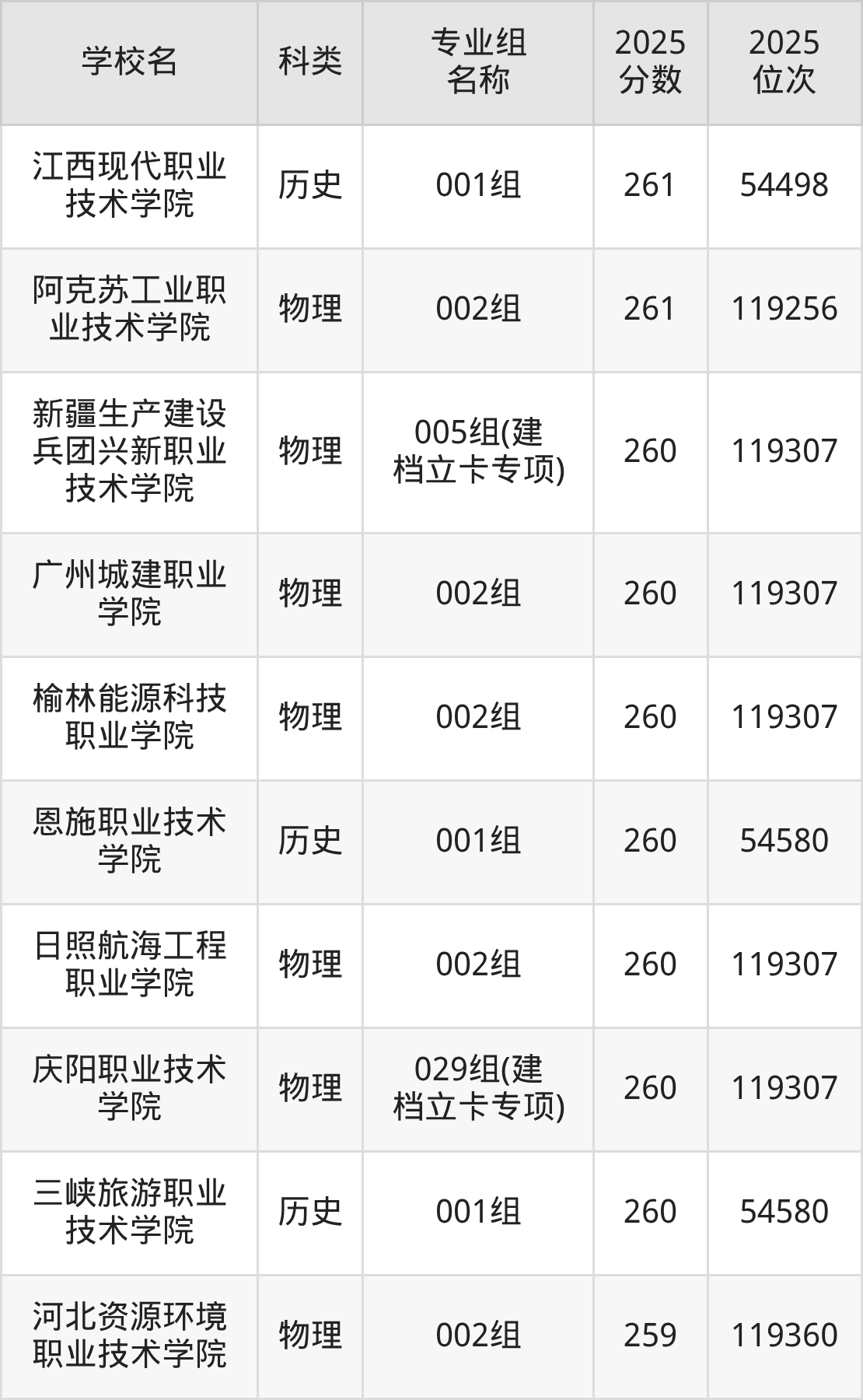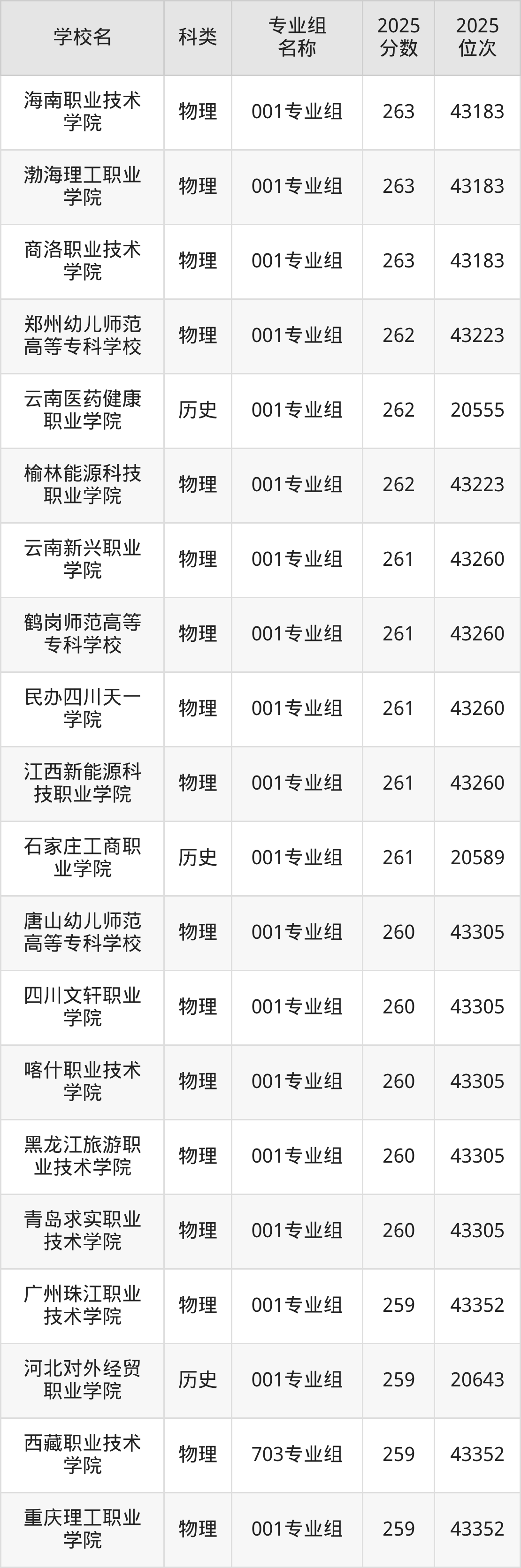 除上述院校外,268分可上的公办专科学校还有甘肃畜牧工程职业技术学院(001专业组213分,位次44332名)、商洛职业技术学院(001专业组263分,位次43183名)。