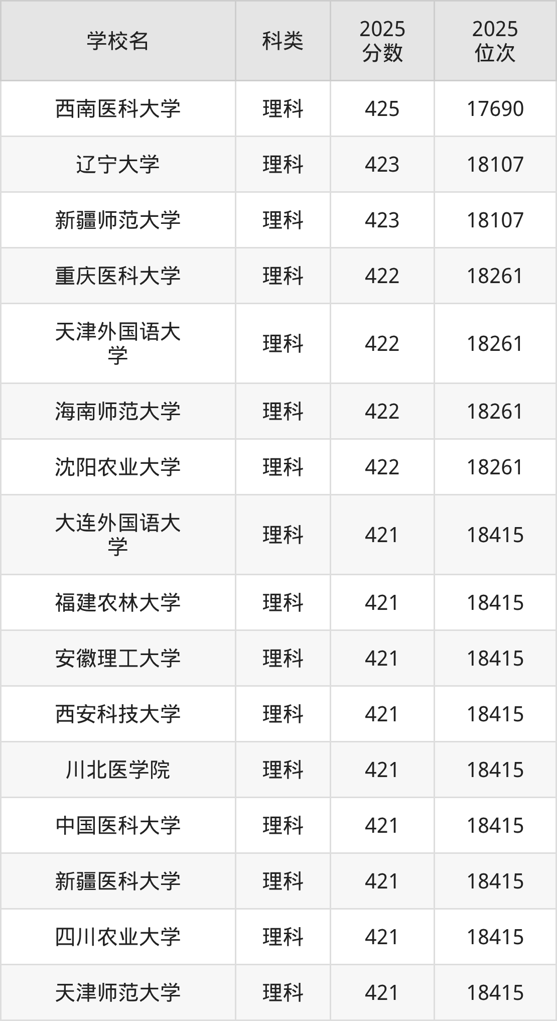 2025年新疆理科一本线为421分,426分能上的一本大学共计16所,其中公办大学录取位次排名最低的是安徽理工大学(421分),其2025最低位次为18415名。