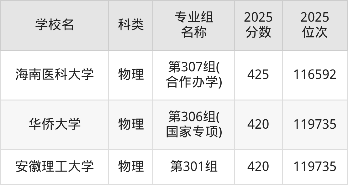 2025年山西物理类本科线为419分,426分能上的一本大学共计3所,其中最低分公办院校为华侨大学(第306组(国家专项)420分),对应最低位次为119735名。因此想上公办本科的考生省排名位次至少要在119735名以内。
