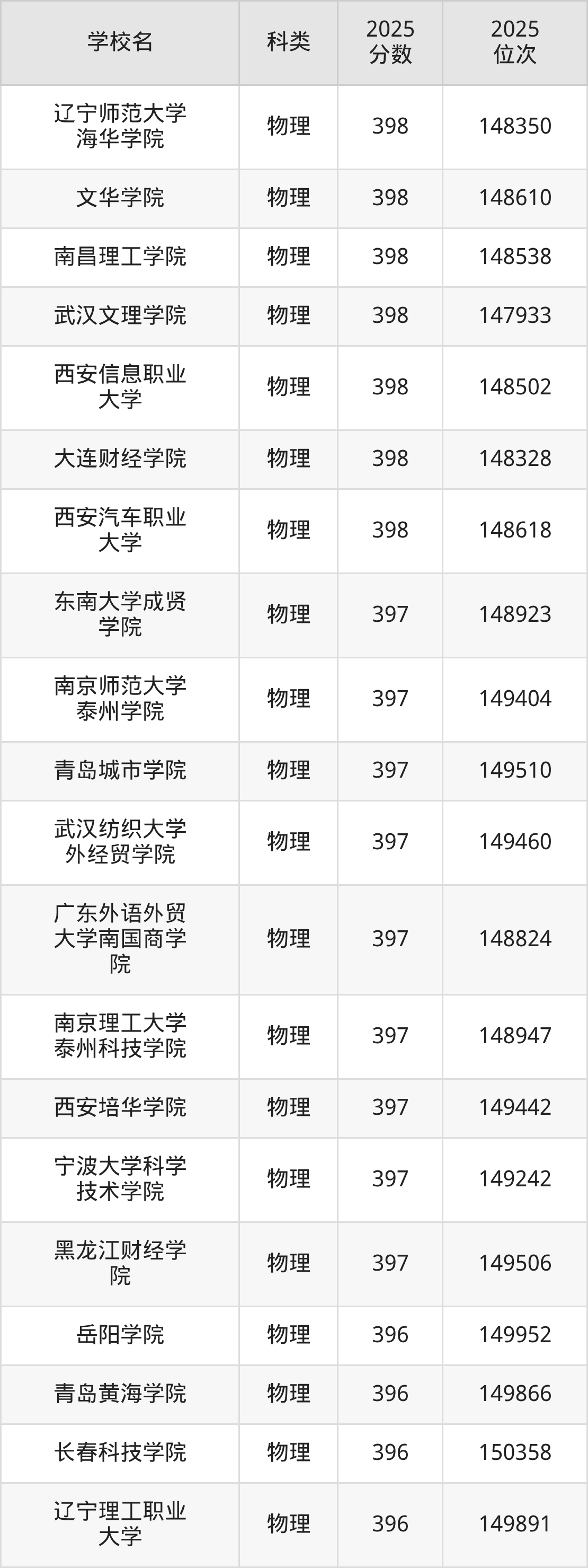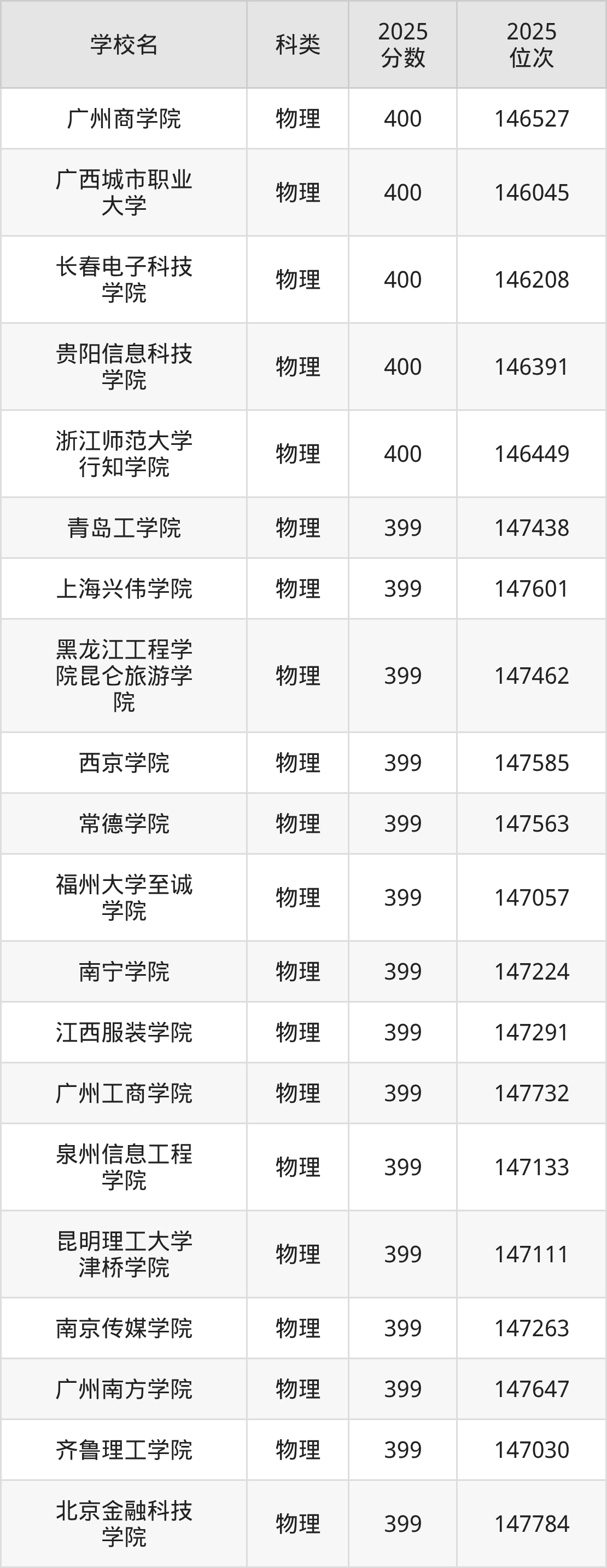 以贵州物理类为例,400分能上的本科大学有辽宁对外经贸学院(位次排名156823名)、海南科技职业大学(位次排名158011名)、武汉纺织大学外经贸学院(位次排名149460名)。