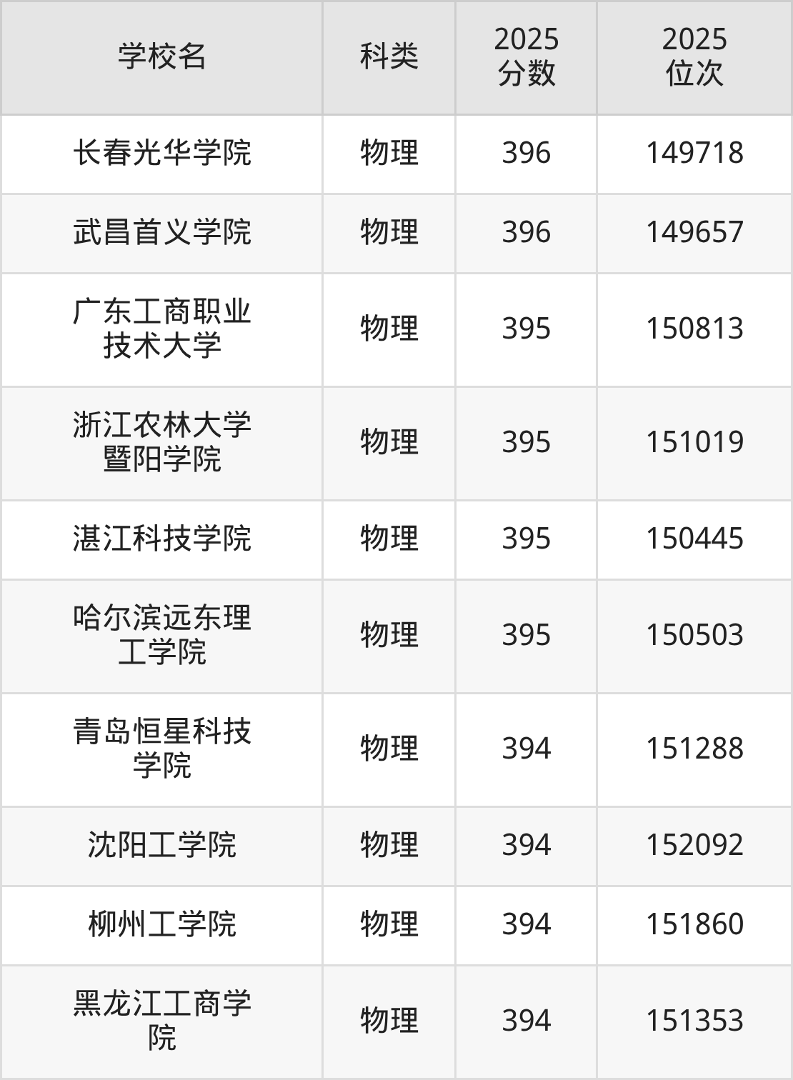 而民办大学录取位次排名最低的是广州新华学院(387分),其2025最低位次为158061名。