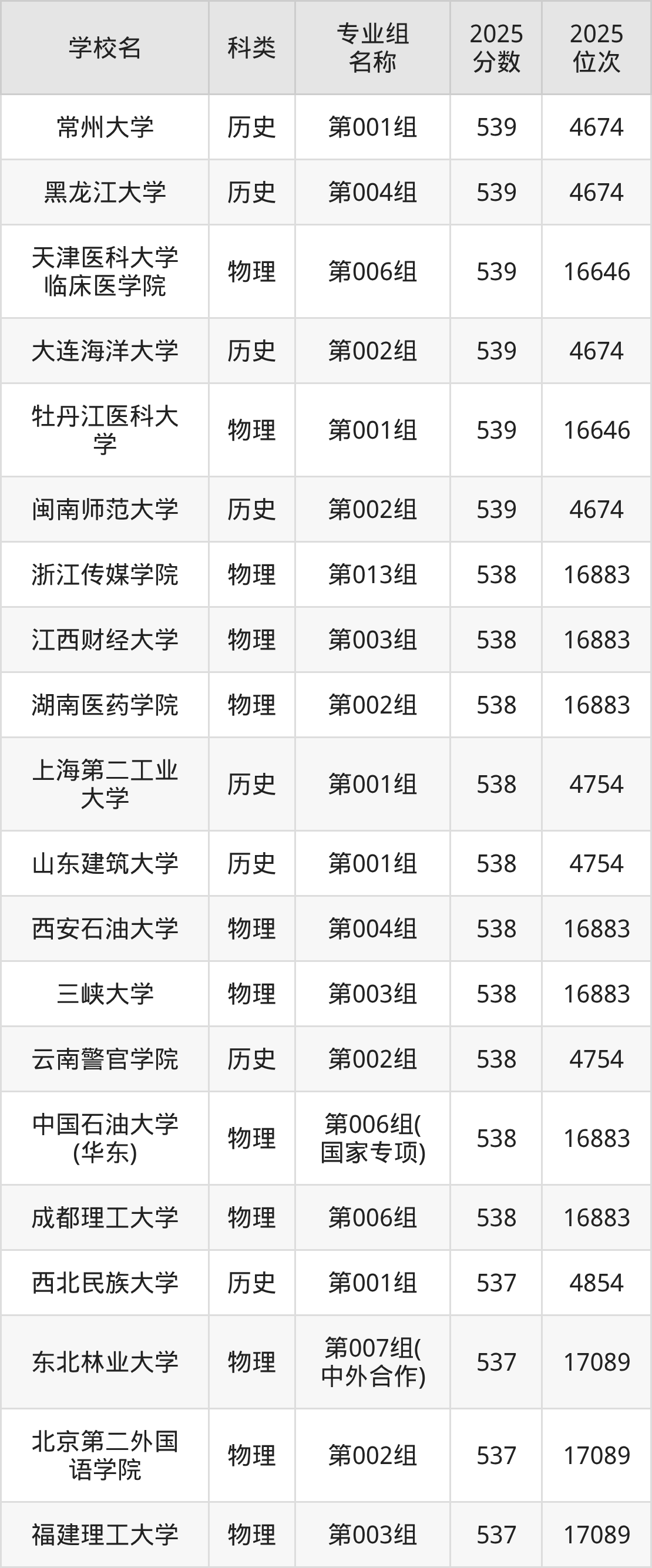 以吉林物理类为例,539分能上的本科大学有广东医科大学(位次排名33219名)、淮阴师范学院(位次排名34050名)、吉林师范大学(位次排名43673名)。