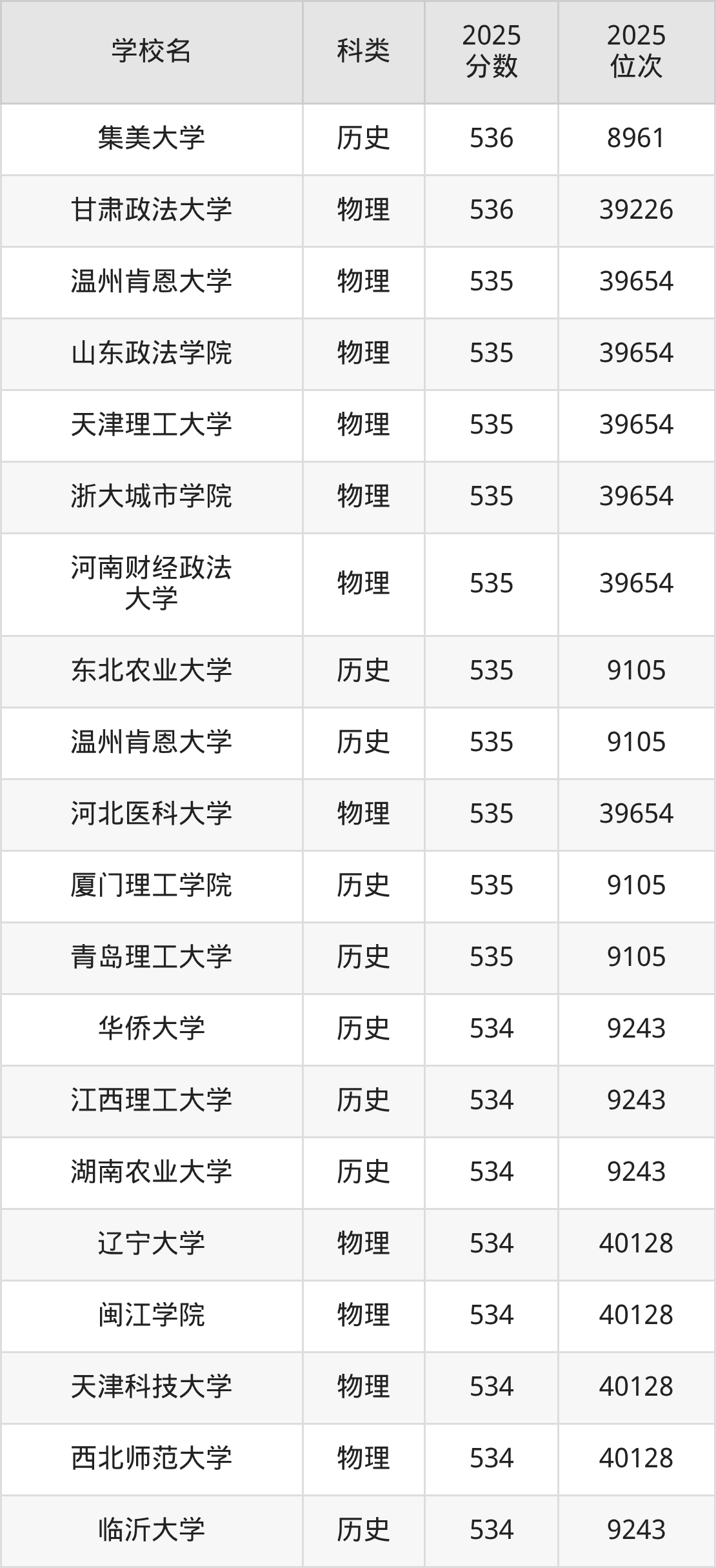 2025年吉林历史类本科线为384分,539分能上的本科大学共计485所,其中公办大学录取位次排名最低的是海南热带海洋学院(第002组(中外合作)384分),其2025最低位次为21618名。
