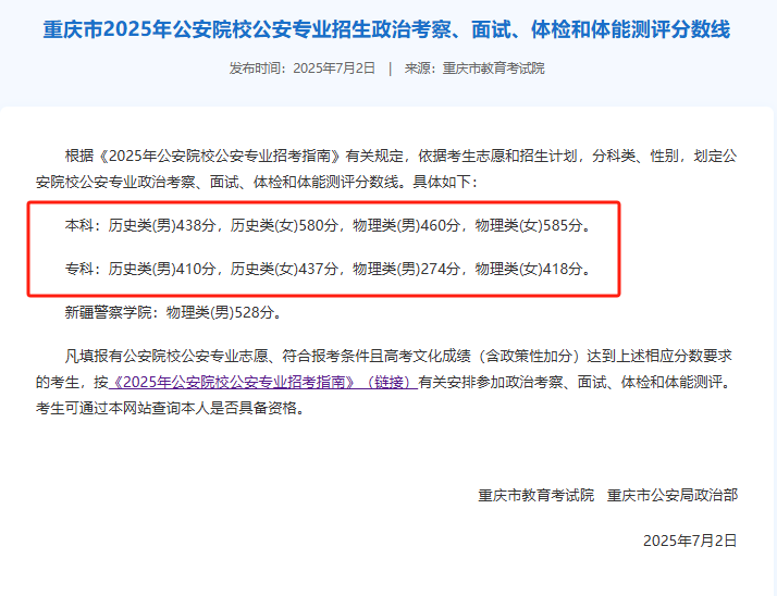 一、2025年重庆警校录取分数线