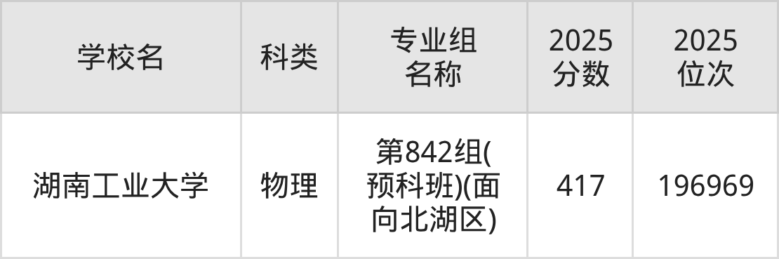 2025年湖南物理类本科线为405分,417分能上的一本大学共计1所,其中公办大学录取位次排名最低的是湖南工业大学(第842组(预科班)(面向北湖区)417分),其2025最低位次为196969名。