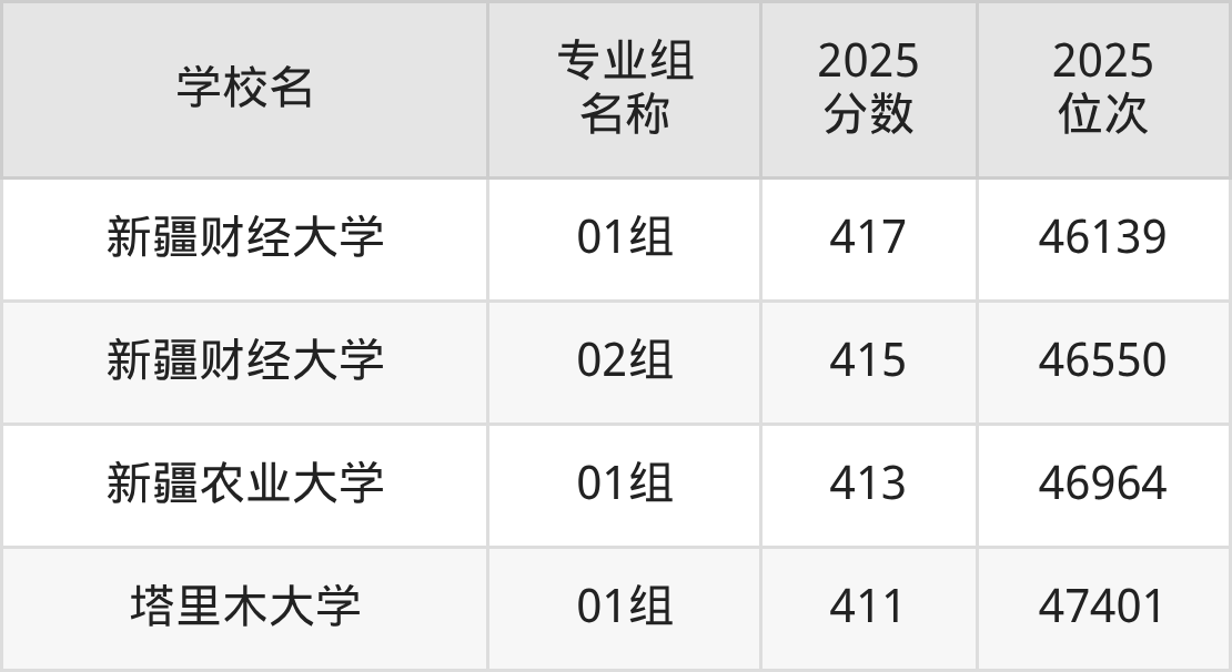 除上述院校外,417分可上的公办一本大学还有新疆农业大学(01组413分,位次46964名)、新疆财经大学(01组417分,位次46139名)。