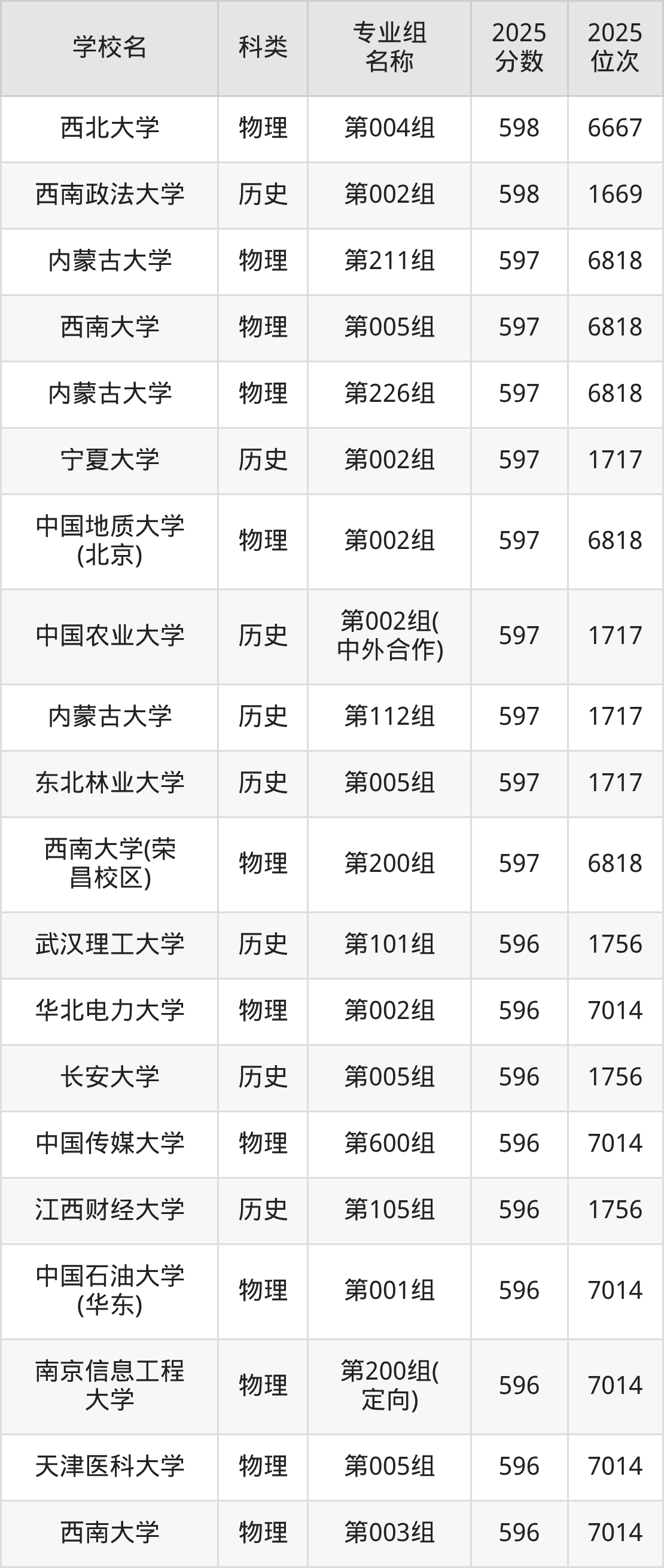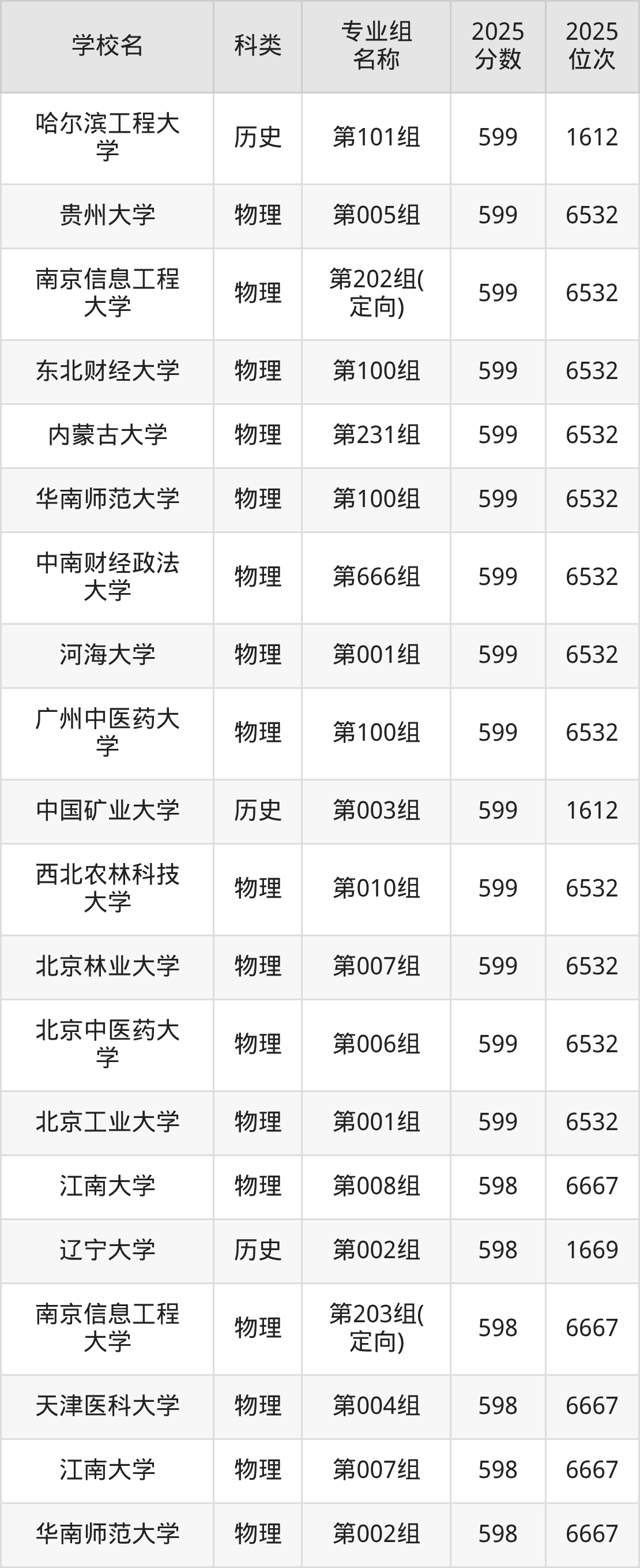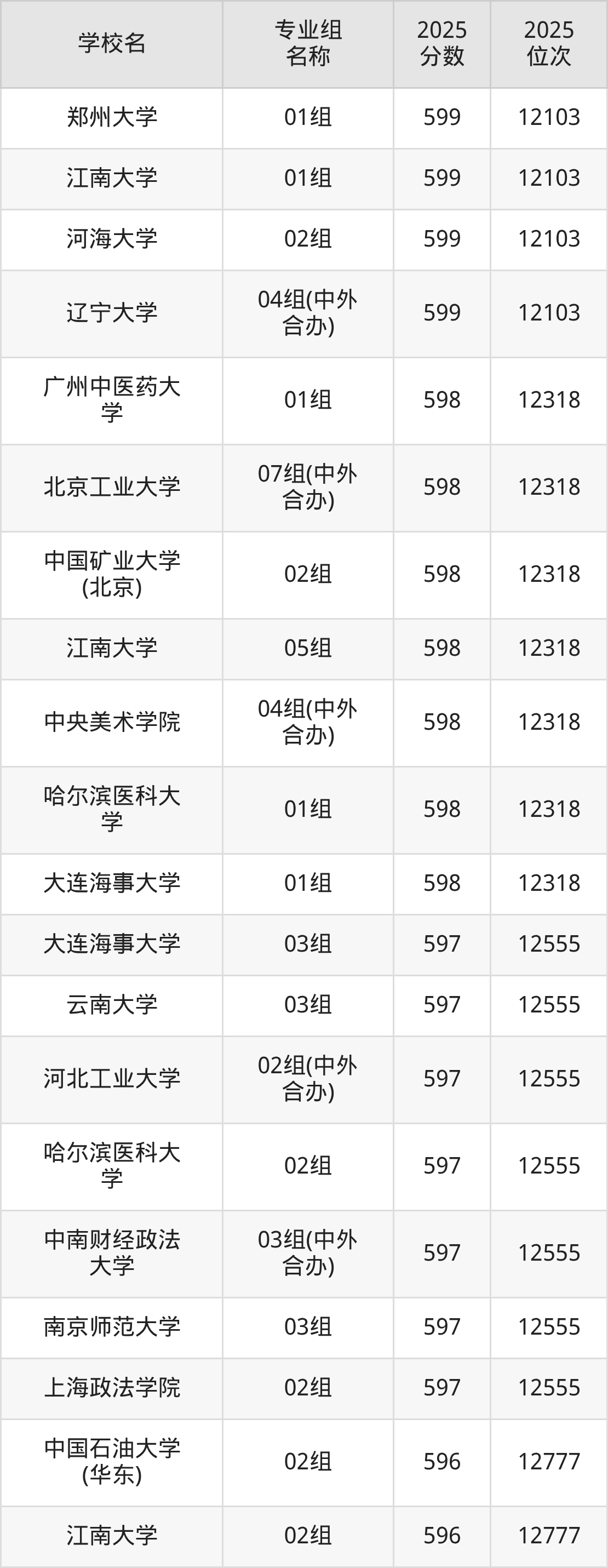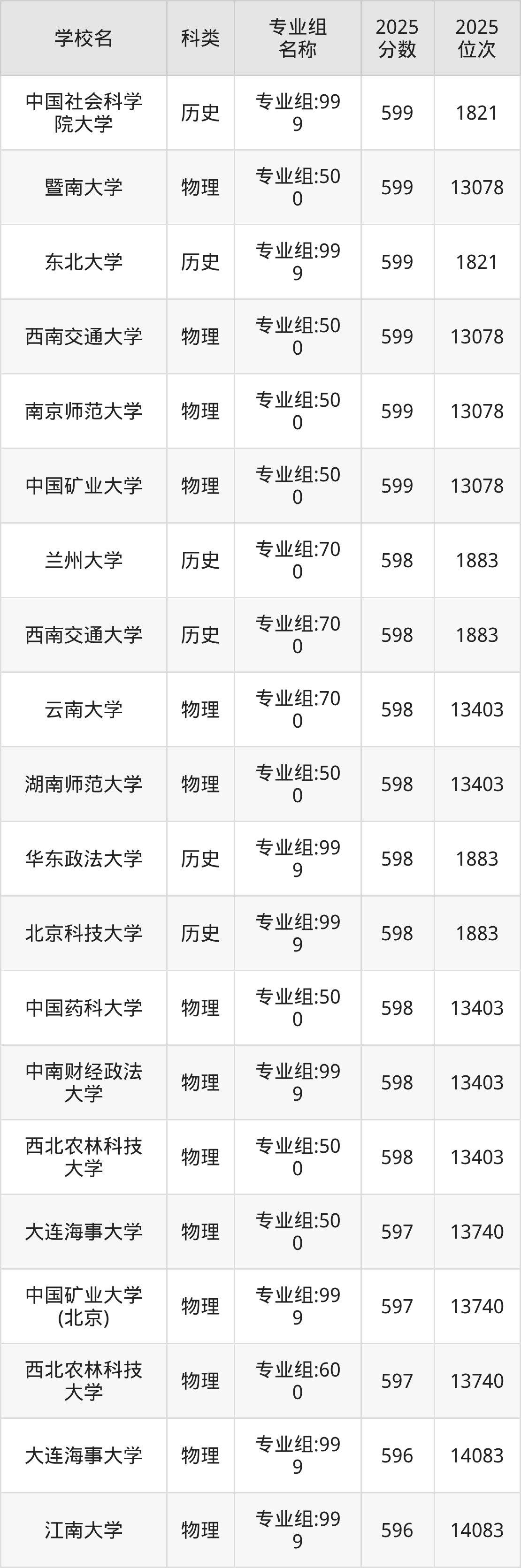 除上述院校外,599分可上的公办一本大学还有宁夏大学(第008组565分,位次12932名)、云南大学(第006组557分,位次14710名)。