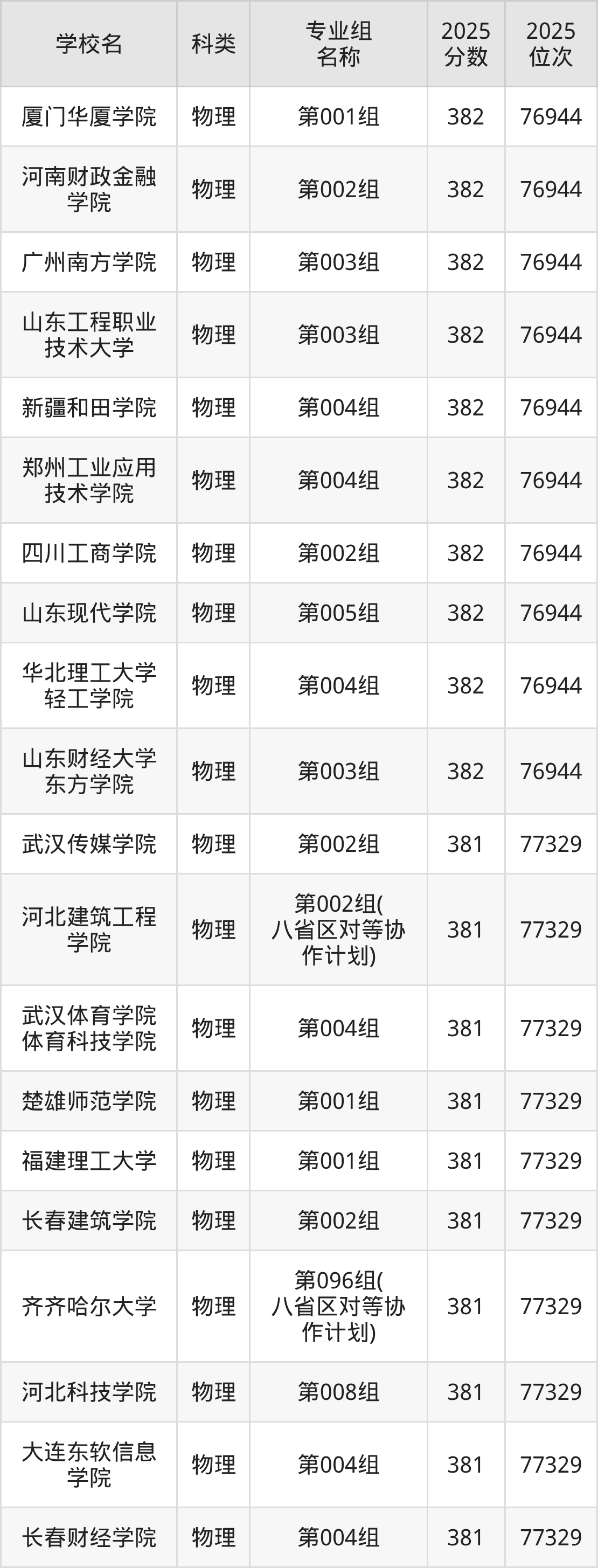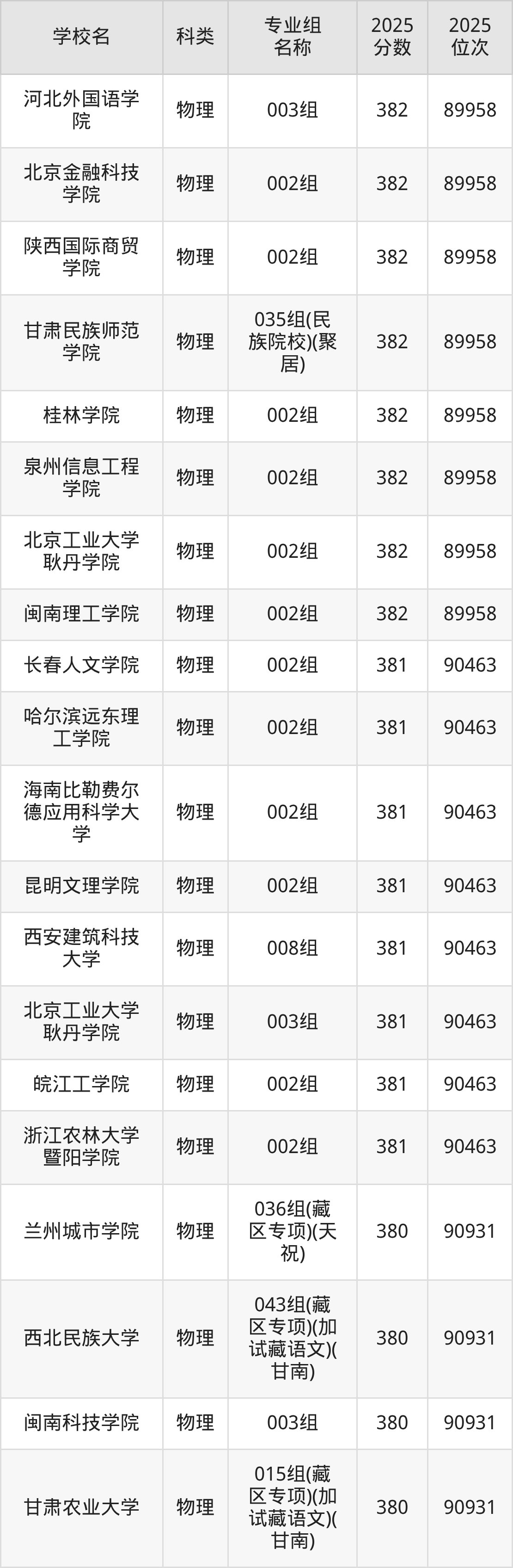 以黑龙江物理类为例,382分能上的本科大学有湖南涉外经济学院(位次排名84950名)、沧州交通学院(位次排名84950名)、武汉学院(位次排名79727名)。