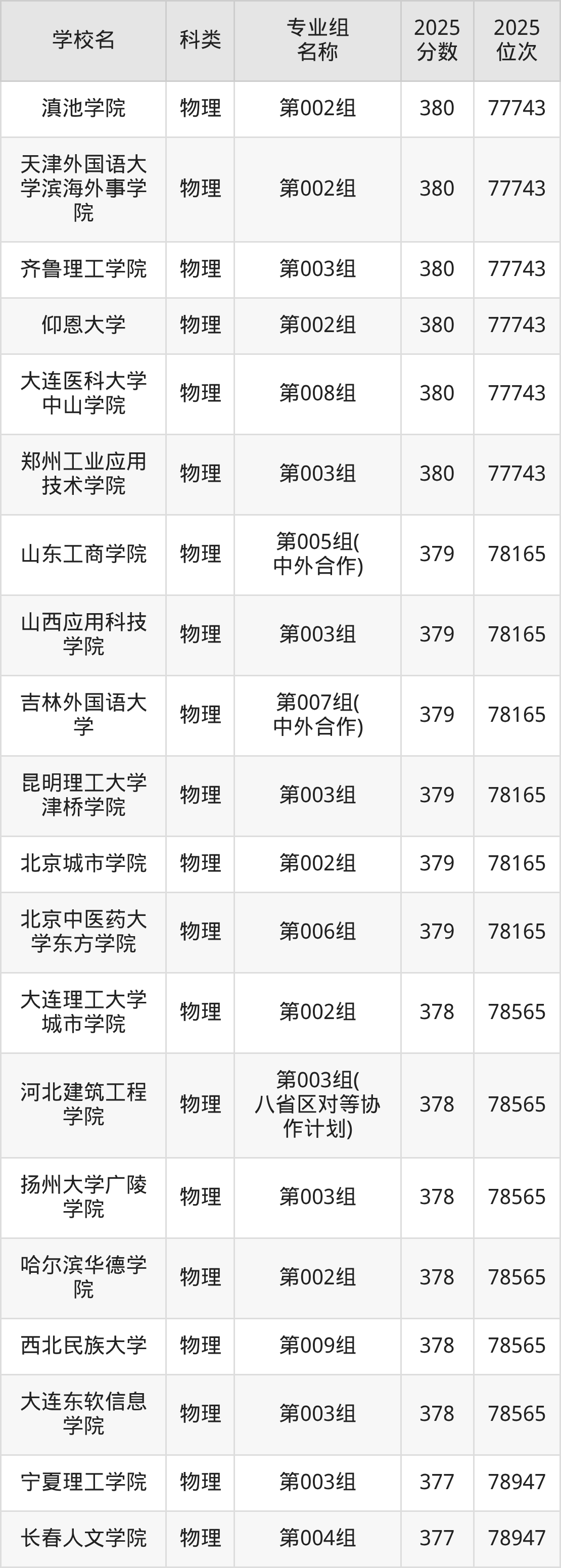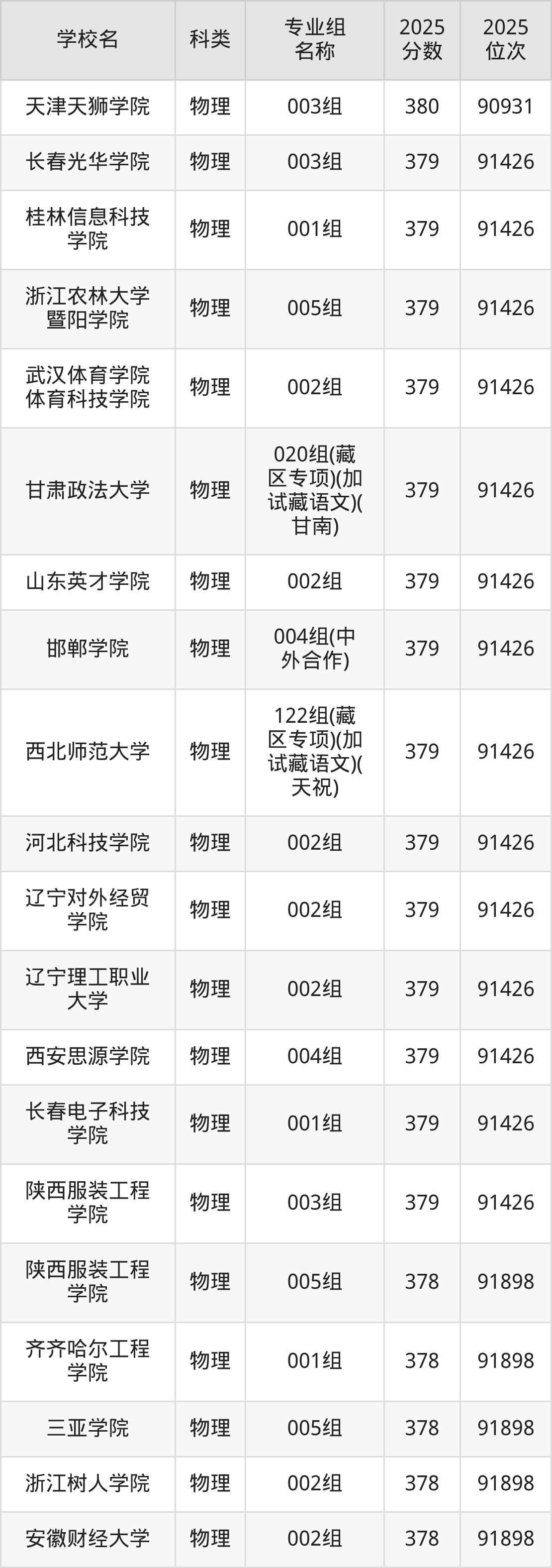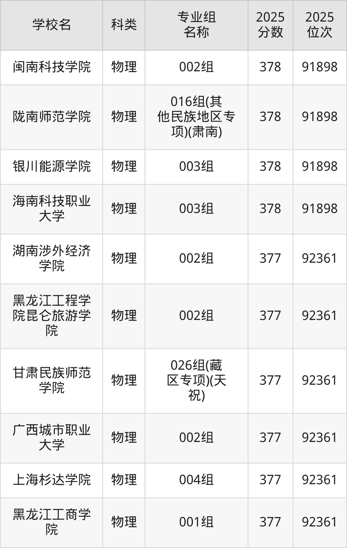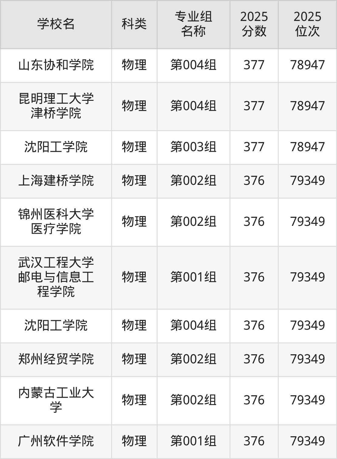 而位次最低的民办院校有上海师范大学天华学院(003组)、天津传媒学院(002组)、沈阳城市建设学院(001组)、三江学院(003组),分数为374分,对应最低位次排名为93788名。
