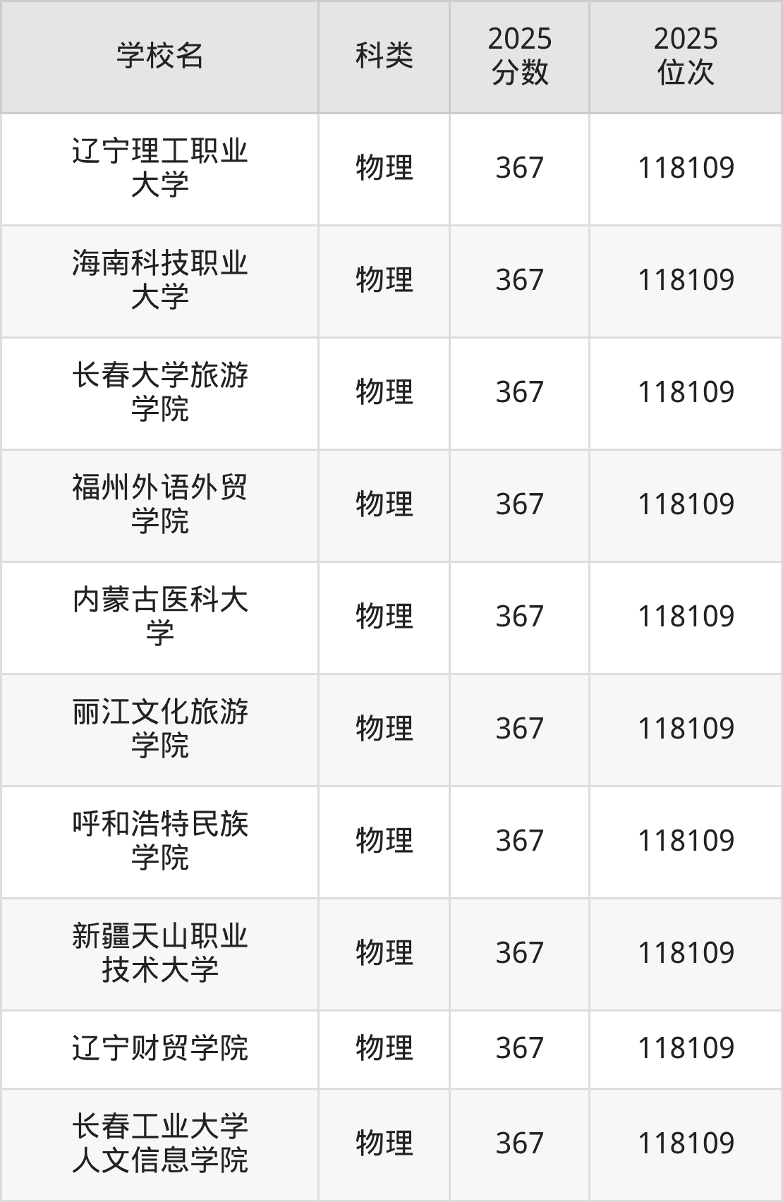 2025年辽宁物理类本科线为367分,382分能上的本科大学共计58所,其中公办大学录取位次排名最低的是海南医科大学(367分,位次118109名),即代表考生省排名位次在118109名及以内就可以报考公办本科。