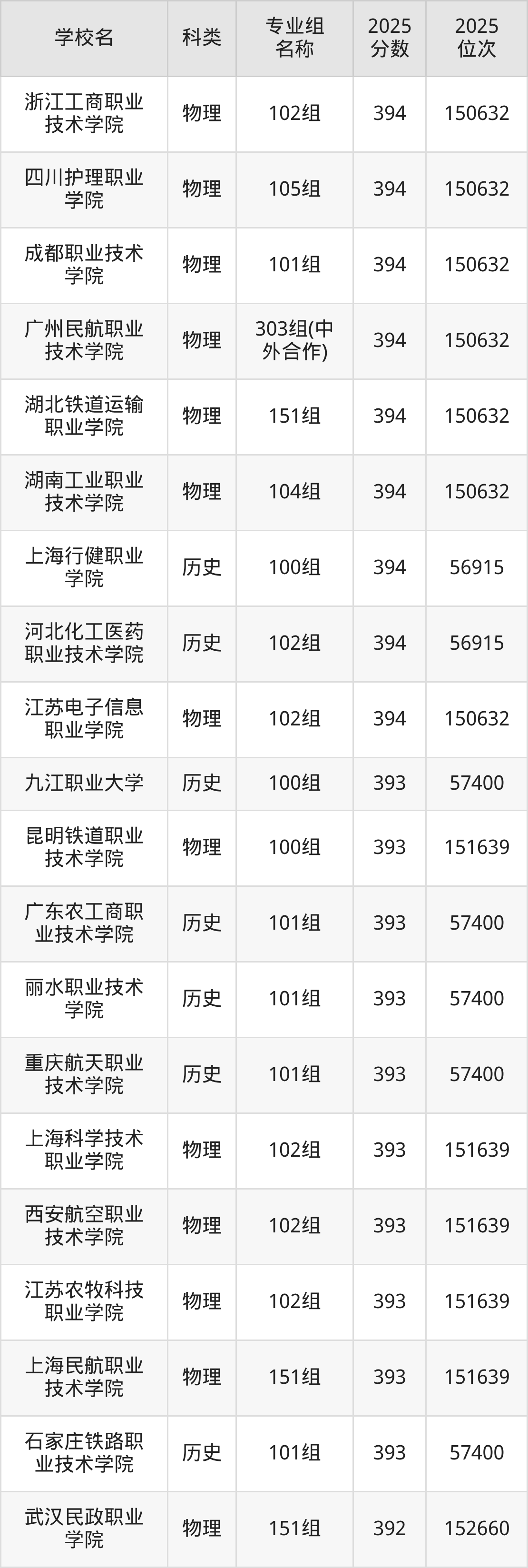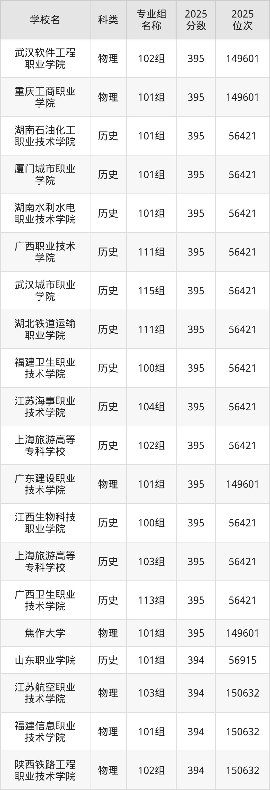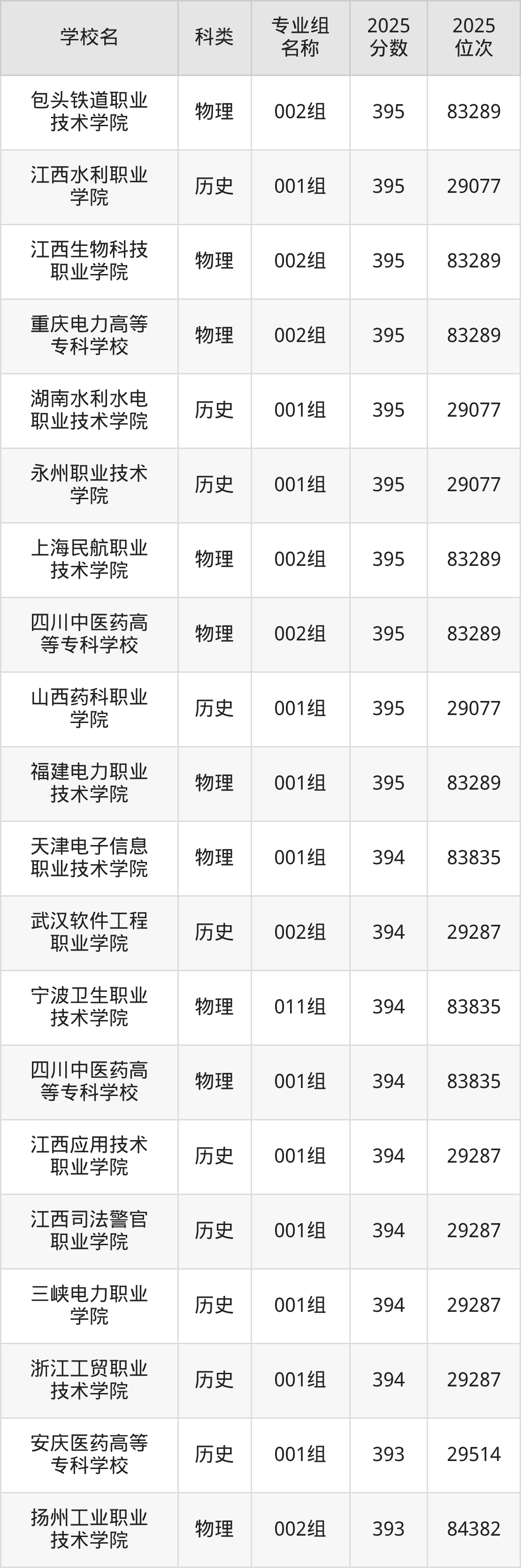 除上述院校外,395分可上的公办专科学校还有昆明铁道职业技术学院(001组391分,位次85417名)、长沙职业技术学院(003组370分,位次95631名)。