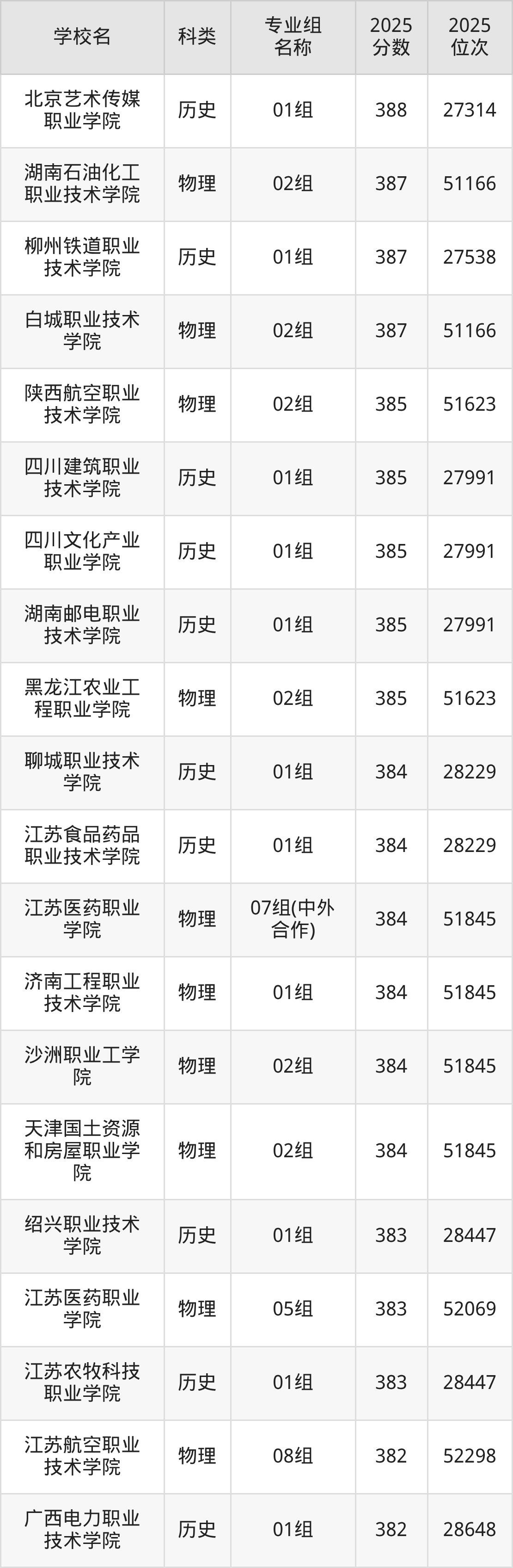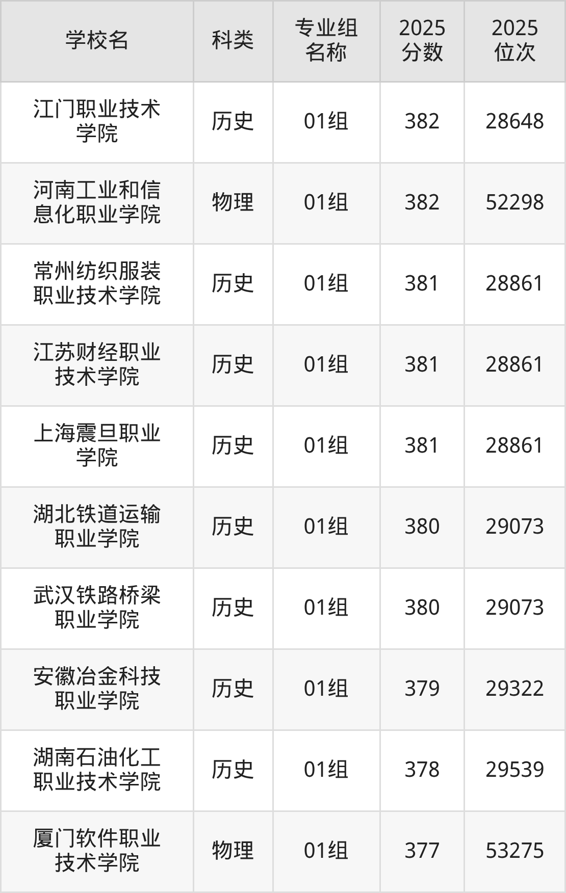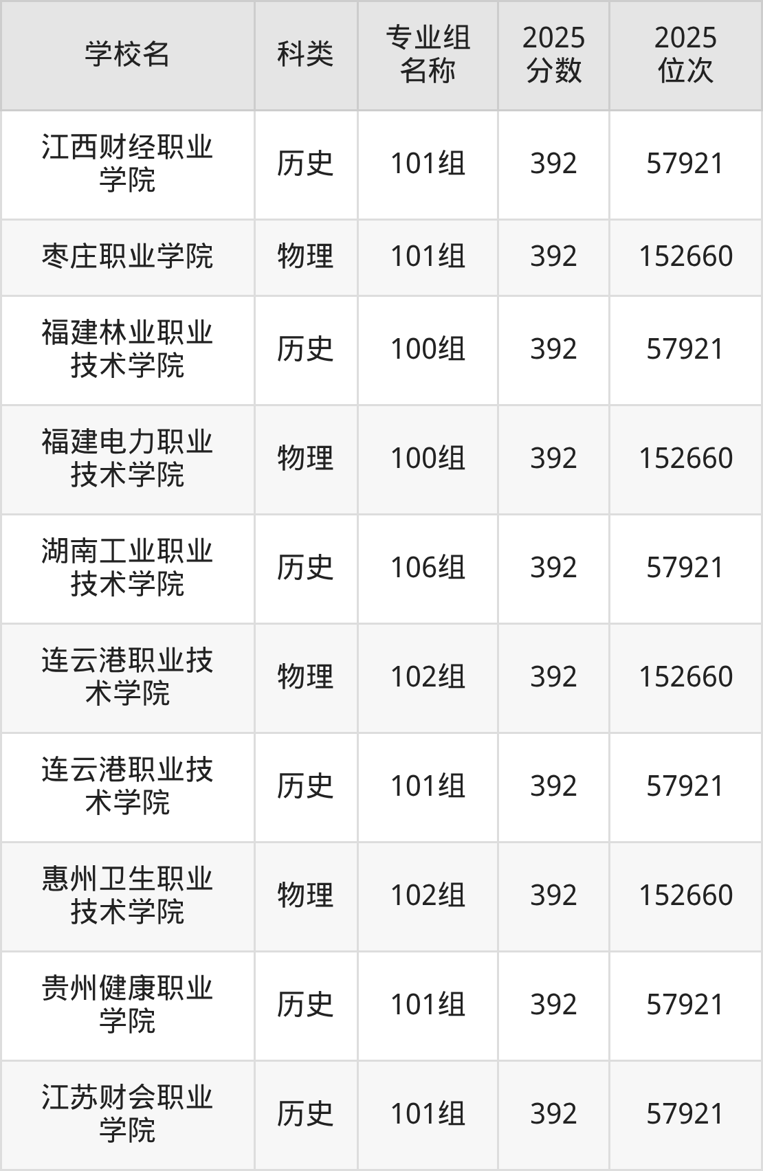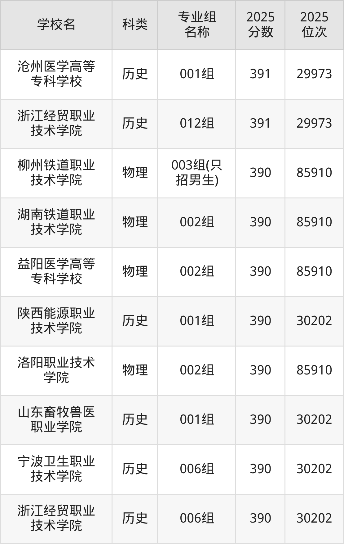除上述院校外,395分可上的公办专科学校还有昆明铁道职业技术学院(001组391分,位次85417名)、长沙职业技术学院(003组370分,位次95631名)。