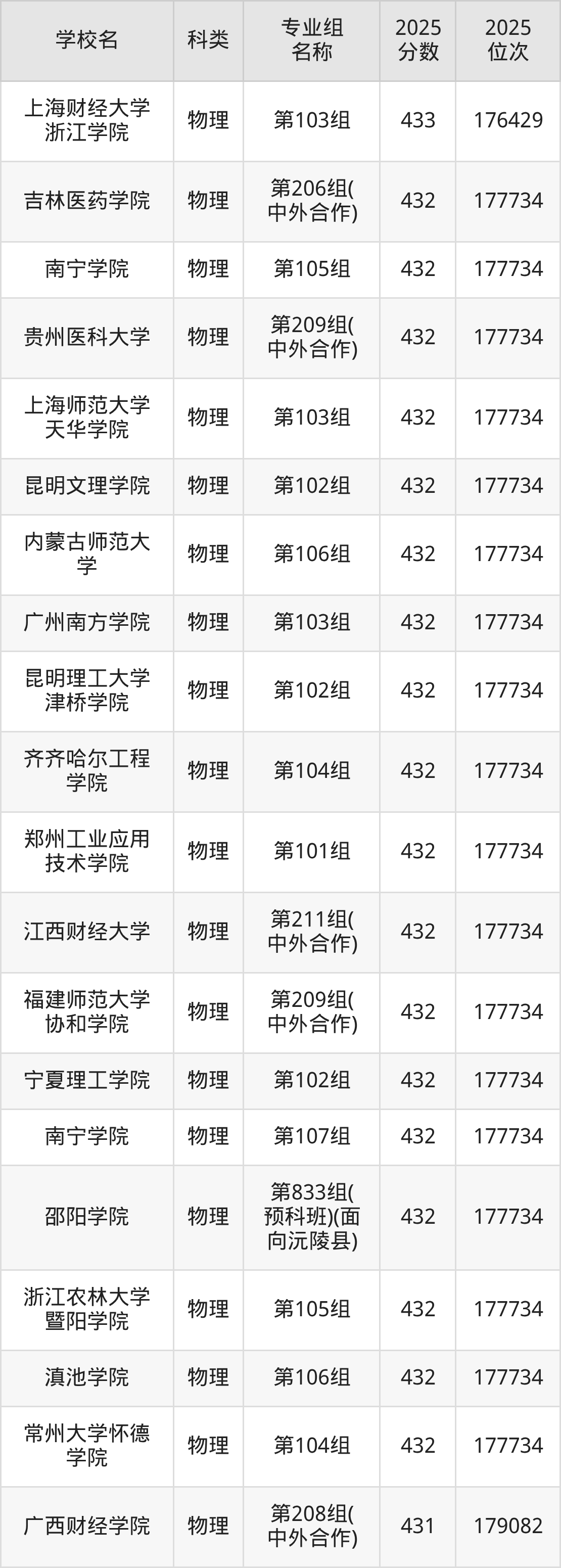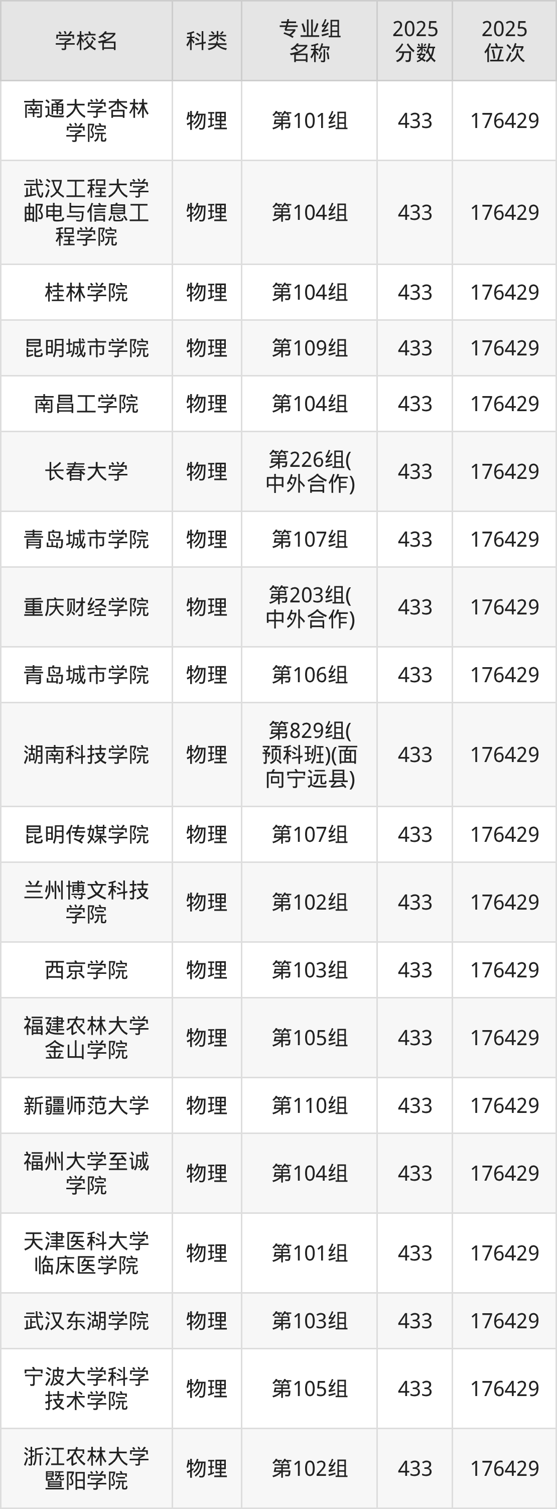 以湖南物理类为例,433分能上的本科大学有昆明城市学院(位次排名176429名)、武汉工程大学邮电与信息工程学院(位次排名176429名)、南宁理工学院(位次排名188046名)。