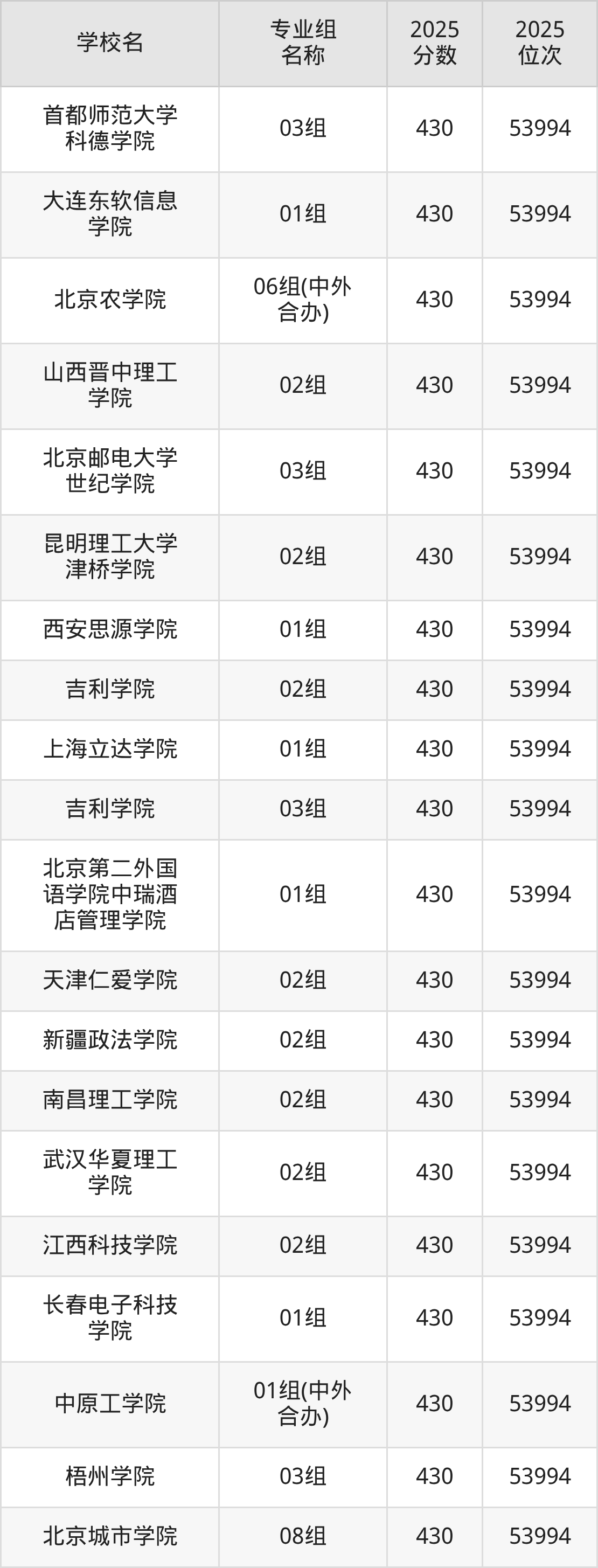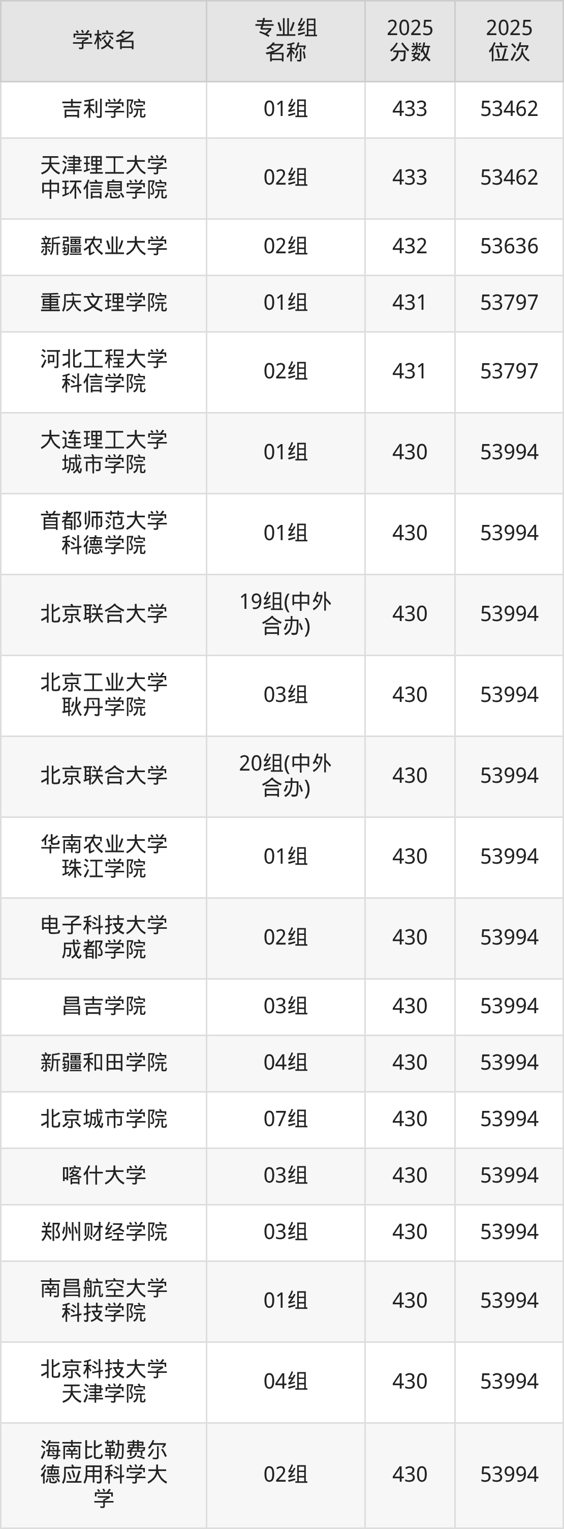 2025年北京本科线为430分,433分能上的本科大学共计46所,其中公办大学录取位次排名最低的是中原工学院(01组(中外合办)430分,位次53994名),即代表考生市排名位次在53994名及以内就可以报考公办本科。