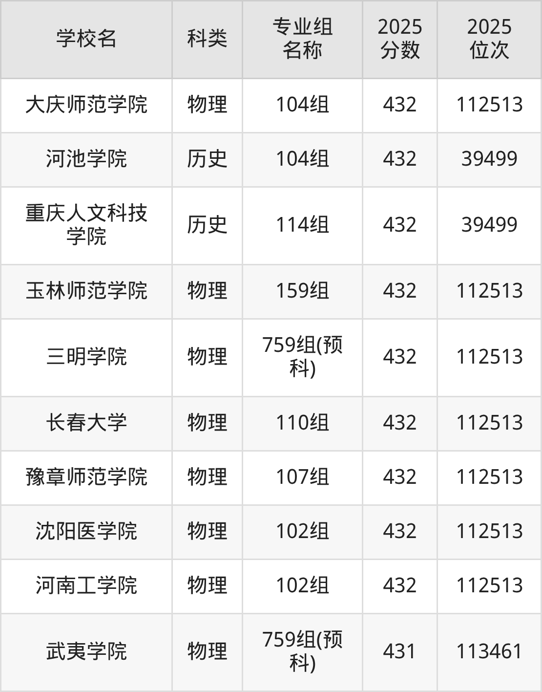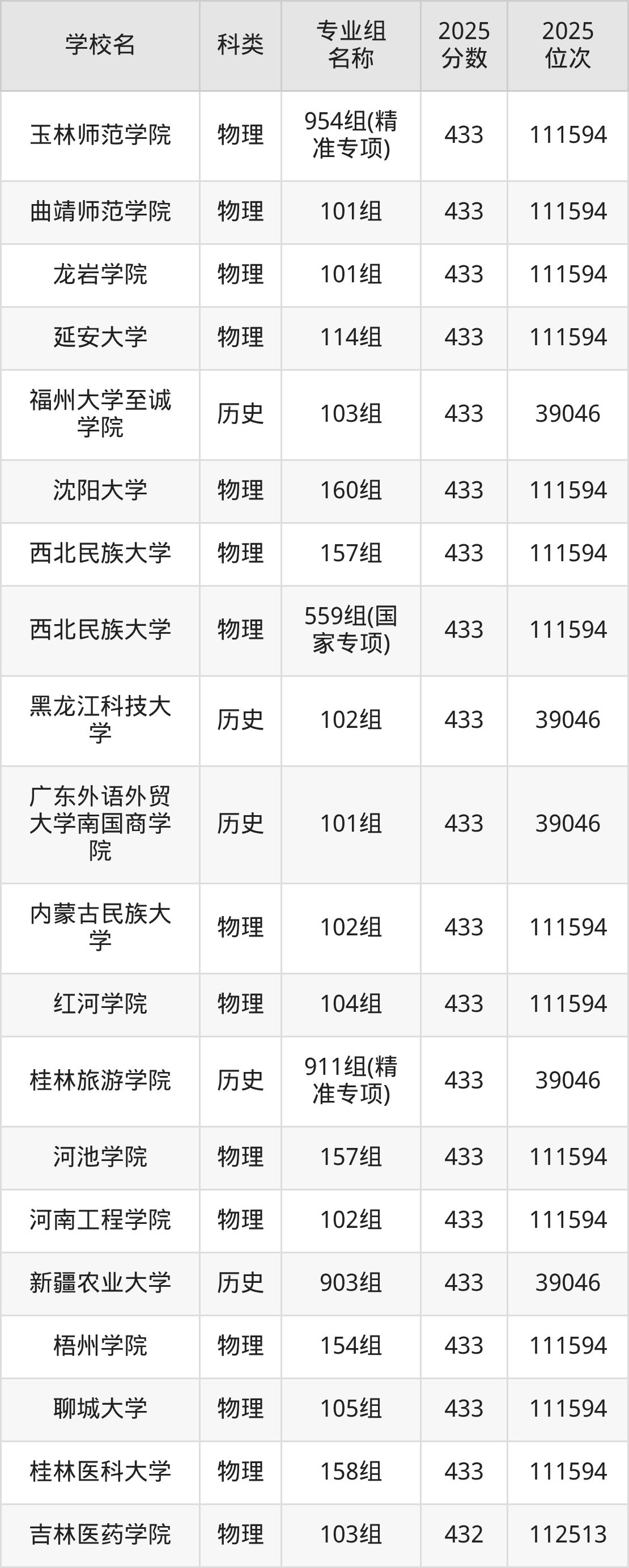 除上述院校外,433分可上的公办本科大学还有宁夏医科大学(105组426分,位次118418名)、玉林师范学院(158组426分,位次118418名)。