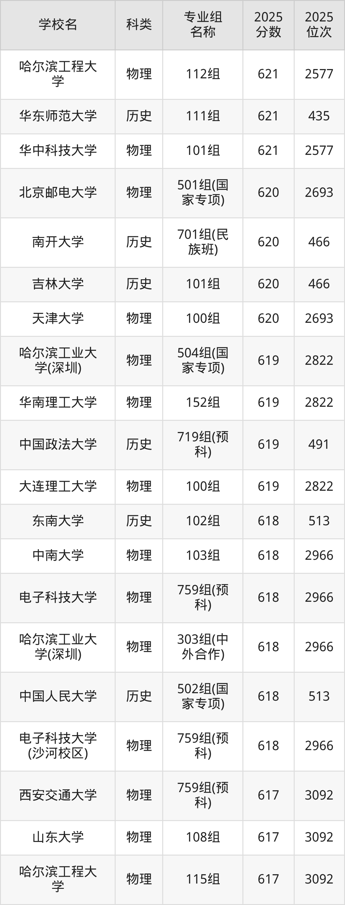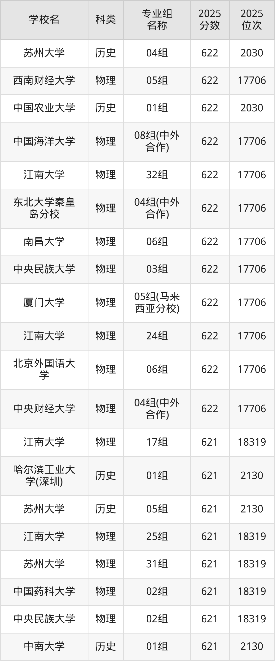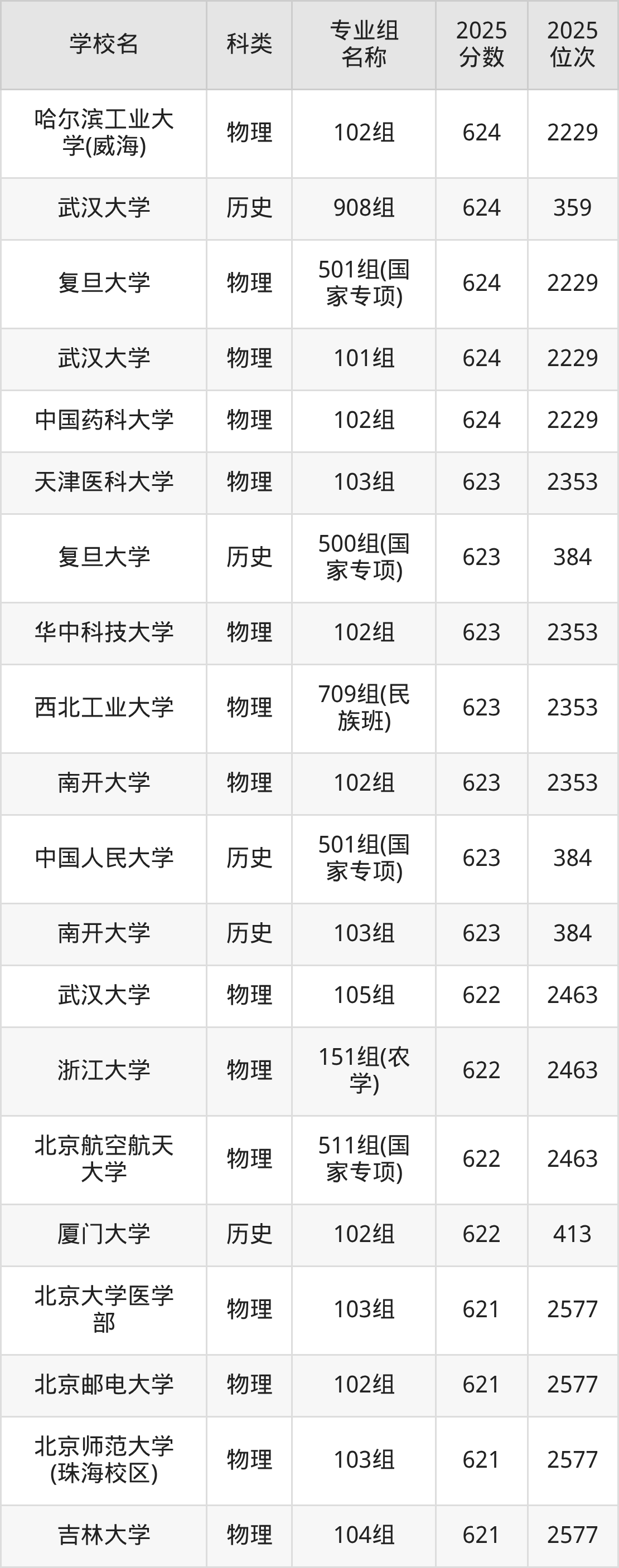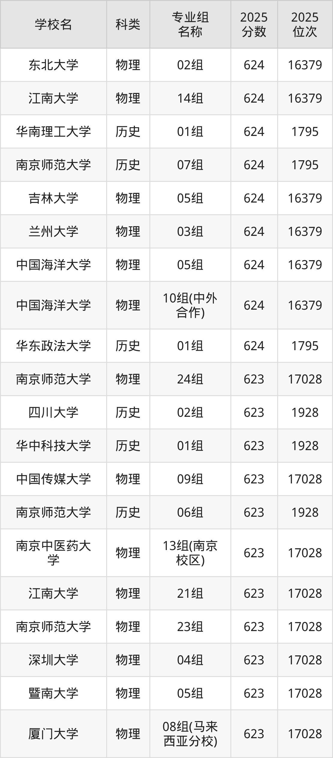 除上述院校外,624分可上的公办本科大学还有东北大学秦皇岛分校(103组591分,位次8452名)、合肥工业大学(104组566分,位次4042名)。