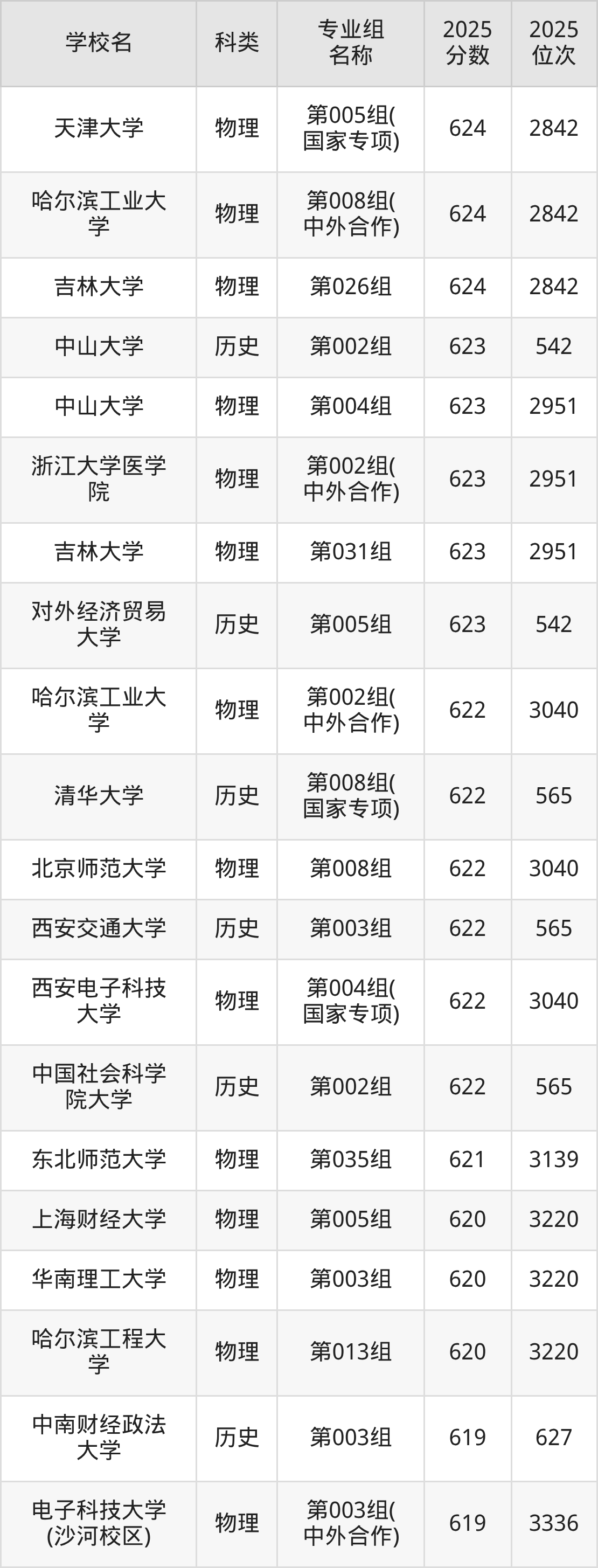 除上述院校外,624分可上的公办本科大学还有桂林旅游学院(911组(精准专项)433分,位次39046名)、上海外国语大学(503组(国家专项)559分,位次20174名)。