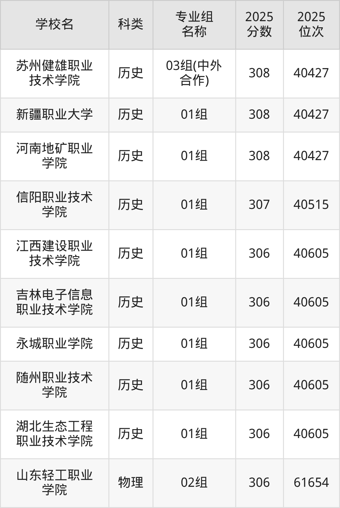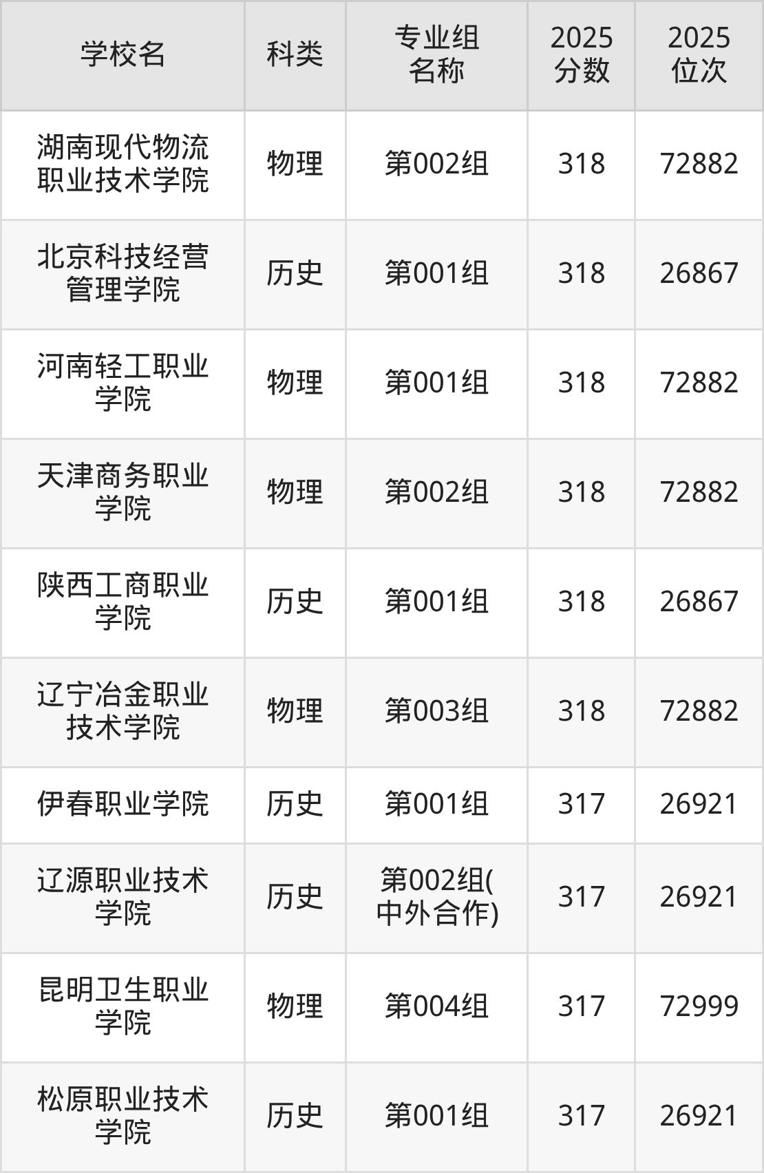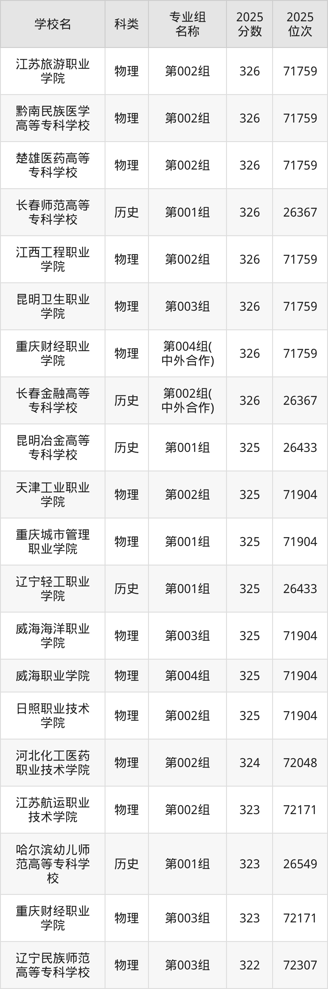 除上述院校外,326分可上的公办专科学校还有秦皇岛职业技术学院(01组294分,位次41728名)、江苏旅游职业学院(08组220分,位次66935名)。