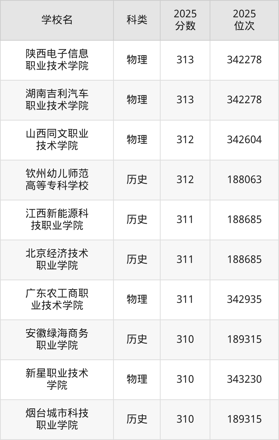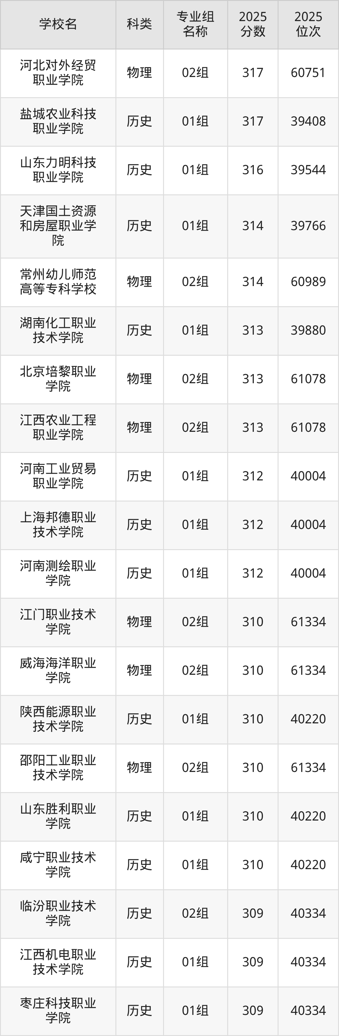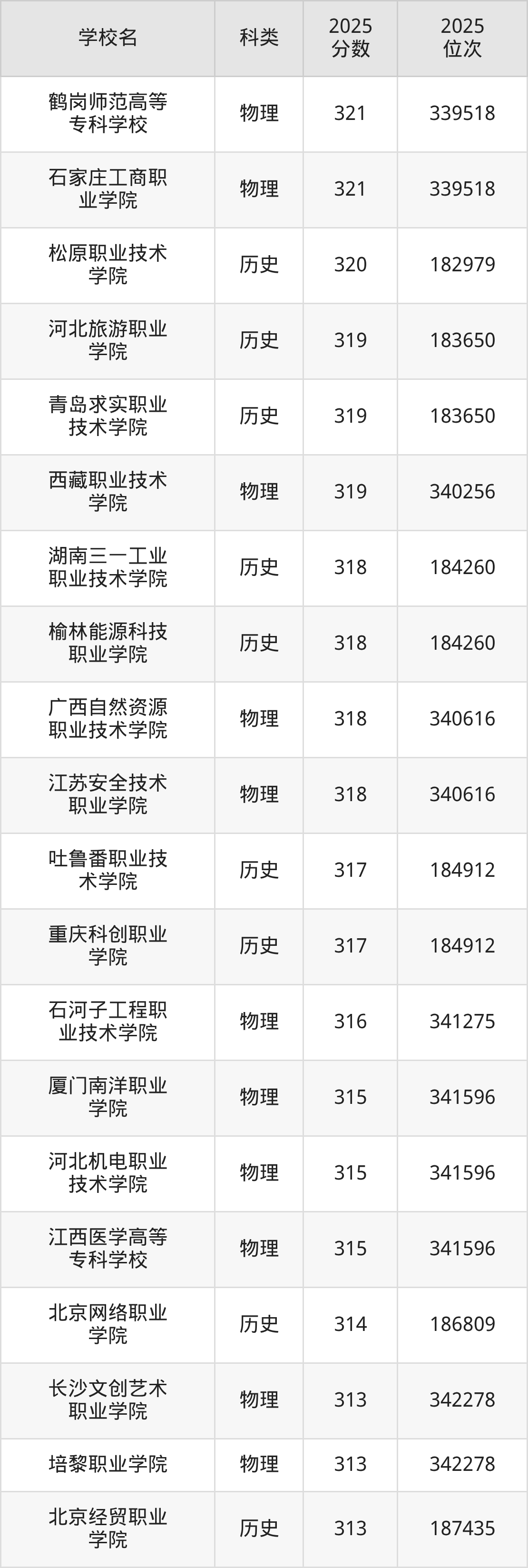 2025年河北物理类专科线为200分,326分能上的专科学校共计330所,其中公办大学录取位次排名最低的是石家庄职业技术学院(207分,位次361108名),即代表考生省排名位次在361108名及以内就可以报考公办专科。