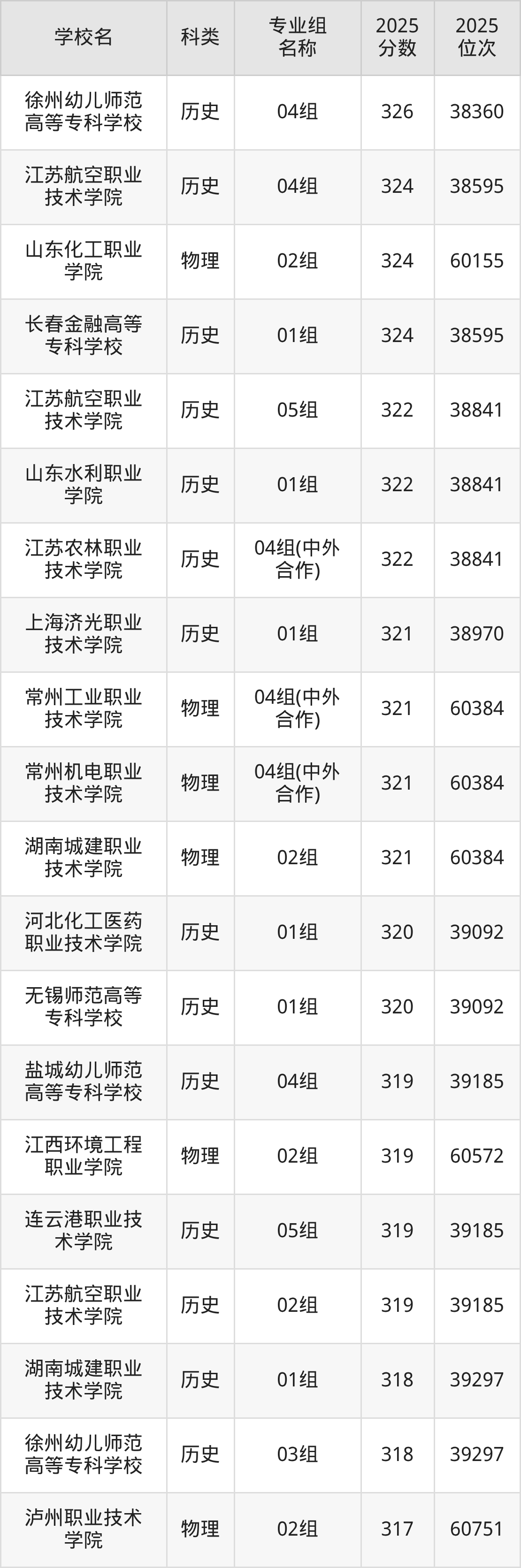 2025年江苏物理类专科线为220分,326分能上的专科学校共计223所,其中最低分公办院校为遵义职业技术学院(01组220分),对应最低位次为66935名。因此想上公办专科的考生省排名位次至少要在66935名以内。