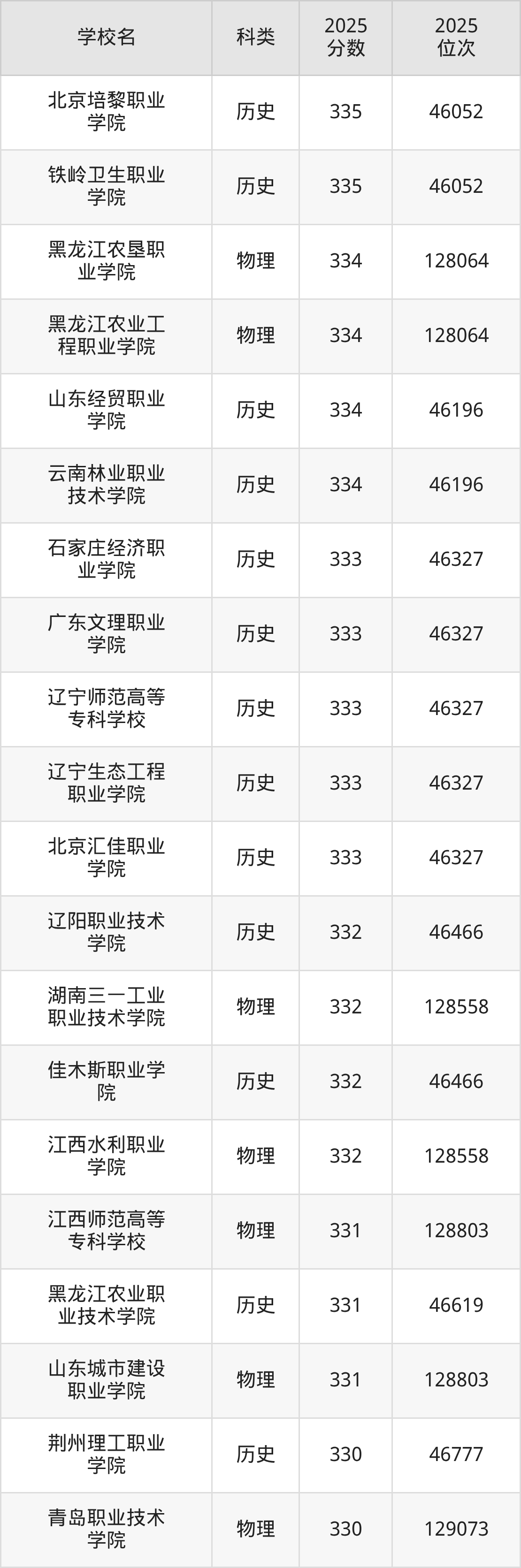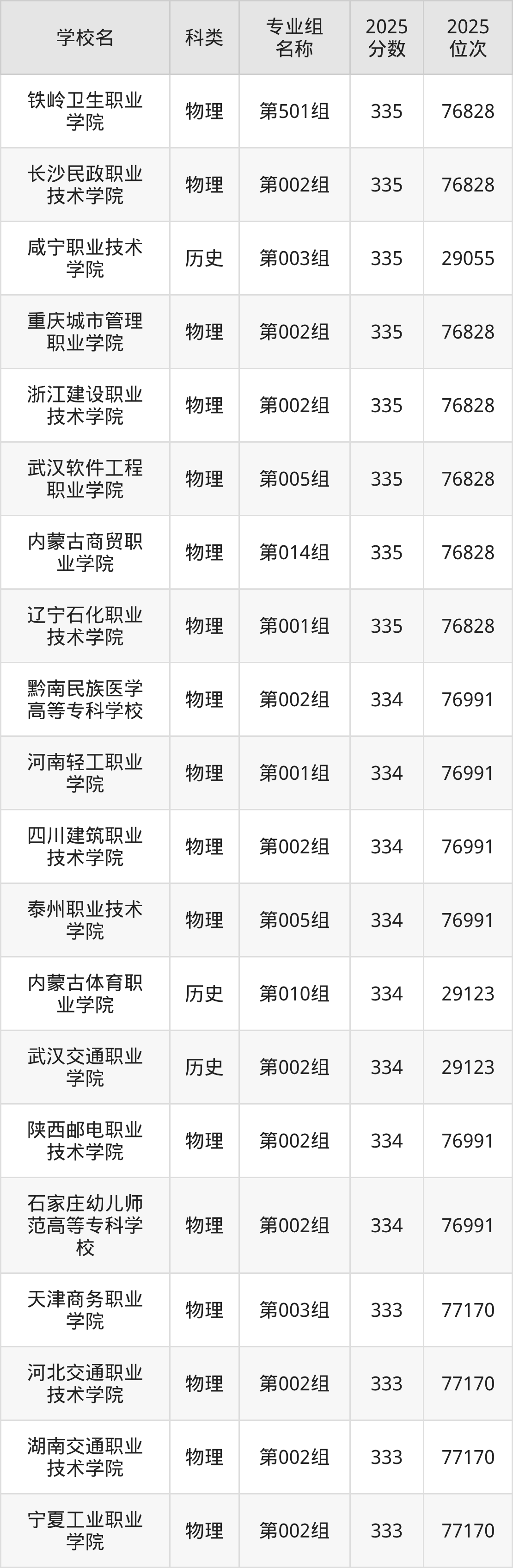 本文将收集各省335分能上的专科学校位次排名表(不含特殊招生计划、中外合作、分校区等),以供2026届考生参考。