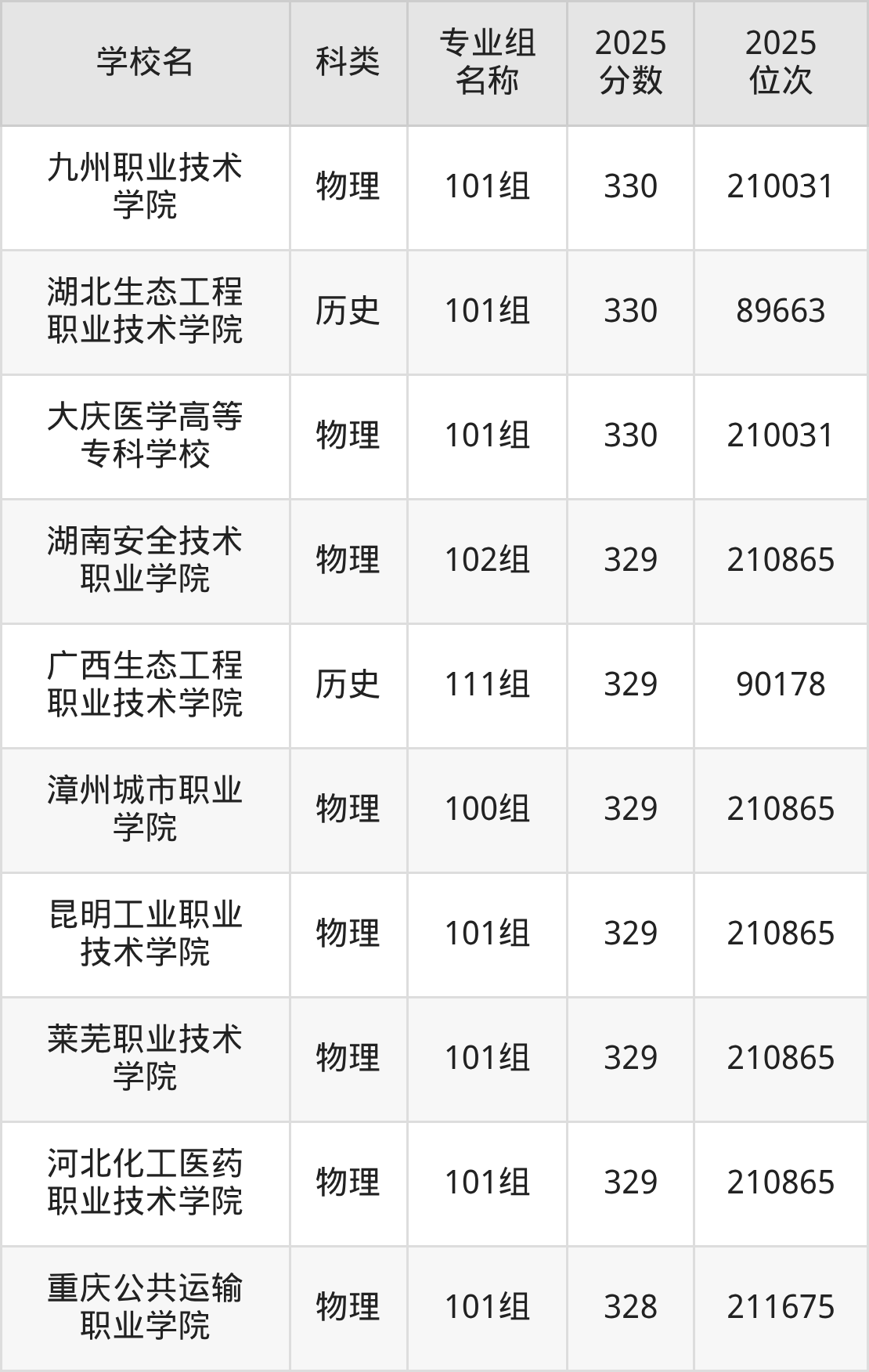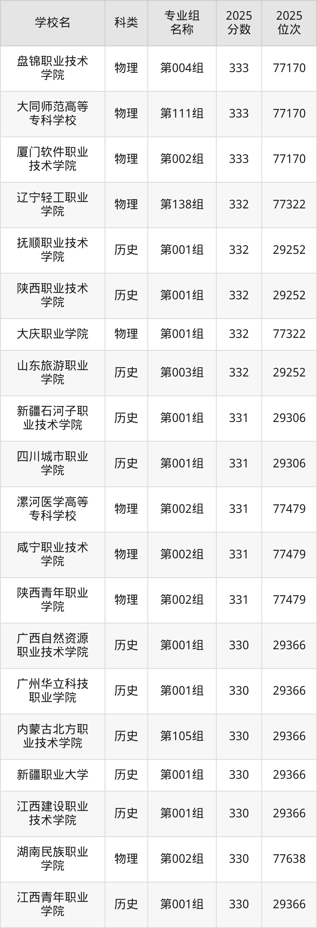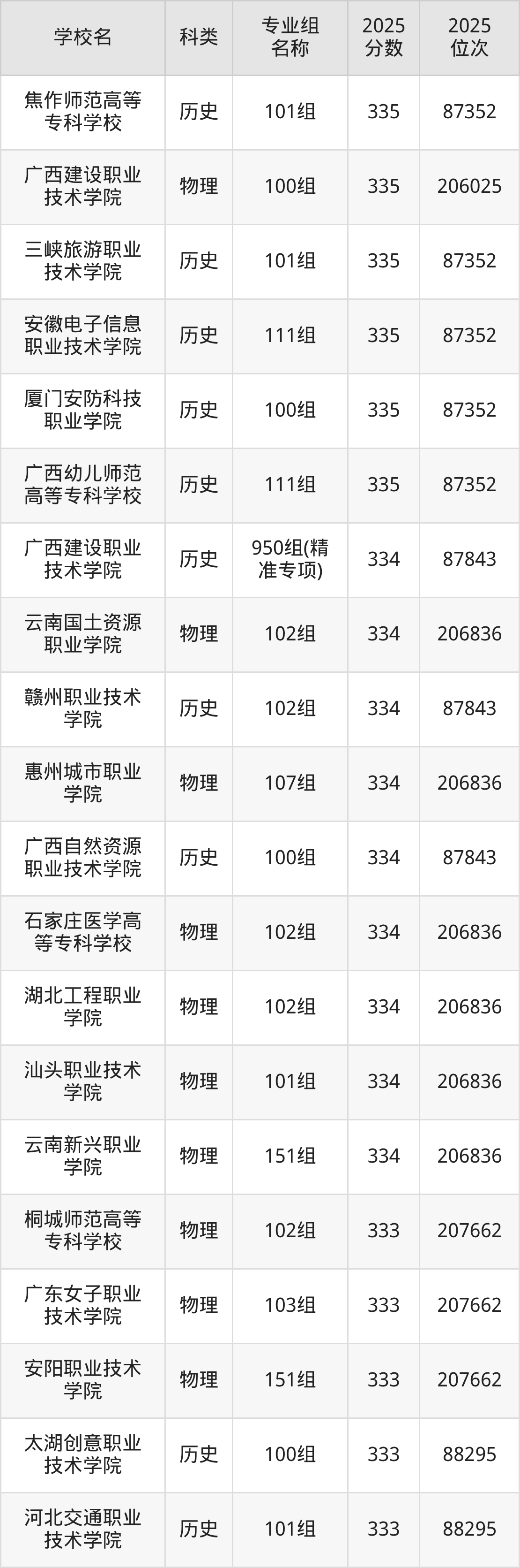 2025年广西物理类专科线为200分,335分能上的专科学校共计410所,其中公办大学录取位次排名最低的是阜新高等专科学校(101组204分,位次260025名),即代表考生壮族自治区排名位次在260025名及以内就可以报考公办专科。