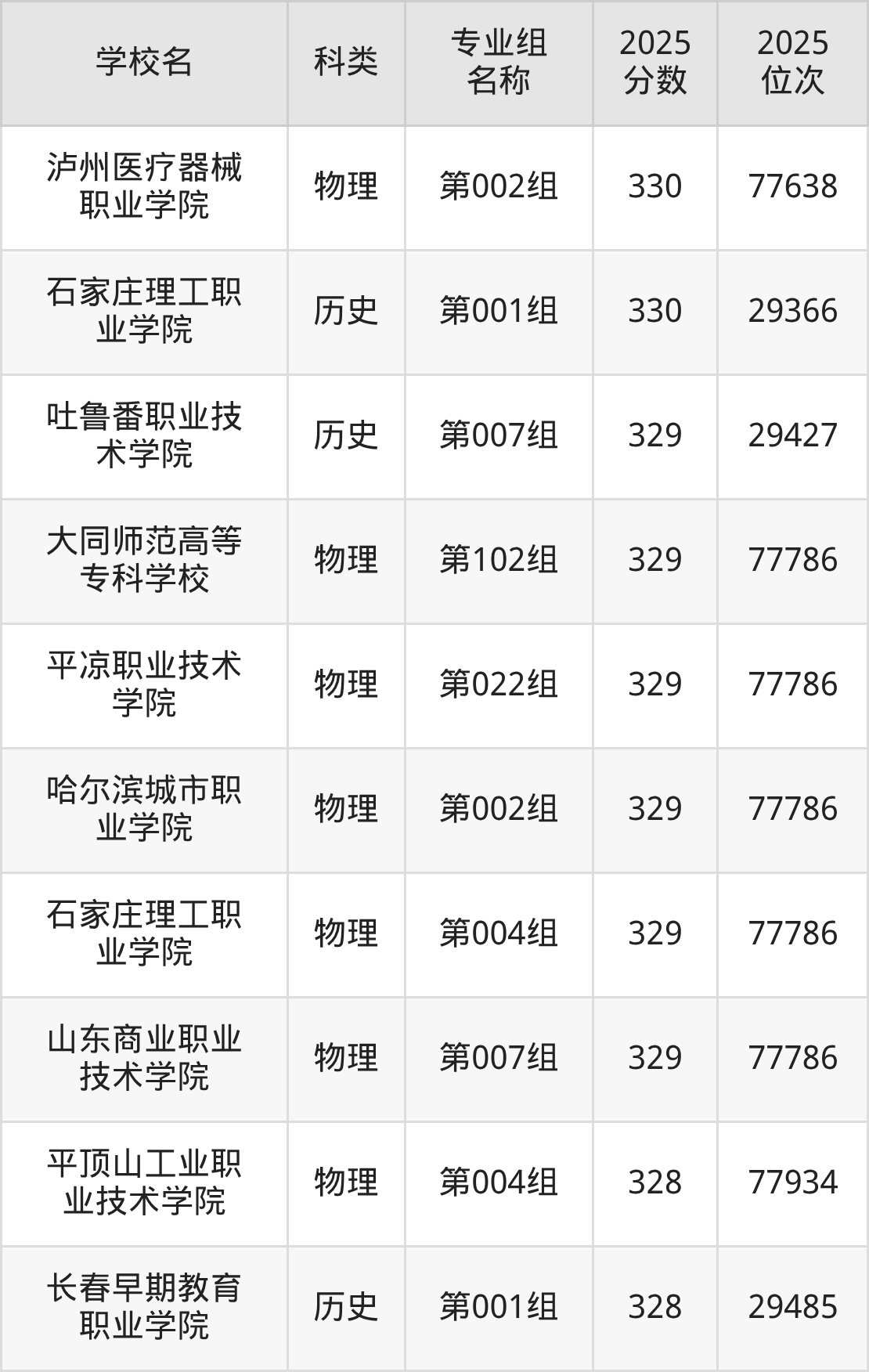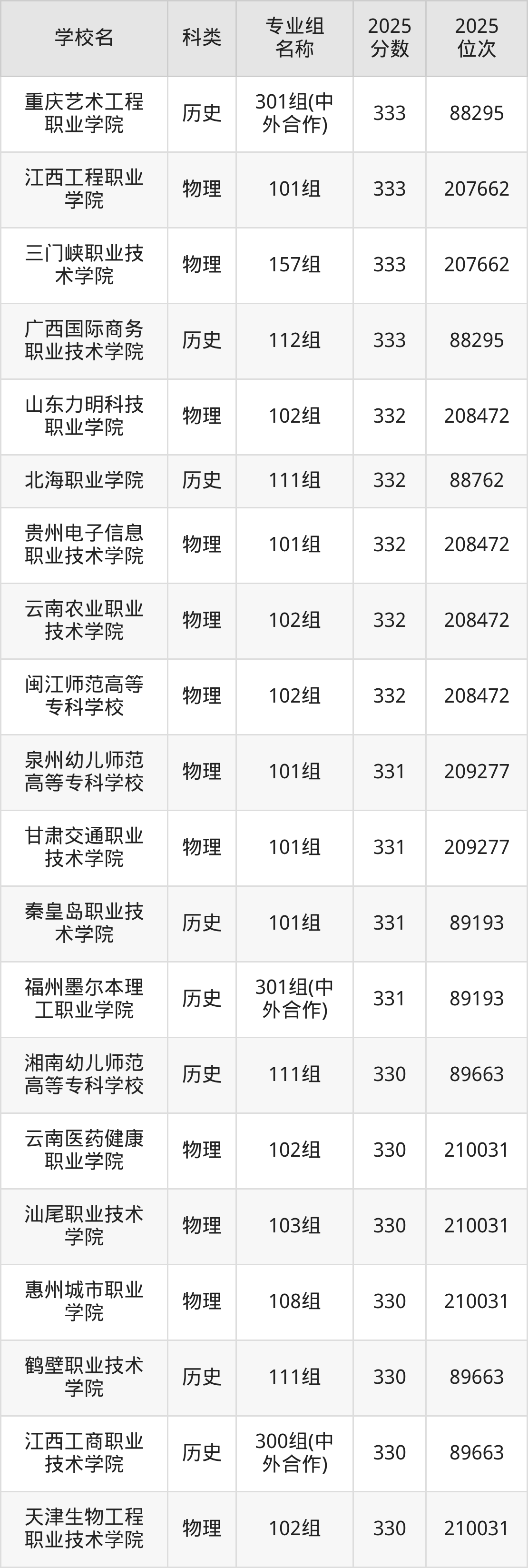 除上述院校外,335分可上的公办专科学校还有哈尔滨科学技术职业学院(273分,位次138912名)、烟台工程职业技术学院(322分,位次130971名)。