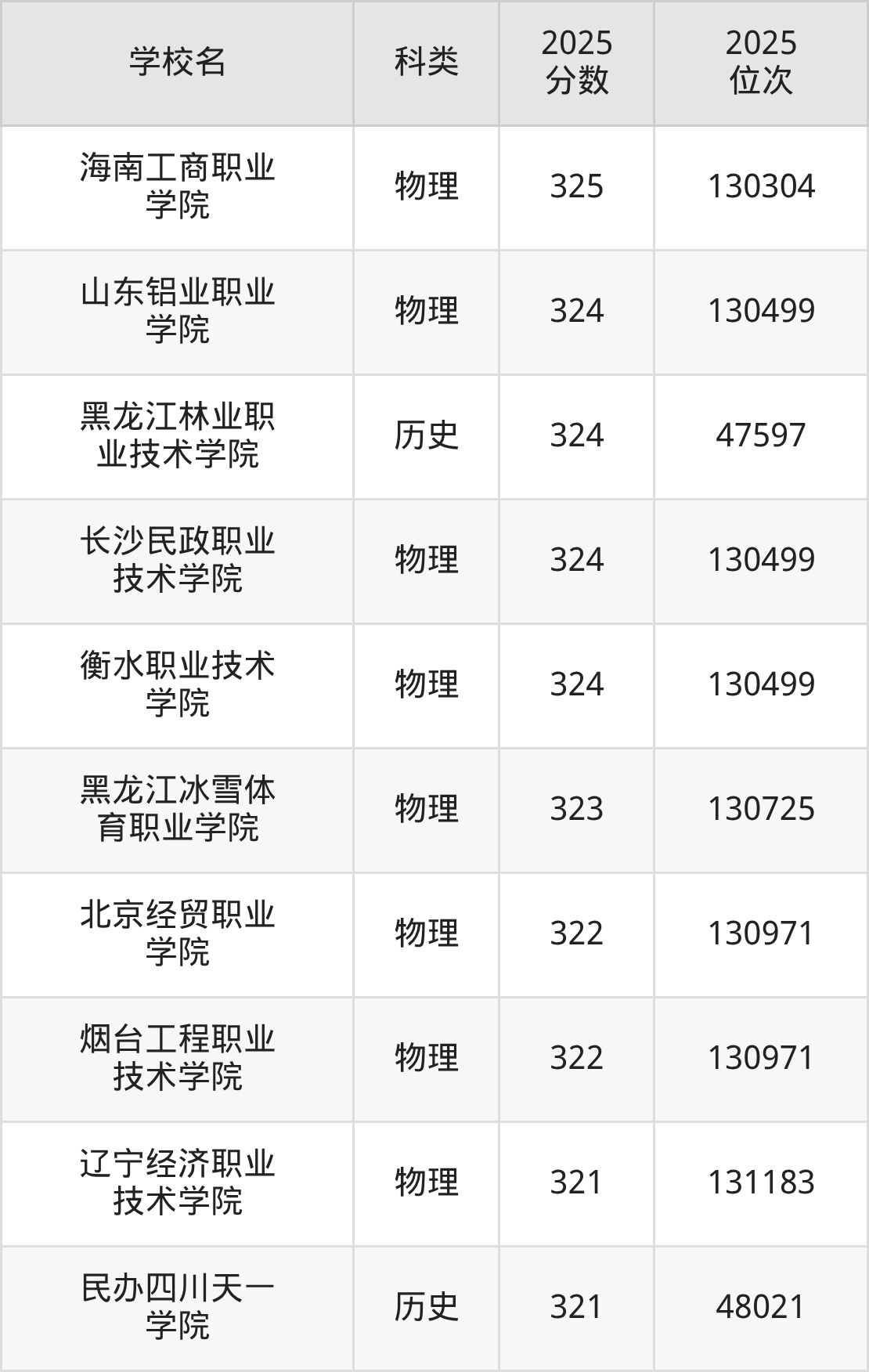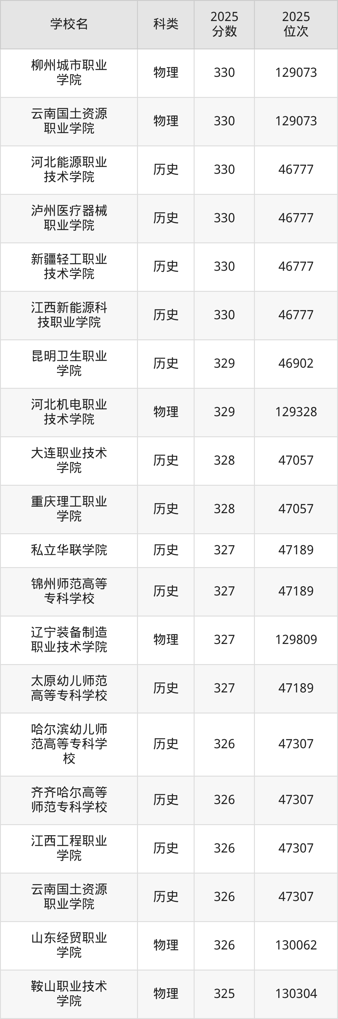 除上述院校外,335分可上的公办专科学校还有辽阳职业技术学院(332分,位次46466名)、黑龙江旅游职业技术学院(274分,位次138794名)。