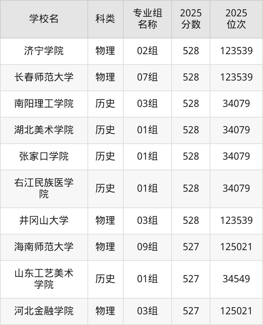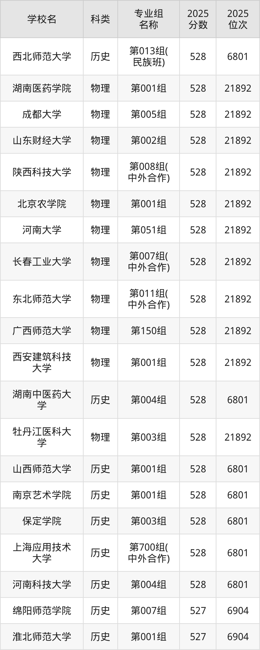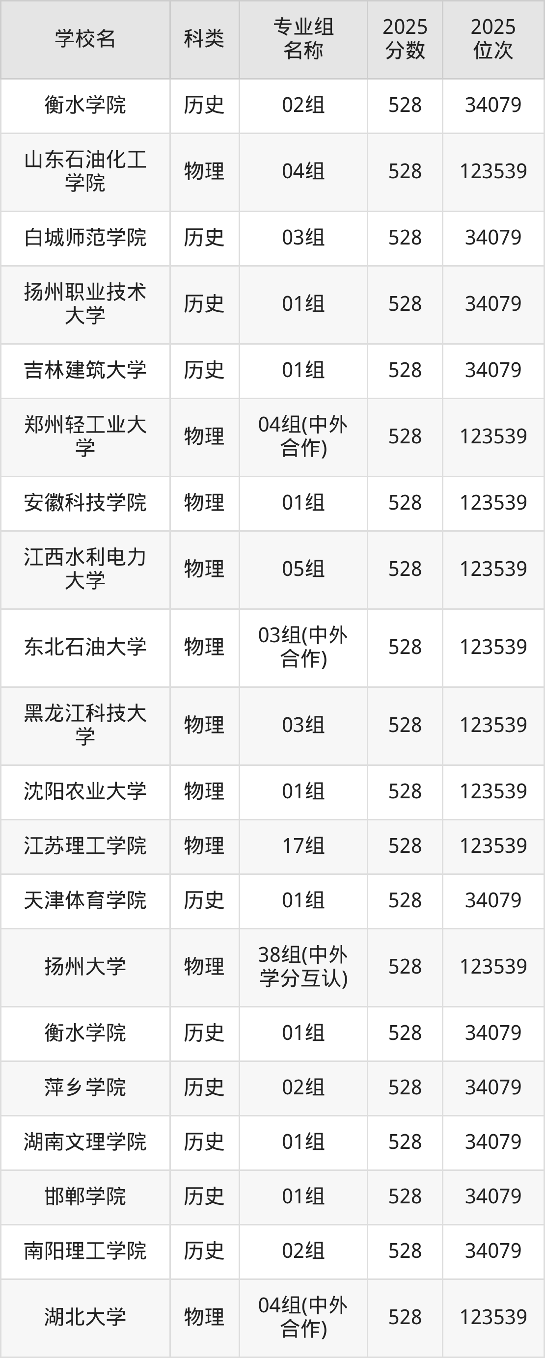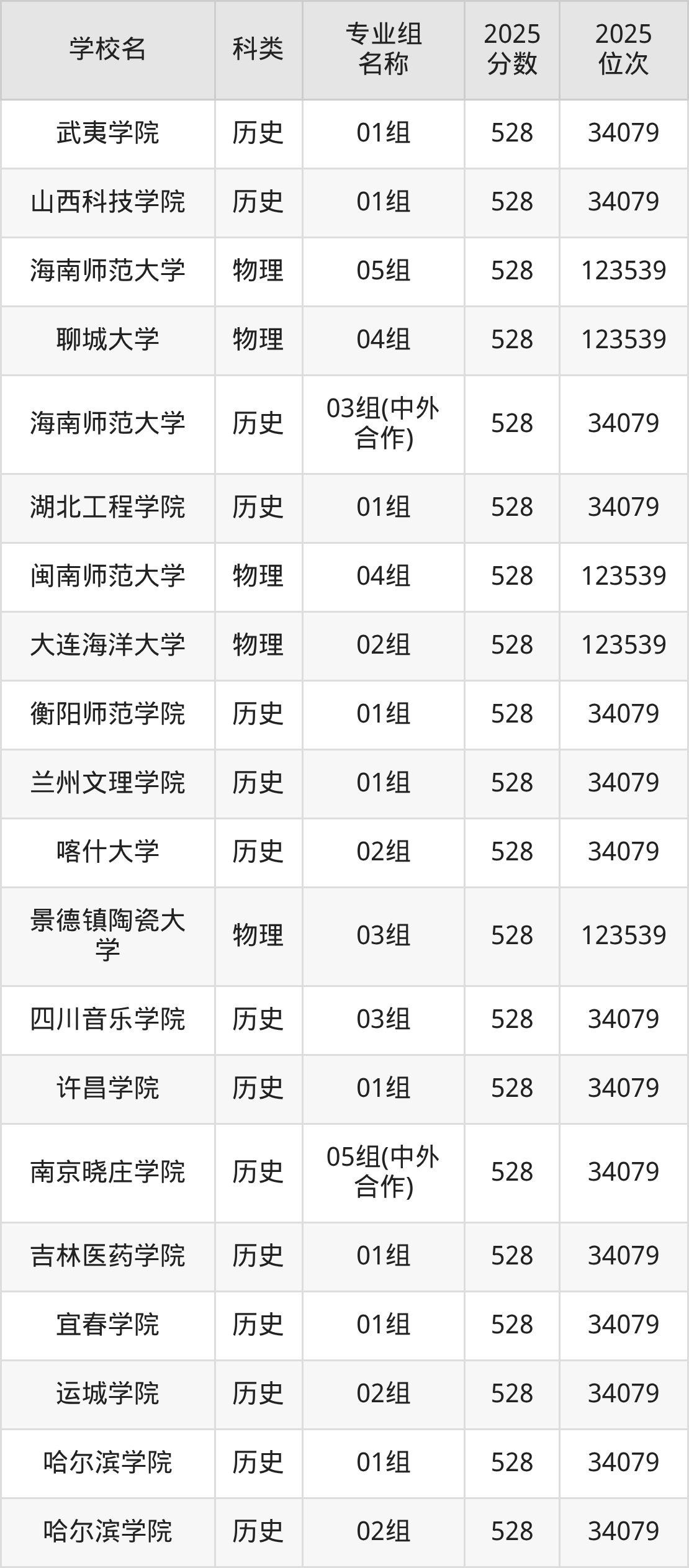 以内蒙古历史类为例,528分能上的本科大学有湖北文理学院(位次排名13438名)、合肥大学(位次排名7312名)、吉林外国语大学(位次排名17309名)。