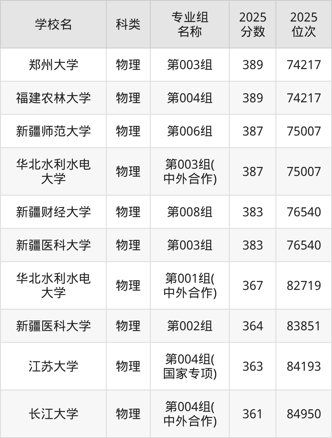 以黑龙江物理类为例,390分能上的一本大学有郑州大学(位次排名74217名)、新疆师范大学(位次排名75007名)、华北水利水电大学(位次排名75007名)。
