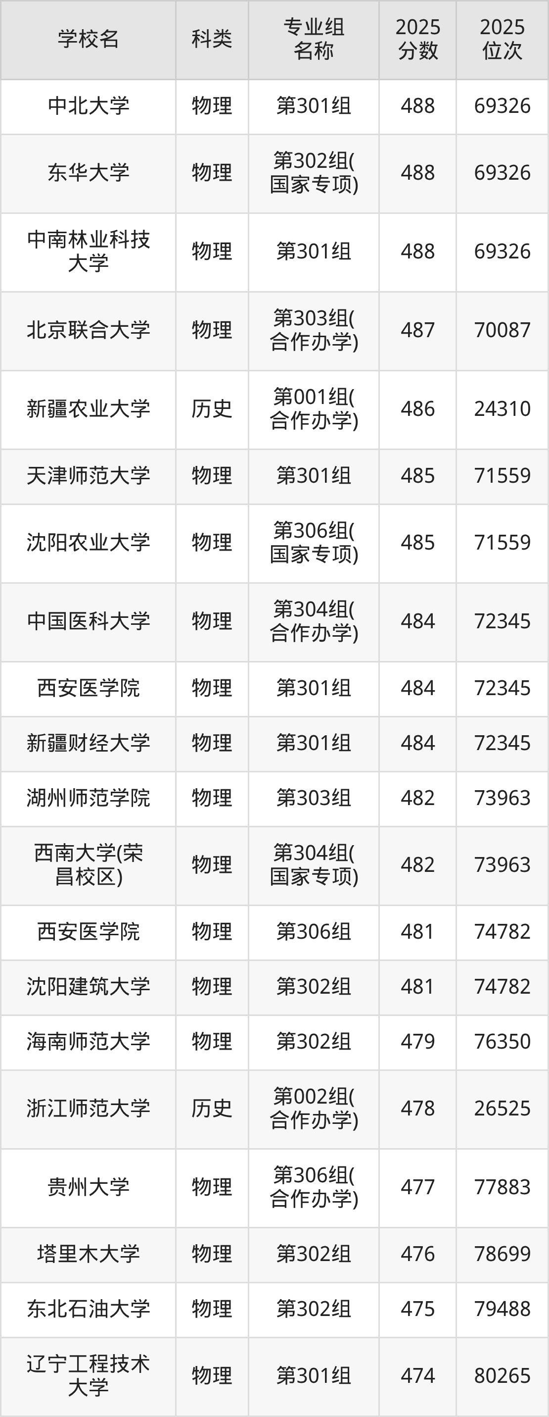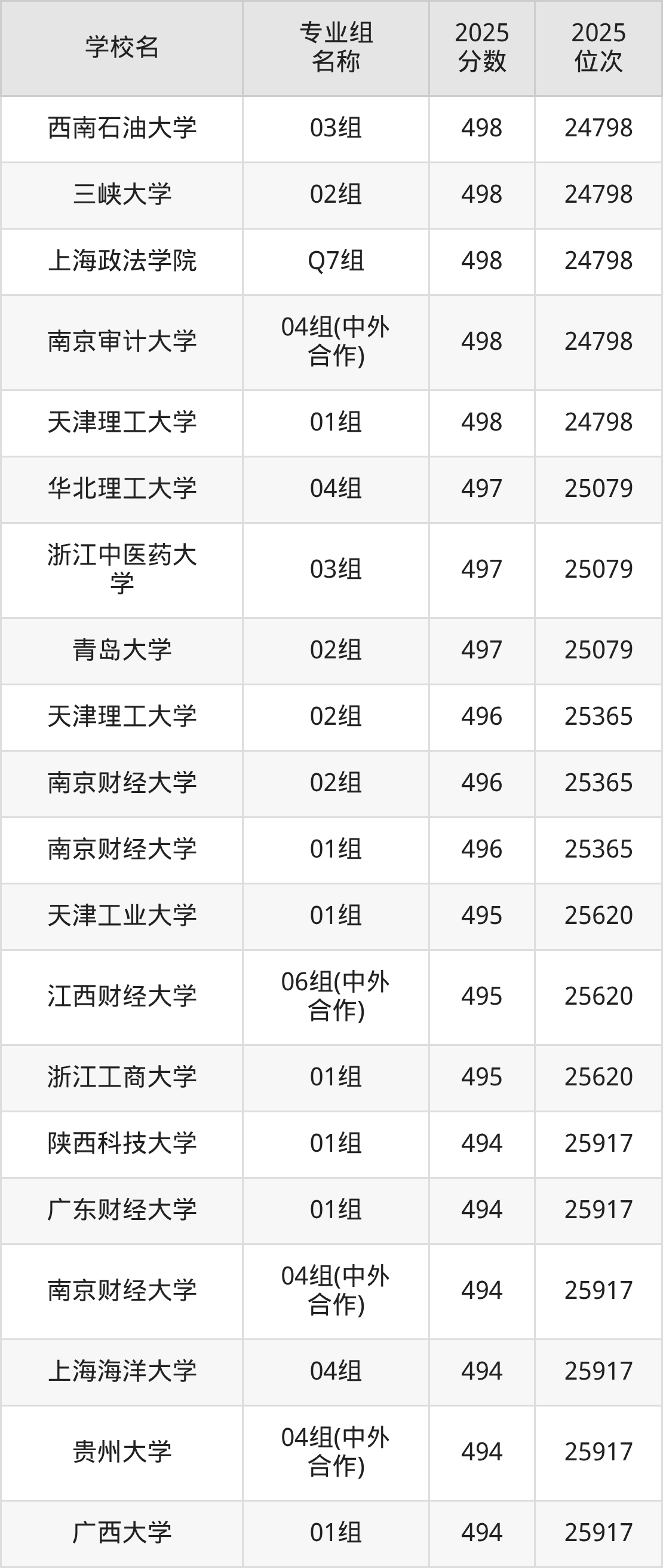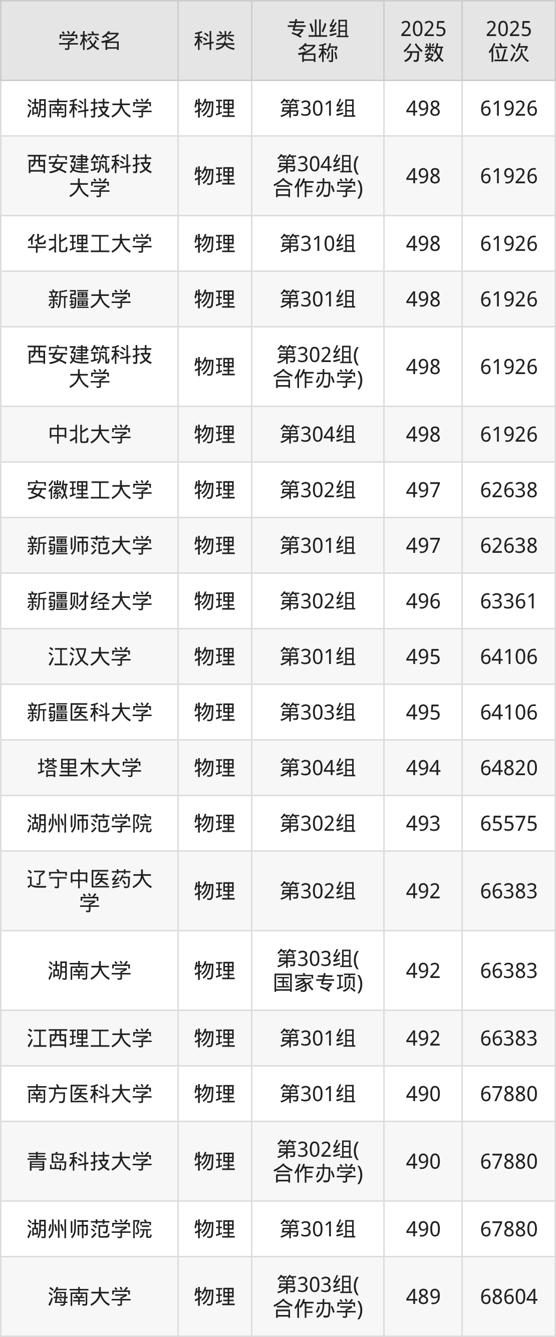 以山西物理类为例,498分能上的一本大学有新疆农业大学(位次排名95956名)、塔里木大学(位次排名64820名)、湖南大学(位次排名66383名)。