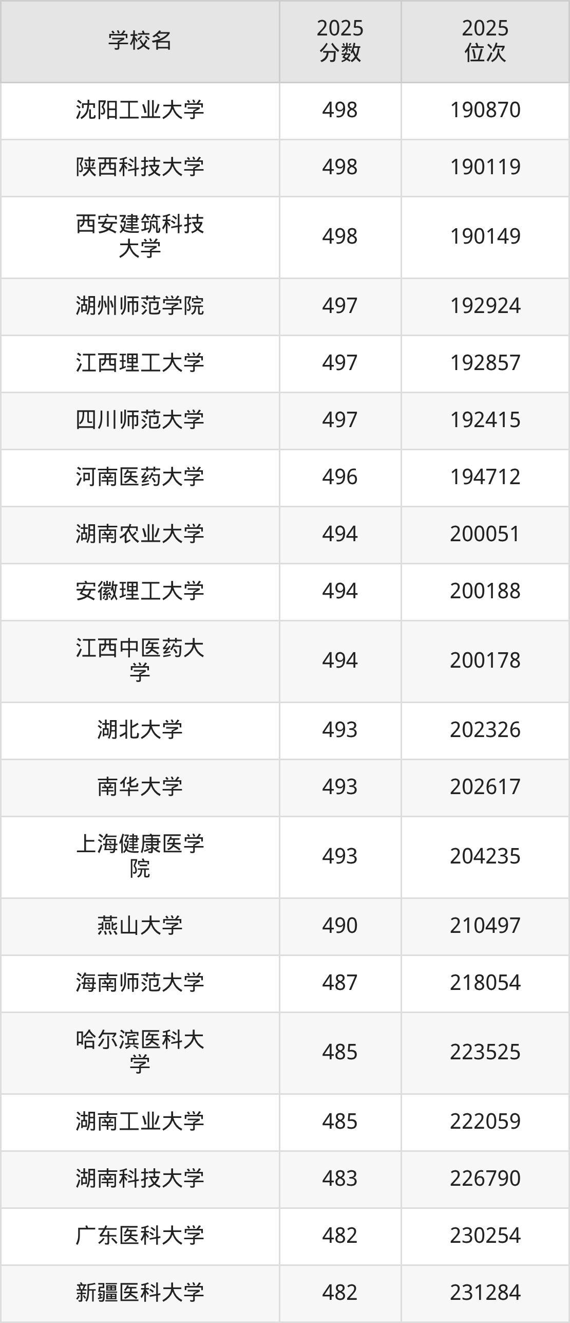 除上述院校外,498分可上的公办一本大学还有河南医药大学(496分,位次194712名)、上海健康医学院(493分,位次204235名)。
