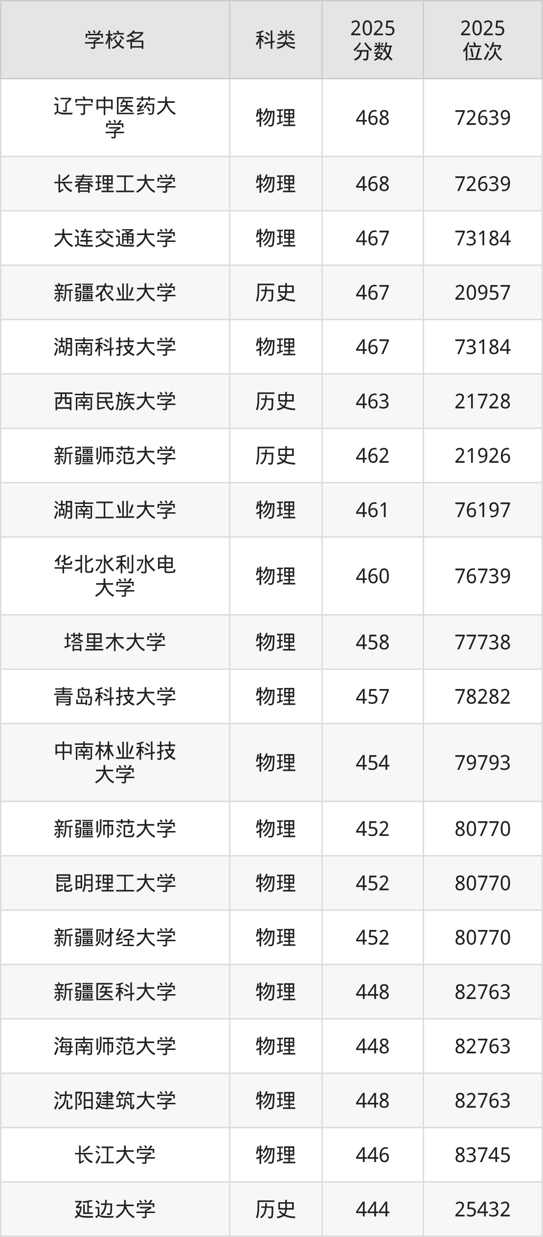 以辽宁物理类为例,468分能上的一本大学有青岛科技大学(位次排名78282名)、中南林业科技大学(位次排名79793名)、昆明理工大学(位次排名80770名)。