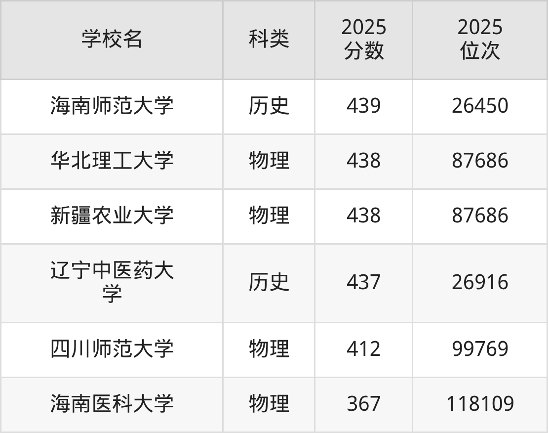 录取位次排名较低的公办一本大学还有新疆农业大学(位次87686名)、华北理工大学(位次87686名)、海南师范大学(位次26450名)等,适合省排名在2.6万名开外的本科生报考。