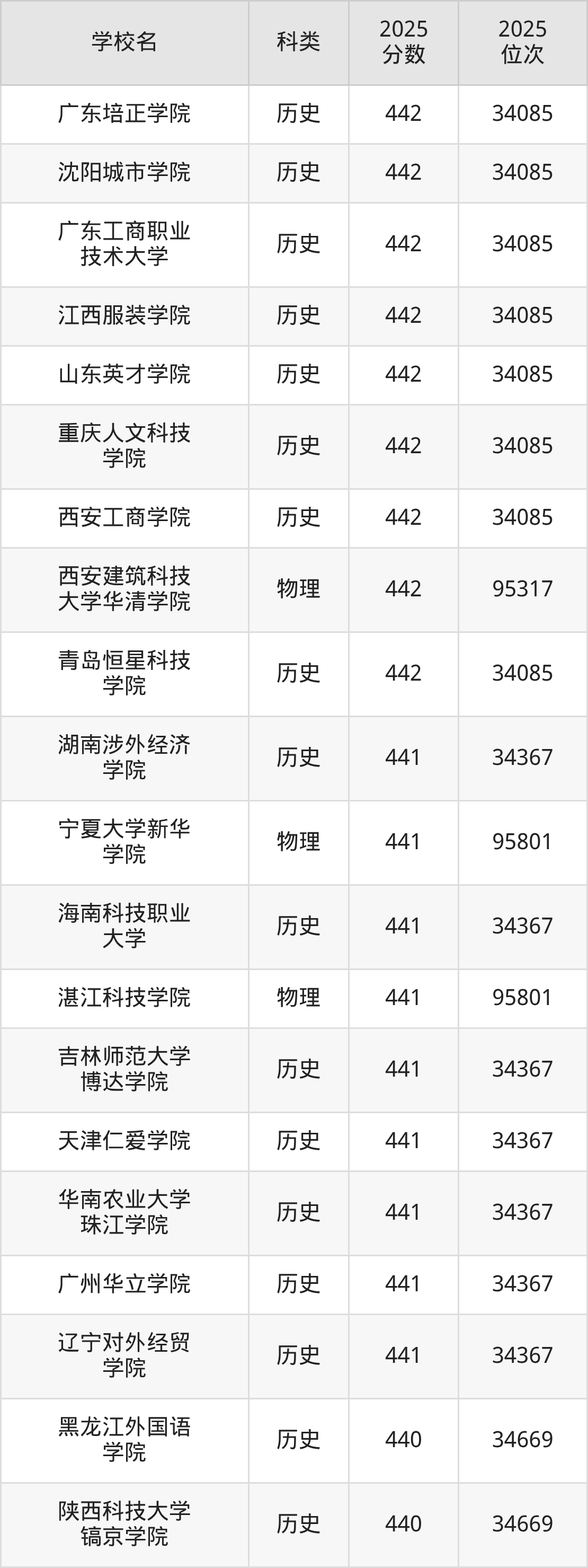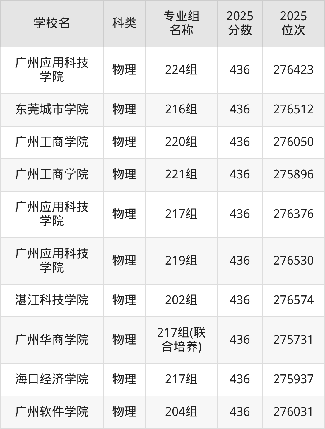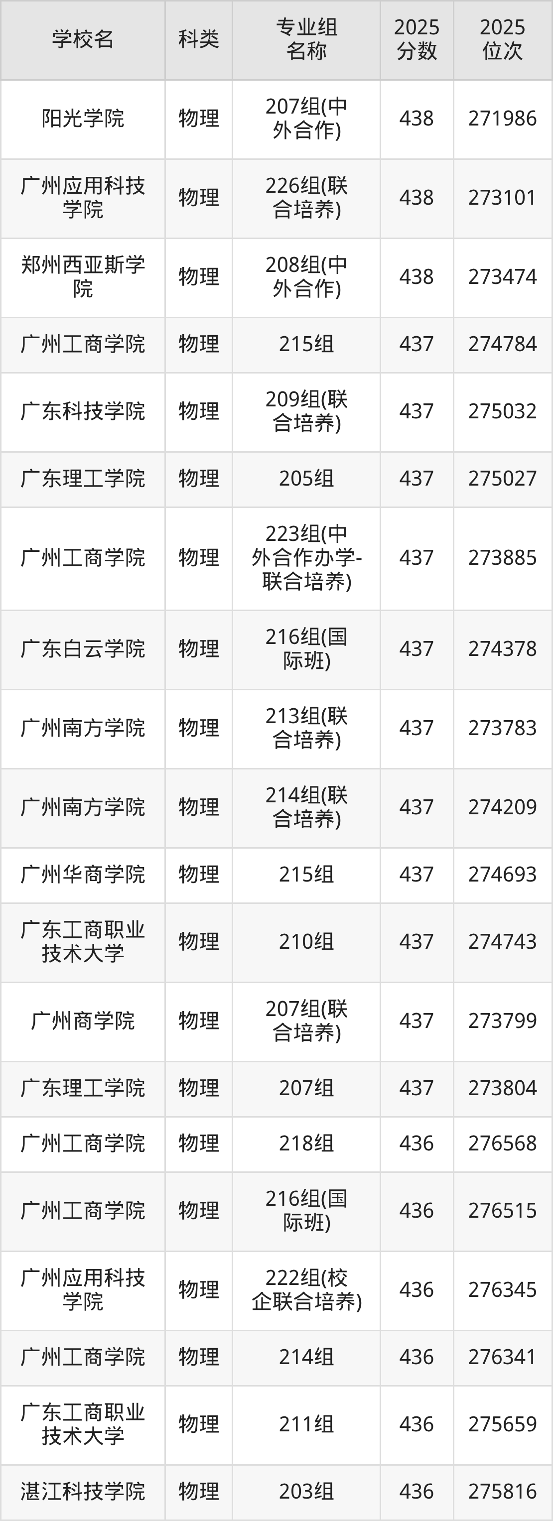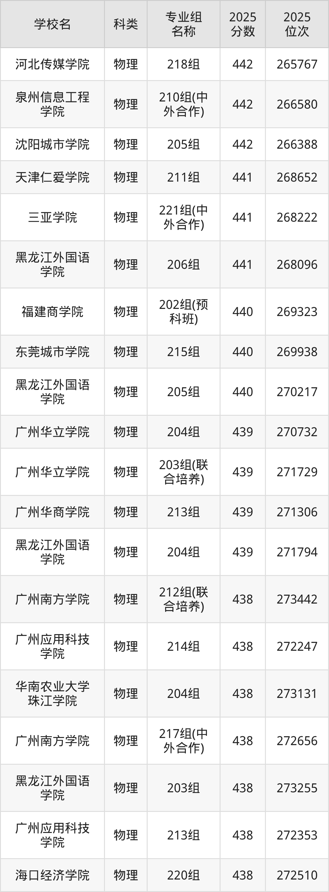 2025年广东物理类本科线为436分,442分能上的本科大学共计30所,其中公办大学录取位次排名最低的是福建商学院(202组(预科班)440分),其2025最低位次为269323名。